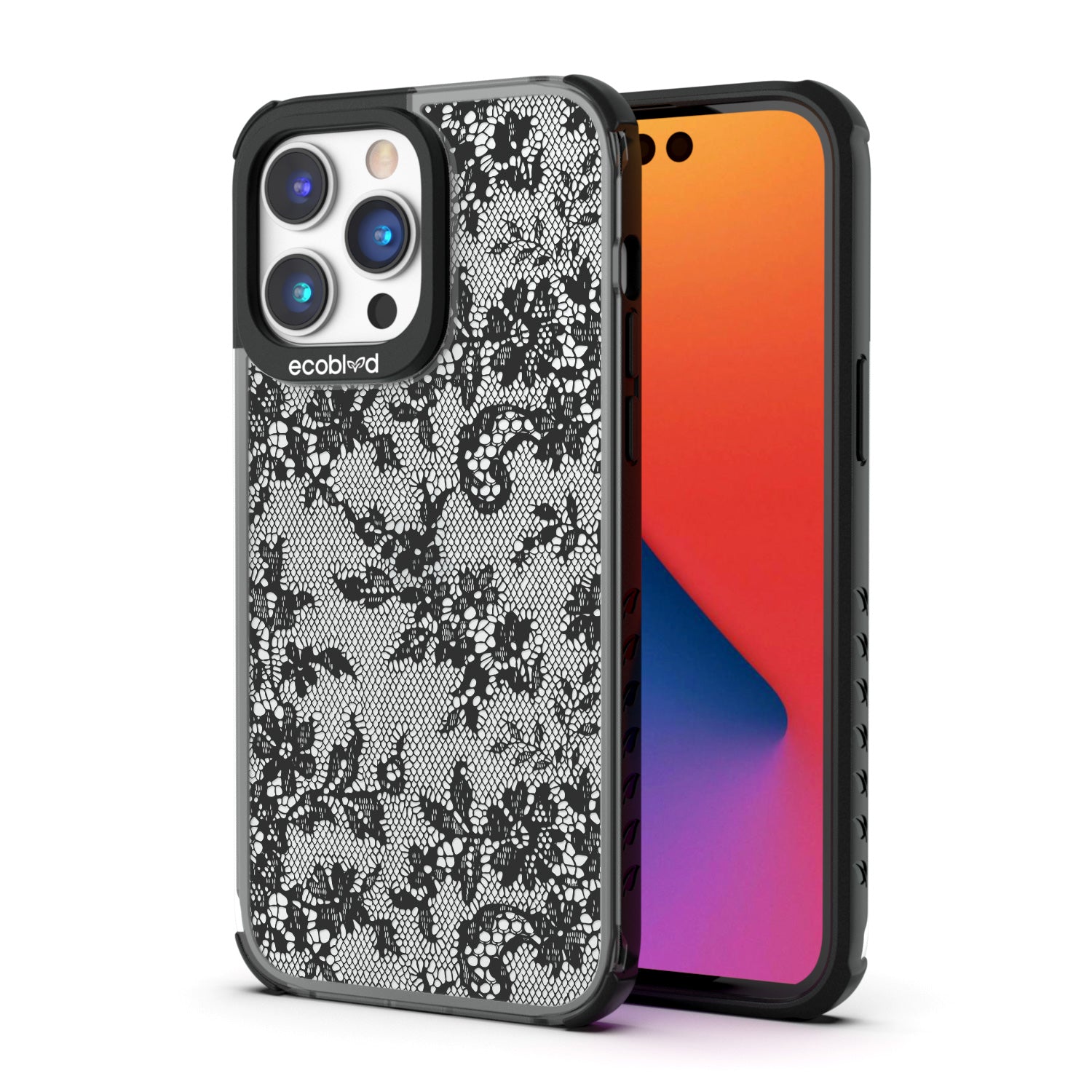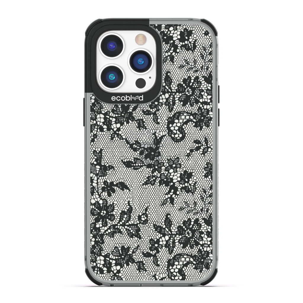 Like a lace-up corset, the Lace Me Up design on our Laguna clear iPhone 14 Pro phone case cinches your phone in all the right places, adding a touch of sophistication and refinement in a French chantilly trim in Midnight Black.