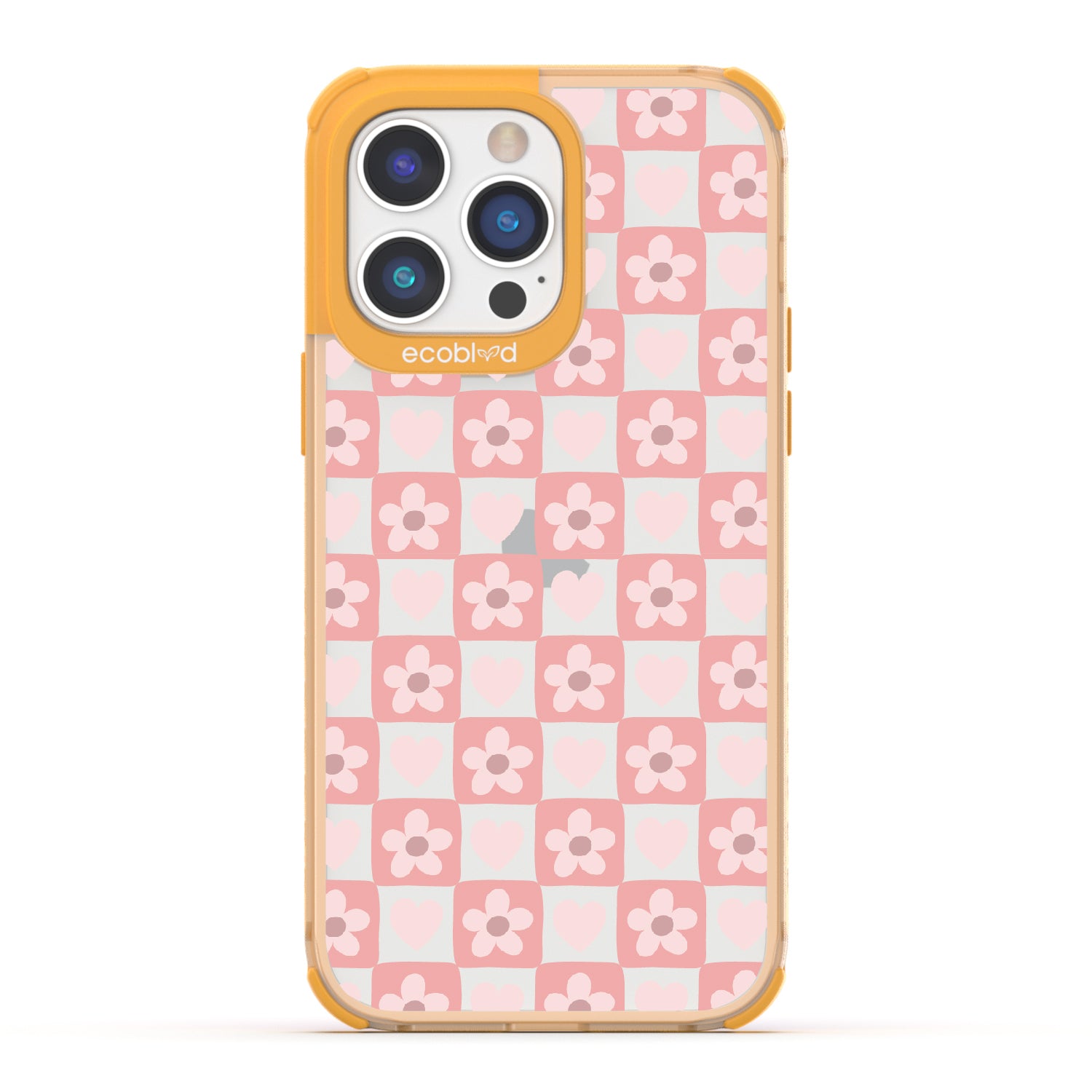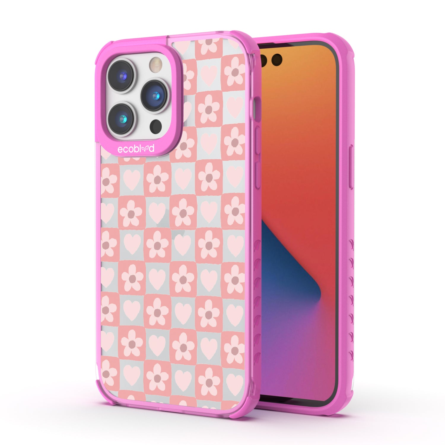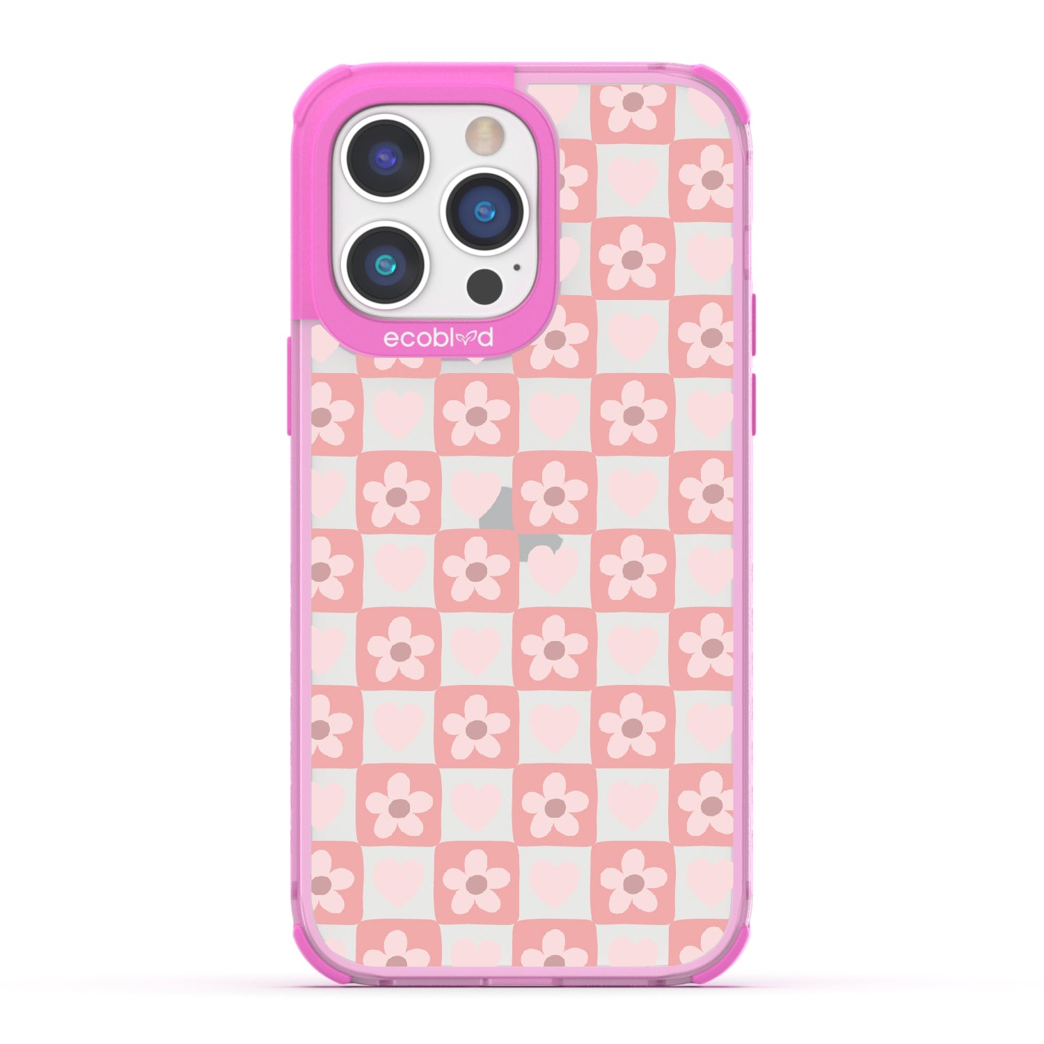 iPhone 14 Pro phone case. Adorned with hearts and flowers, this girly checker print pattern brings a sweet yet strategic flair to your phone. Each piece is a step towards fashion wins.