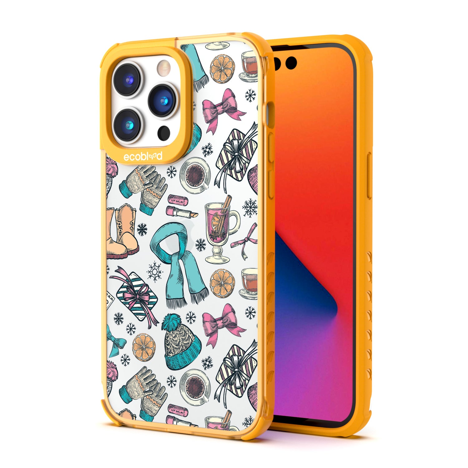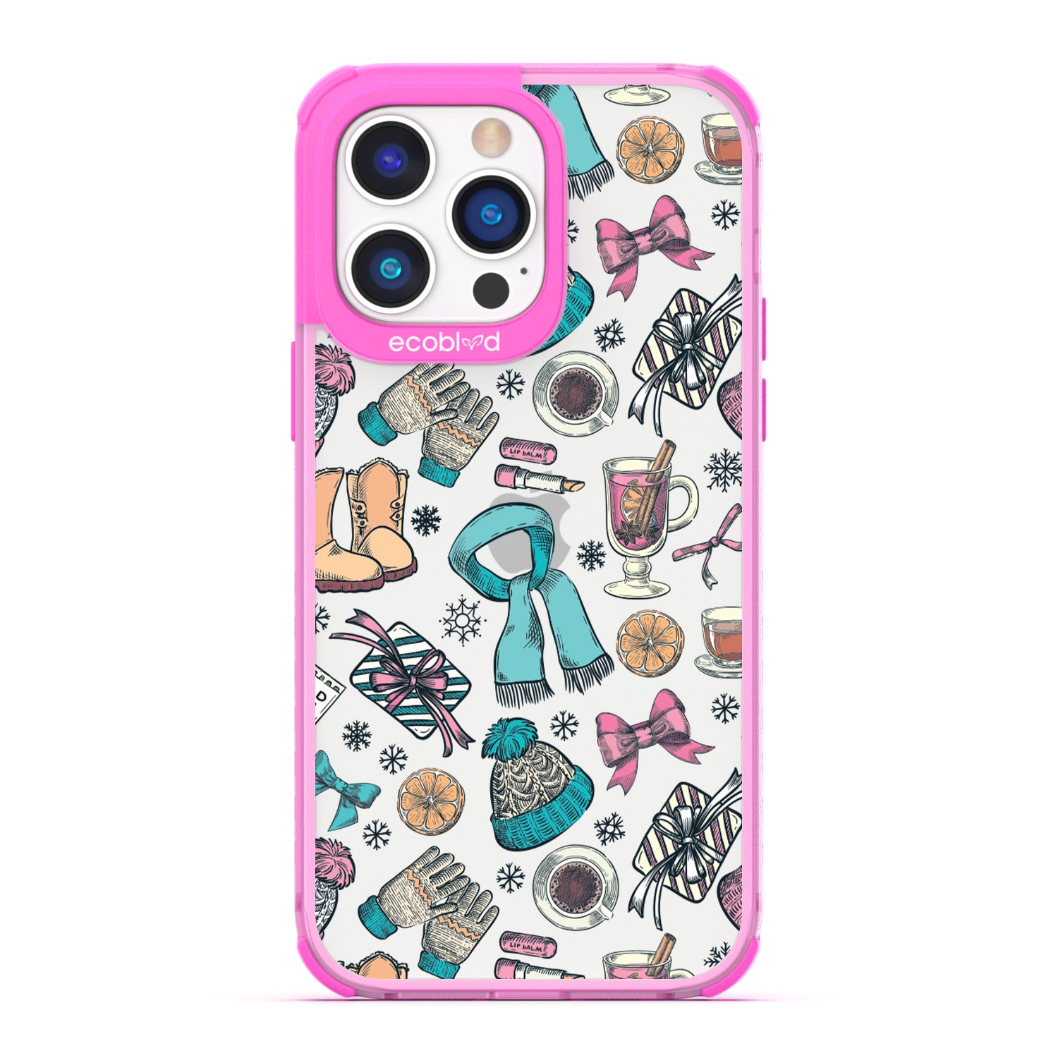 Keeping your phone warm this time of year has never been easier thanks to the Winter Essentials design on our Laguna clear iPhone 14 Pro case, which includes beanies, scarves, mittens, furry boots, and hot drinks always at your fingertips.