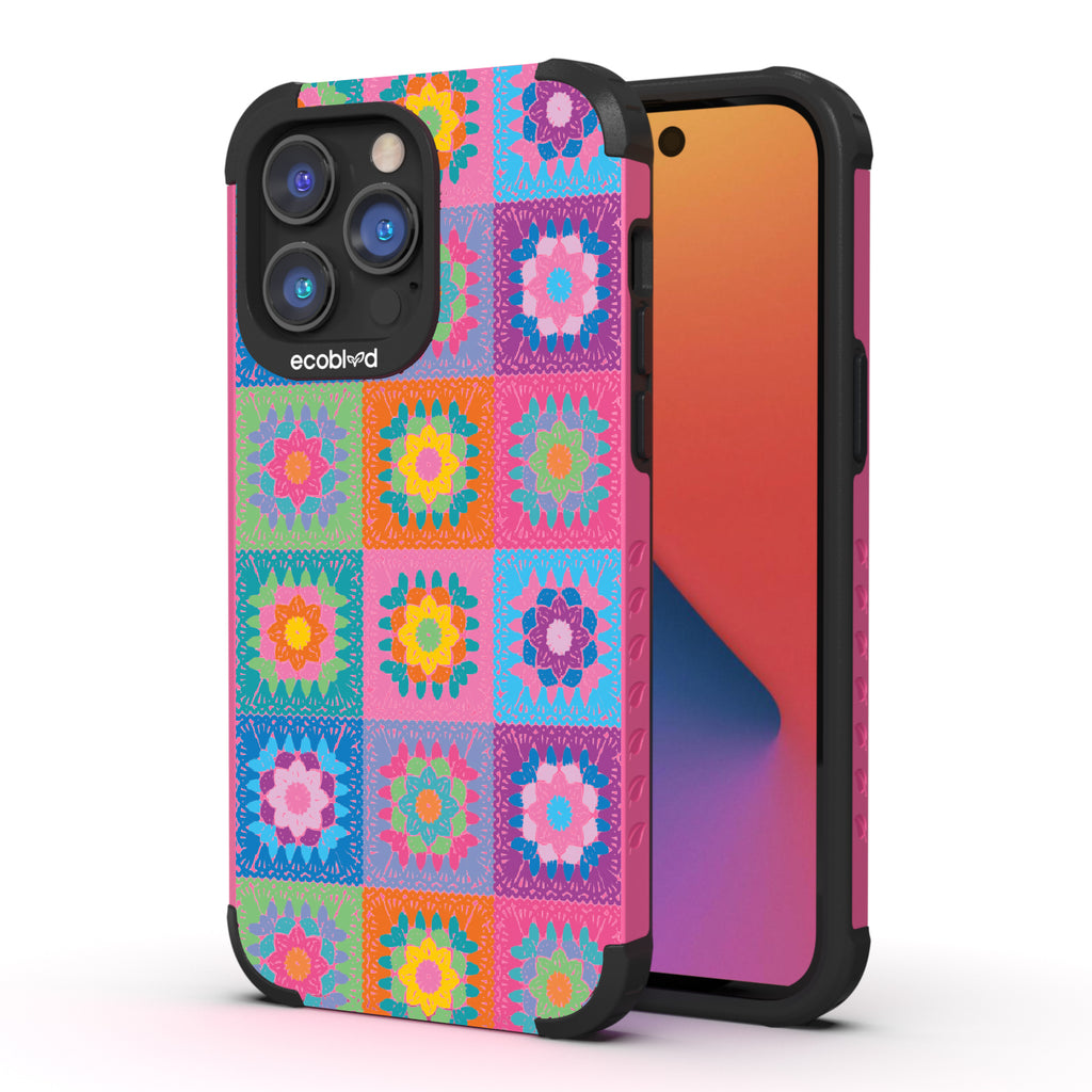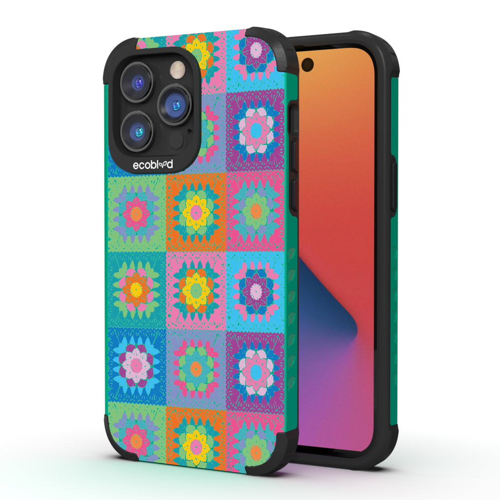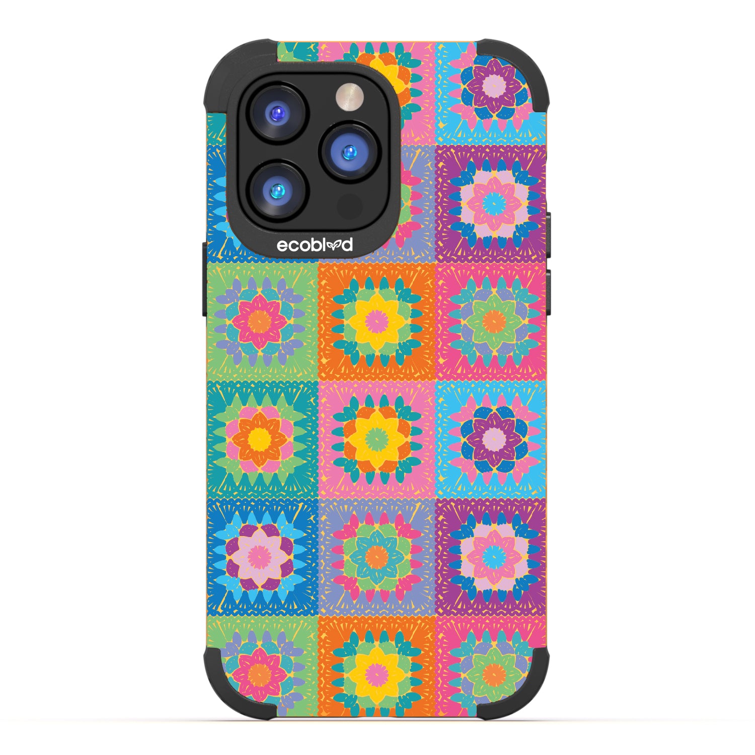 Let the All Squared Away design on our Mojave rugged and compostable iPhone 14 Pro case be your constant companion for Spring Break, music fests, or all year round, giving you a warm and inviting look with its quilt-like design of vintage granny squares and intricate flowers in five bright colorways: Midnight Black, Cascade Blue, Foliage Green, Illuminating Yellow, and Wildflower Pink.