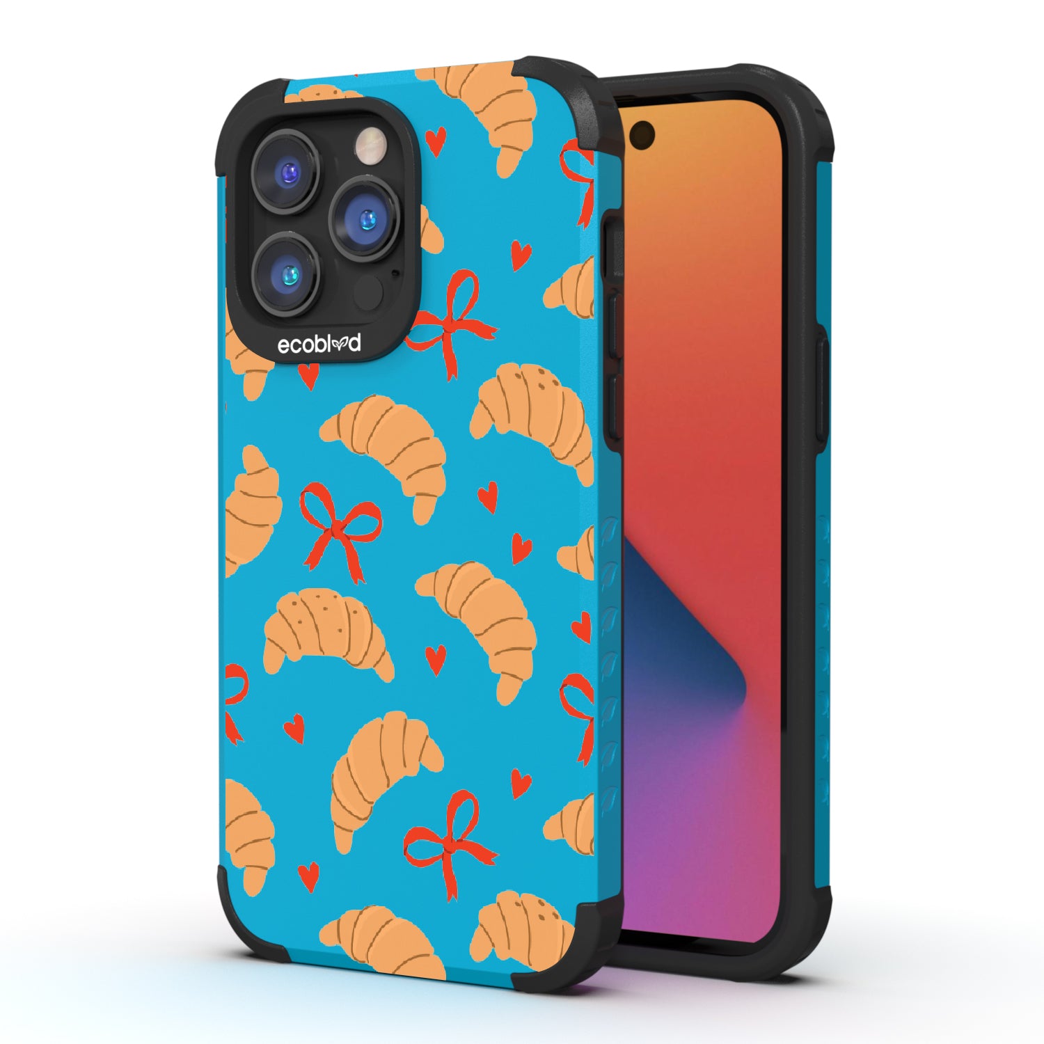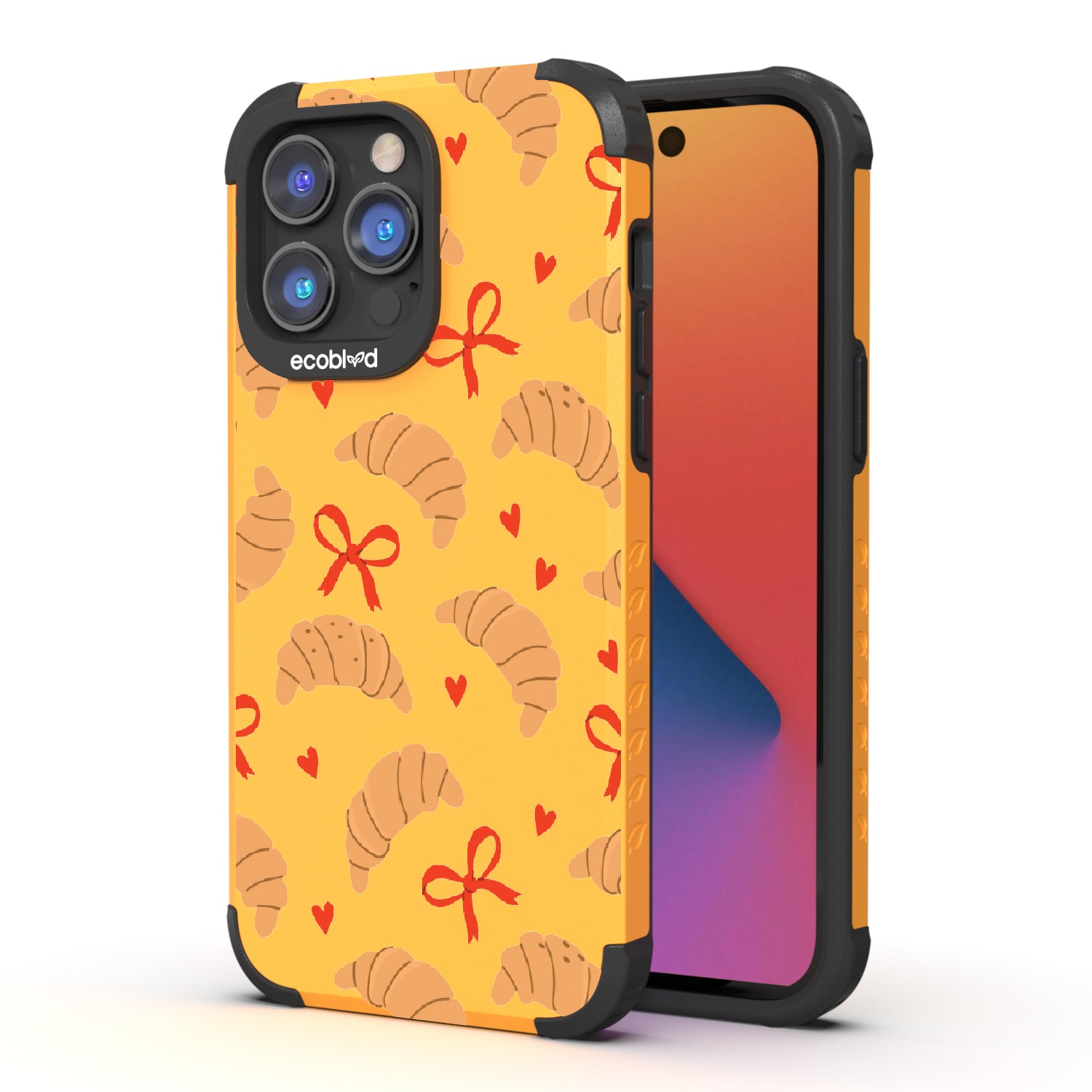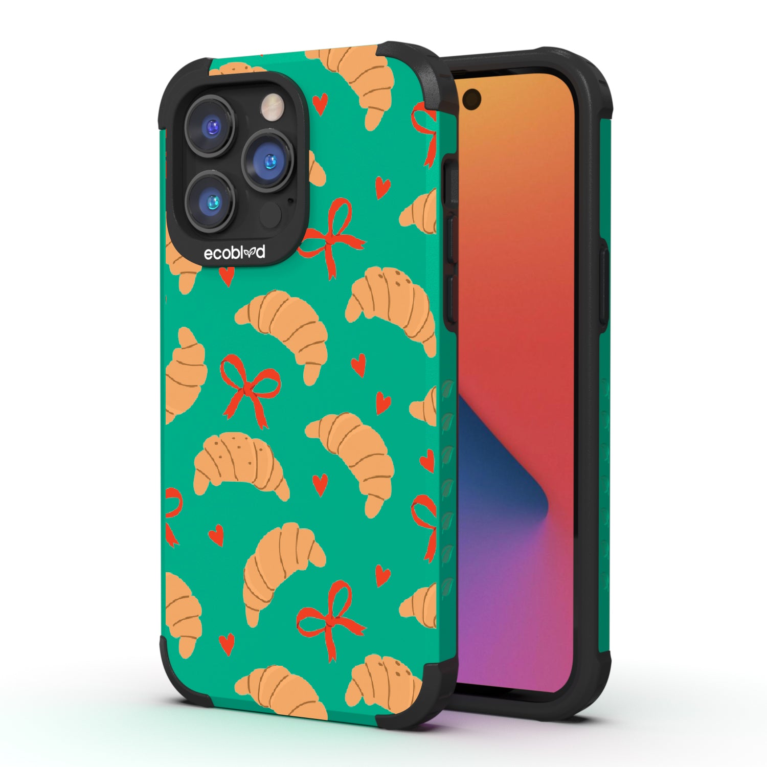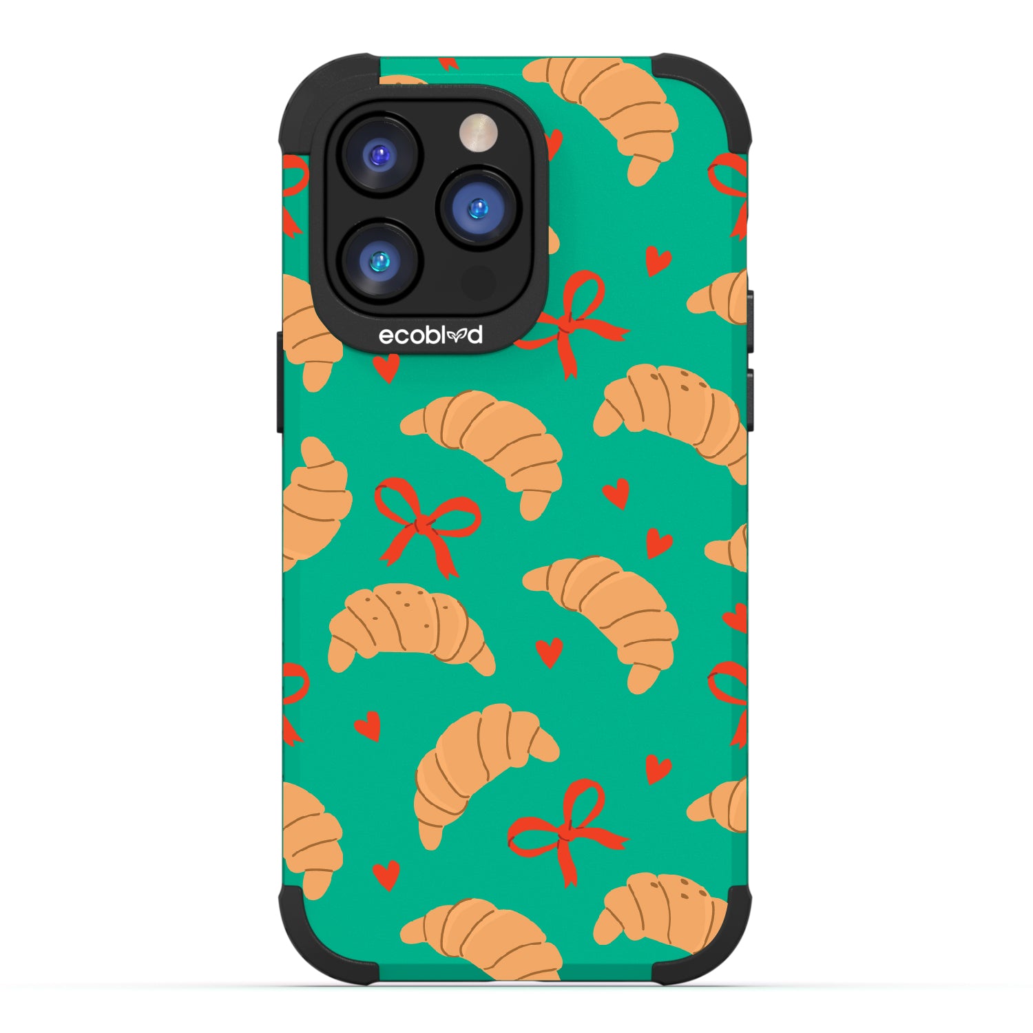 Good taste deserves the perfect recipe like the Croissant Couture design on our Mojave rugged and compostable iPhone 14 Pro case! Softly folded croissants, tied with dainty red bows and sprinkled with sweet hearts, evoke the lightness and care of a true delicacy.