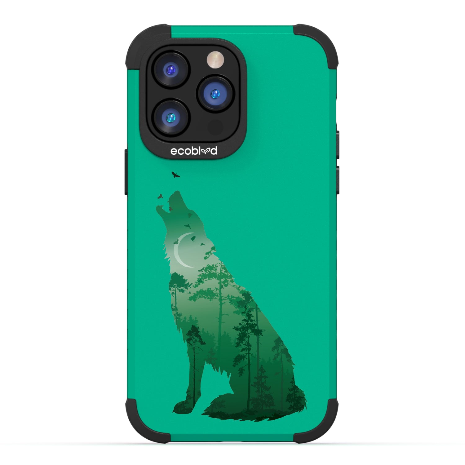 Embrace your wild side as the Howl At The Moon design on our Mojave rugged and compostable iPhone 14 Pro phone case transforms your iPhone into an enchanting moonlit woodland with a howling wolf prowling through the darkness. Choose from five vibrant color options: Midnight Black, Cascade Blue, Foliage Green, Illuminating Yellow, and Wildflower Pink.