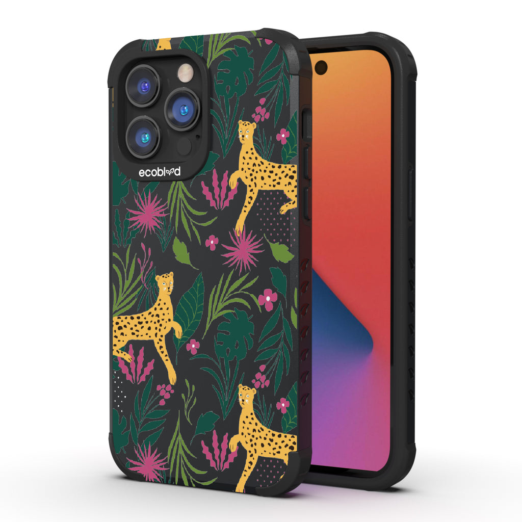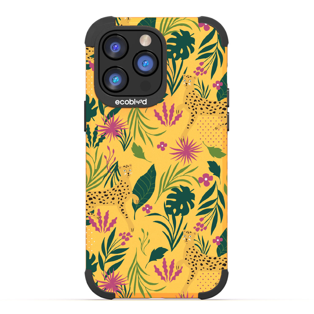 Ride the rhythm of the Jungle Boogie design on our Mojave rugged and compostable iPhone 14 Pro phone case. Jungle Boogie is a phone case design that transports you to a lively, vibrant jungle scene where the natural vibe of the music is always playing. It's a representation of the lively, energetic, and playful spirit of the jungle, where everything is in motion, and the world is alive. The design features lush foliage, bright flowers, and a powerful cheetah that's always on the move, embodying the wild, untamed spirit of the jungle in three captivating colors: Midnight Black, Foliage Green, and Illuminating Yellow.