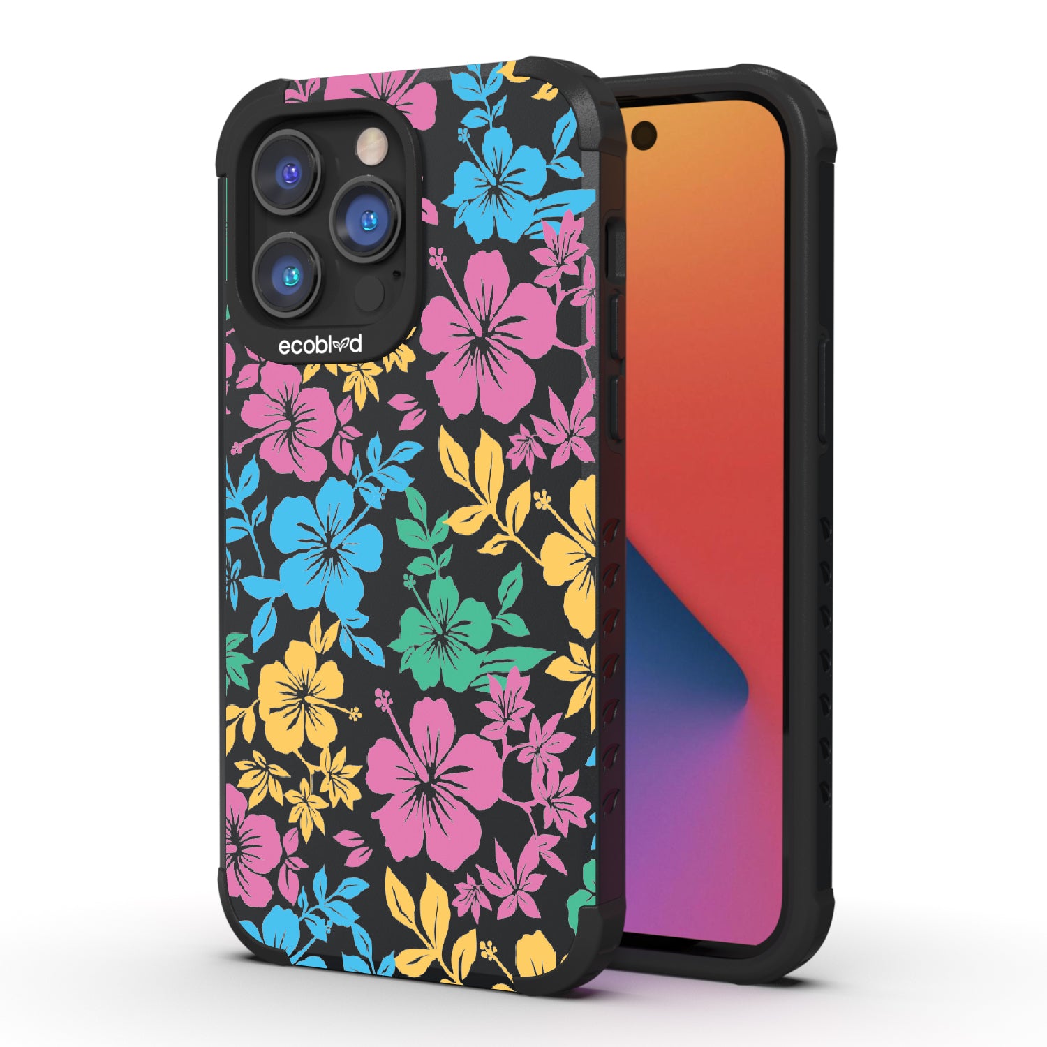 Experience the laid-back vibes of the tropics with our Lei'd Back design on our Mojave rugged and compostable iPhone 14 Pro phone case, a colorful homage to the vibrant beauty of Hawaiian leis. his design showcases an array of tropical hibiscus flowers in yellow, pink, green, and blue, reminiscent of traditional lei arrangements. Enjoy the relaxed lifestyle of an island as you escape to the spirit of aloha.
