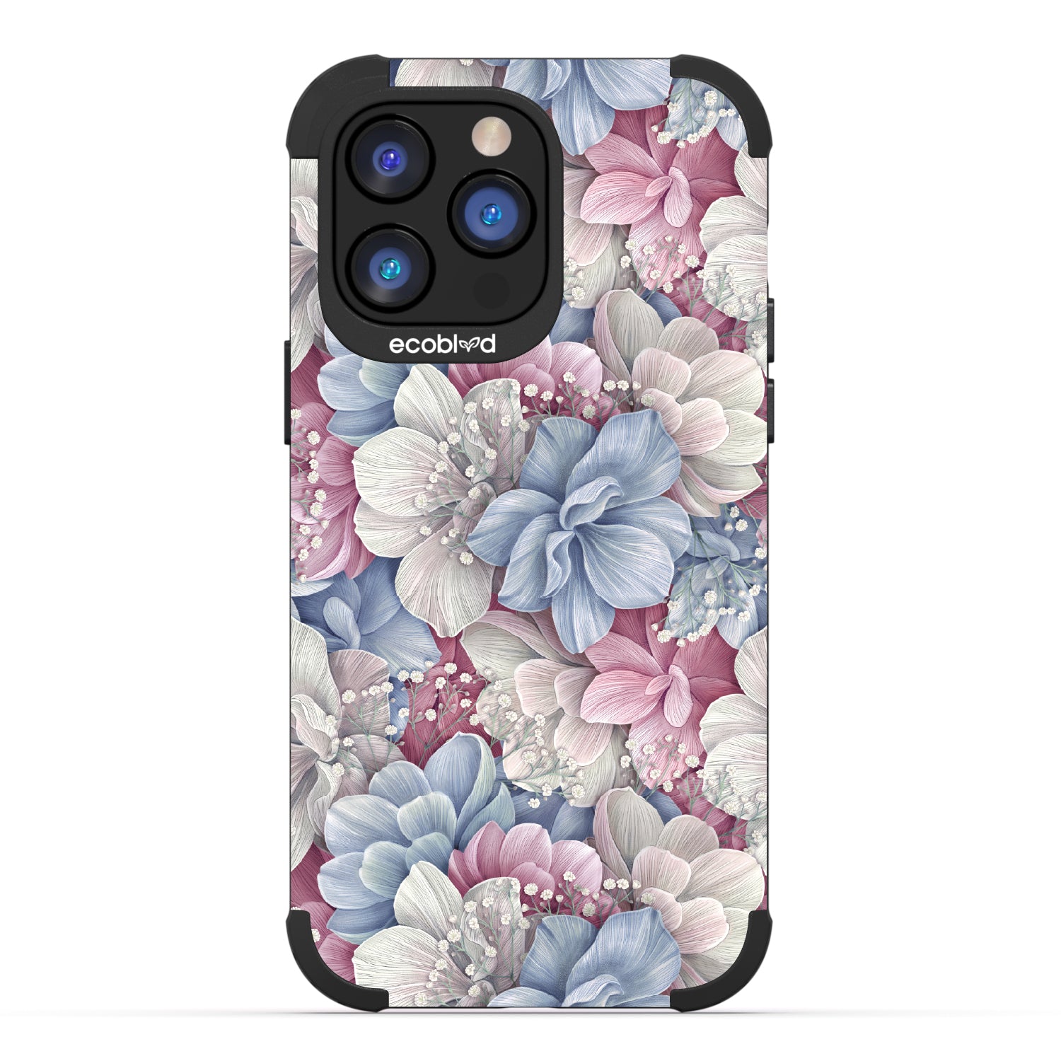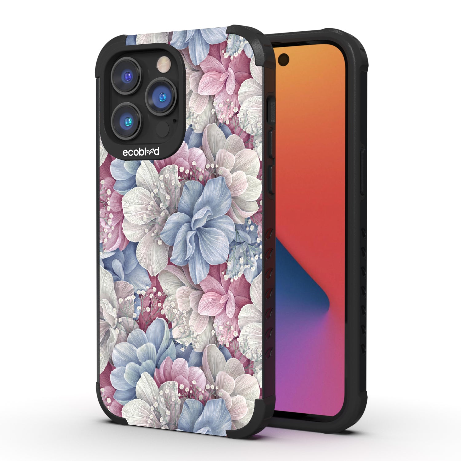 The Petals & Pearls design on our Mojave rugged and compostable iPhone 14 Pro case is like a melody of spring, its pastel colors swaying like a sweet tune and the water droplets on the petals ringing like pearls, harmoniously reflecting the blooming beauty of the season. Available in our bold Midnight Black colorway.