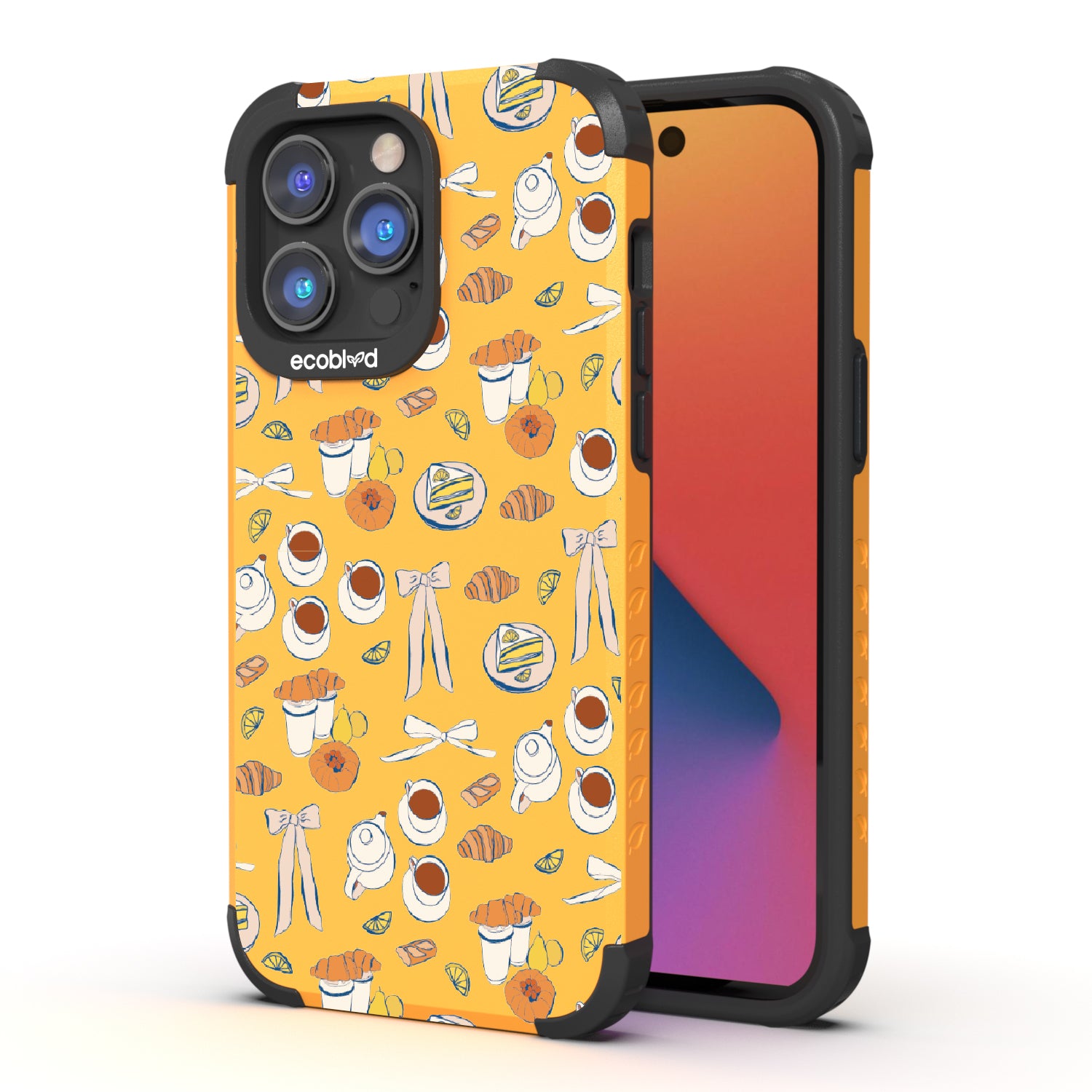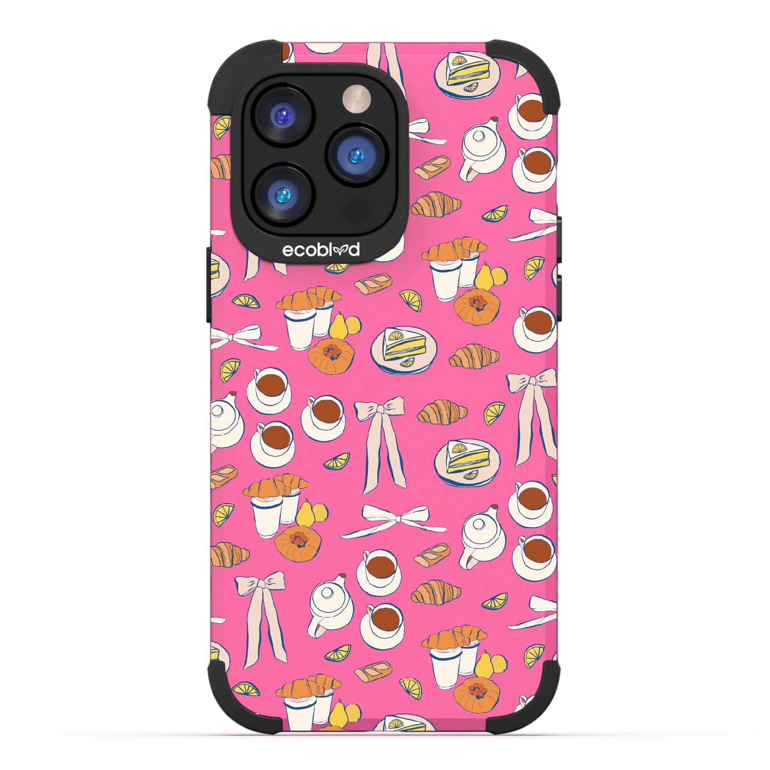 Tea time is the new happy hour. This design on our Mojave rugged and compostable iPhone 14 Pro case combines whimsical teacups, dainty bows, and sweet pastel pastries in style as delightful as a perfect afternoon break. A tribute to making time for yourself with a touch of elegance.