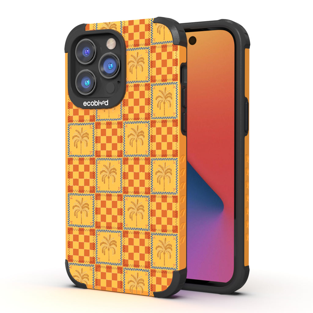 Relax and unwind with the Under The Palms design on our Mojave rugged and compostable iPhone 14 Pro phone case, where the carefree spirit of palm trees meets the ageless appeal of checkerboard patterns. This design captures the essence of a retro beach getaway, combining classic style with a modern twist. Let your phone take you to a place where the sun shines brighter and the palms sway gently in the breeze.