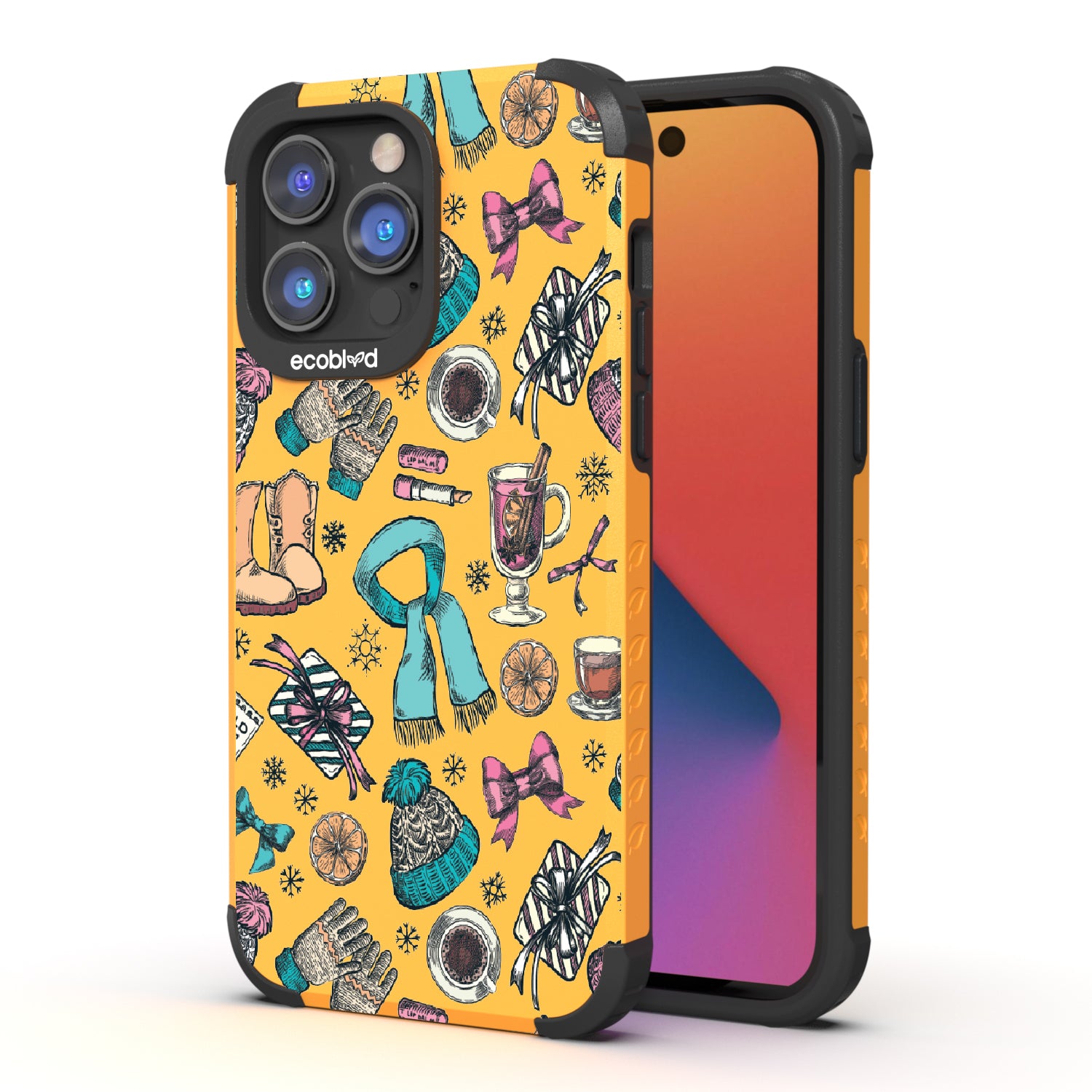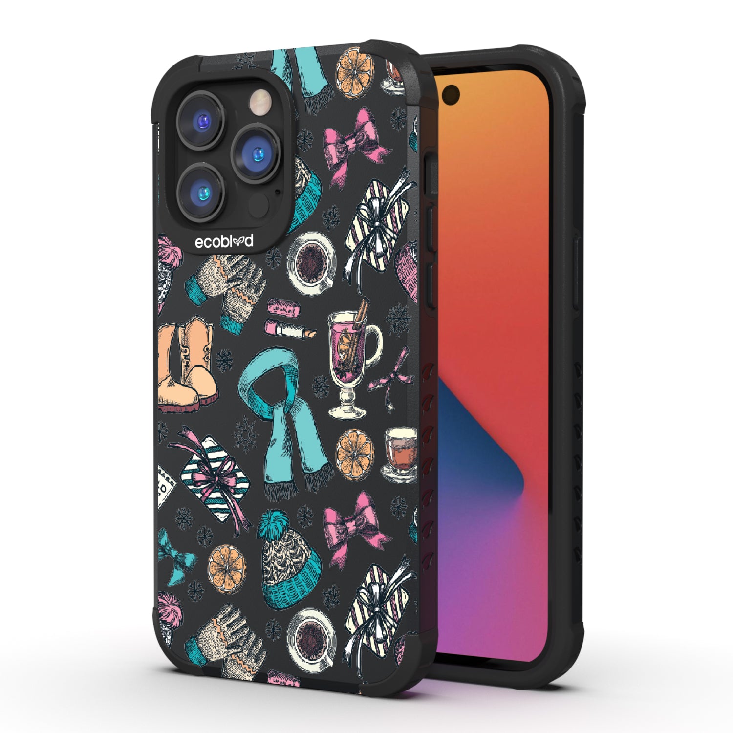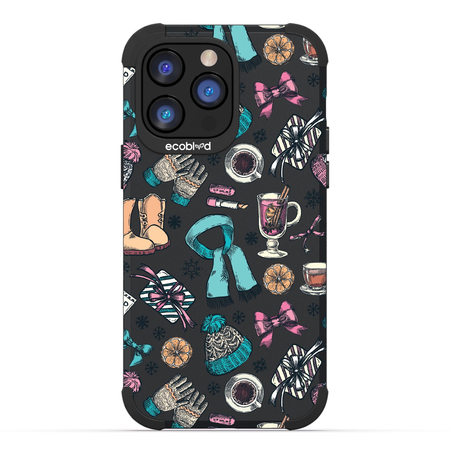 Keeping your phone warm this time of year has never been easier thanks to the Winter Essentials design on our Mojave rugged and compostable iPhone 14 Pro case, which includes beanies, scarves, mittens, furry boots, and hot drinks always at your fingertips.