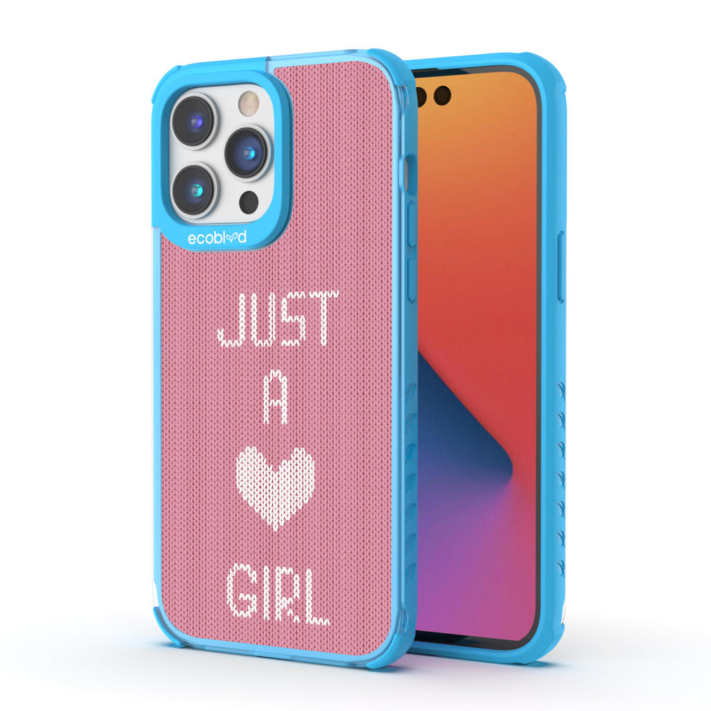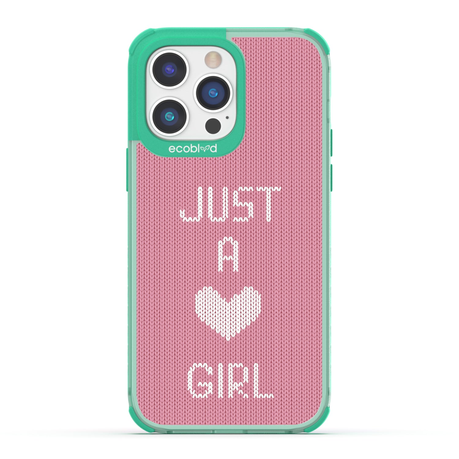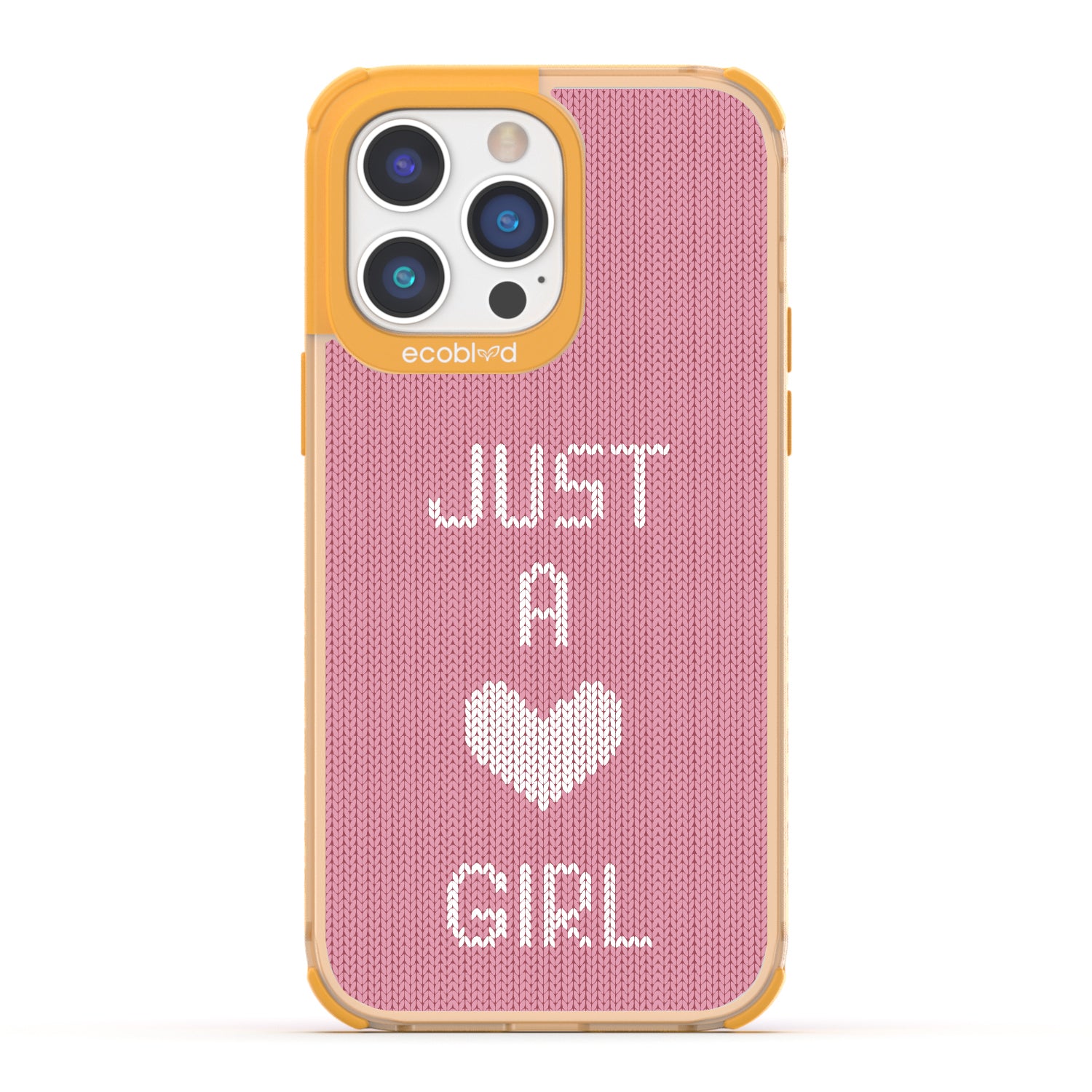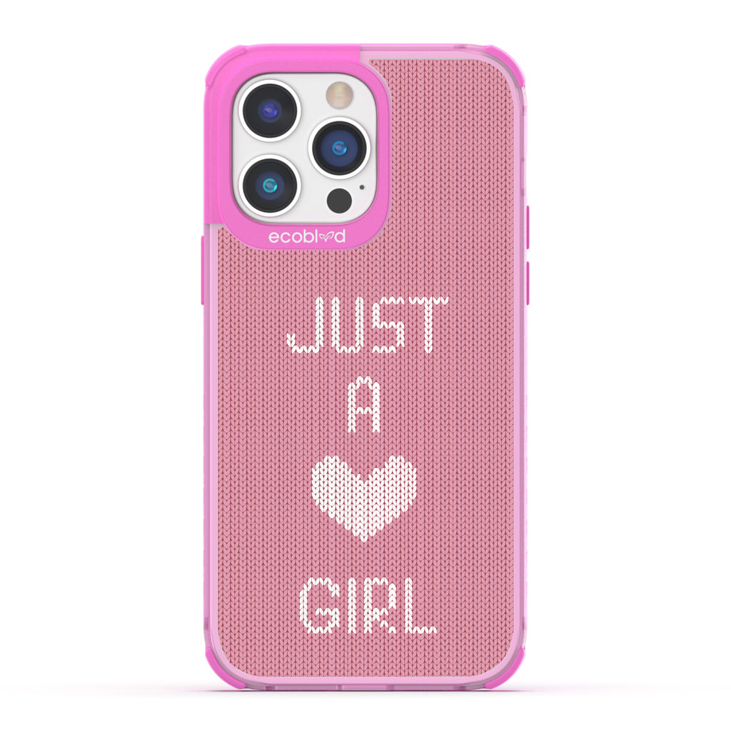 iPhone 14 Pro Max phone case. Featuring a soft pink knit pattern and a bold heart, this case is more than just sweet—it's a declaration of feminine strength and independence. Show the world that being 'just a girl' means owning your power and breaking every mold.