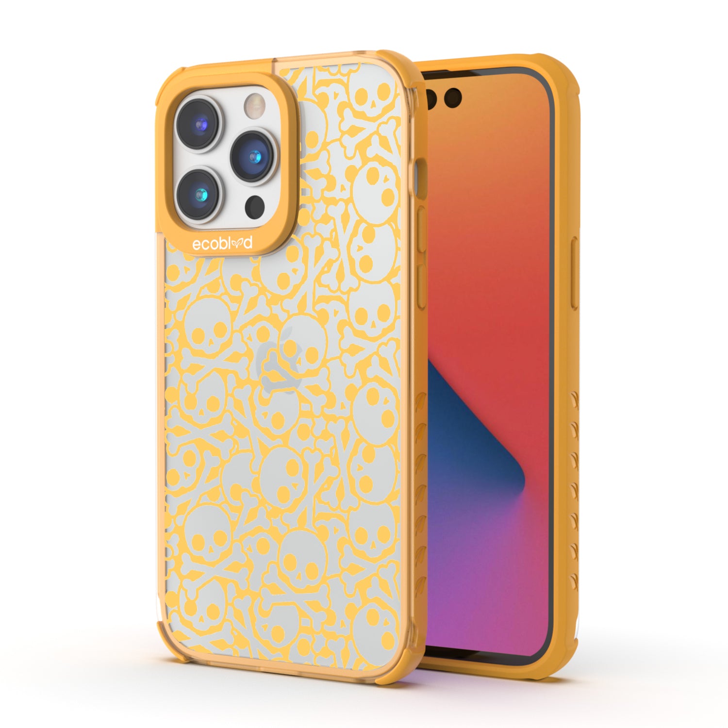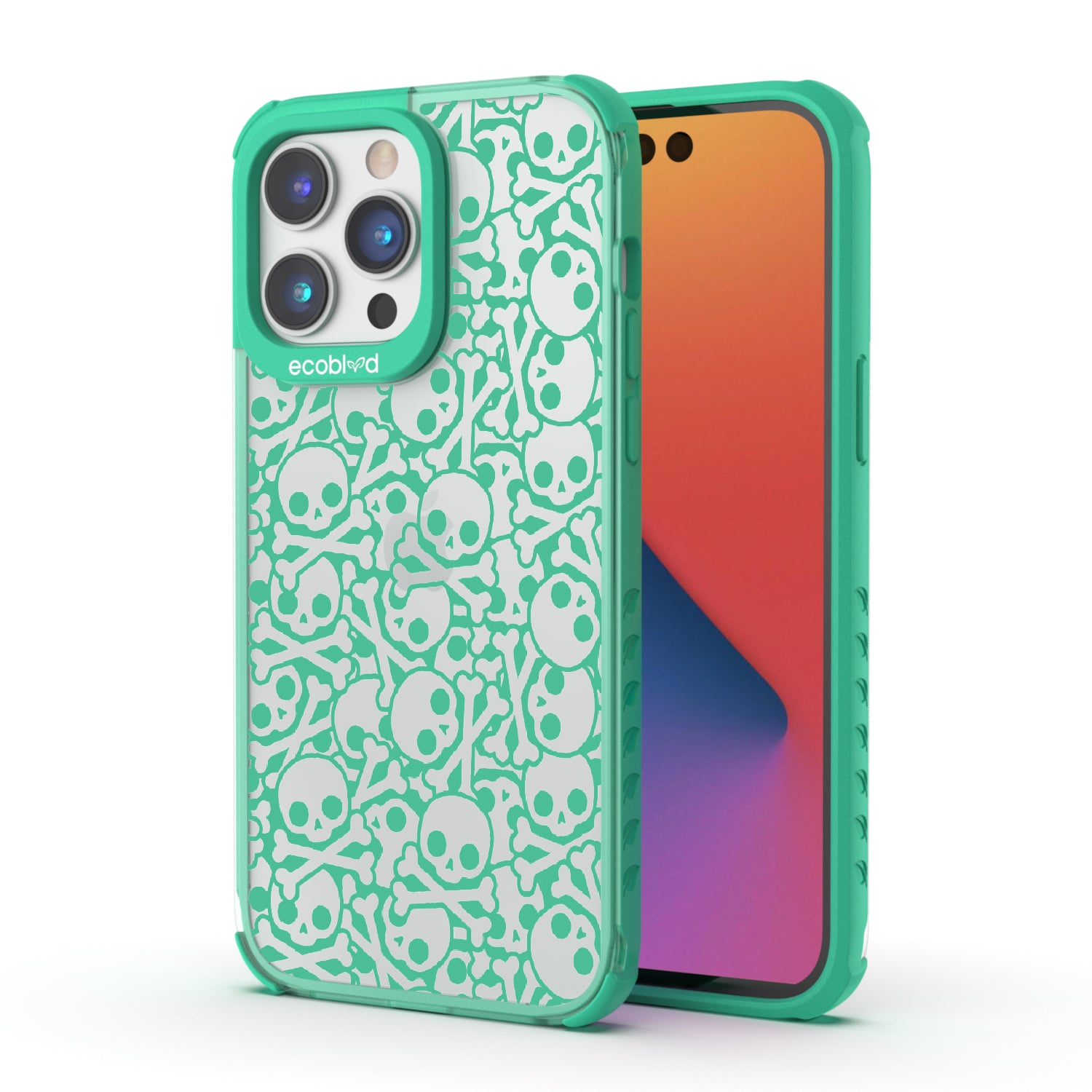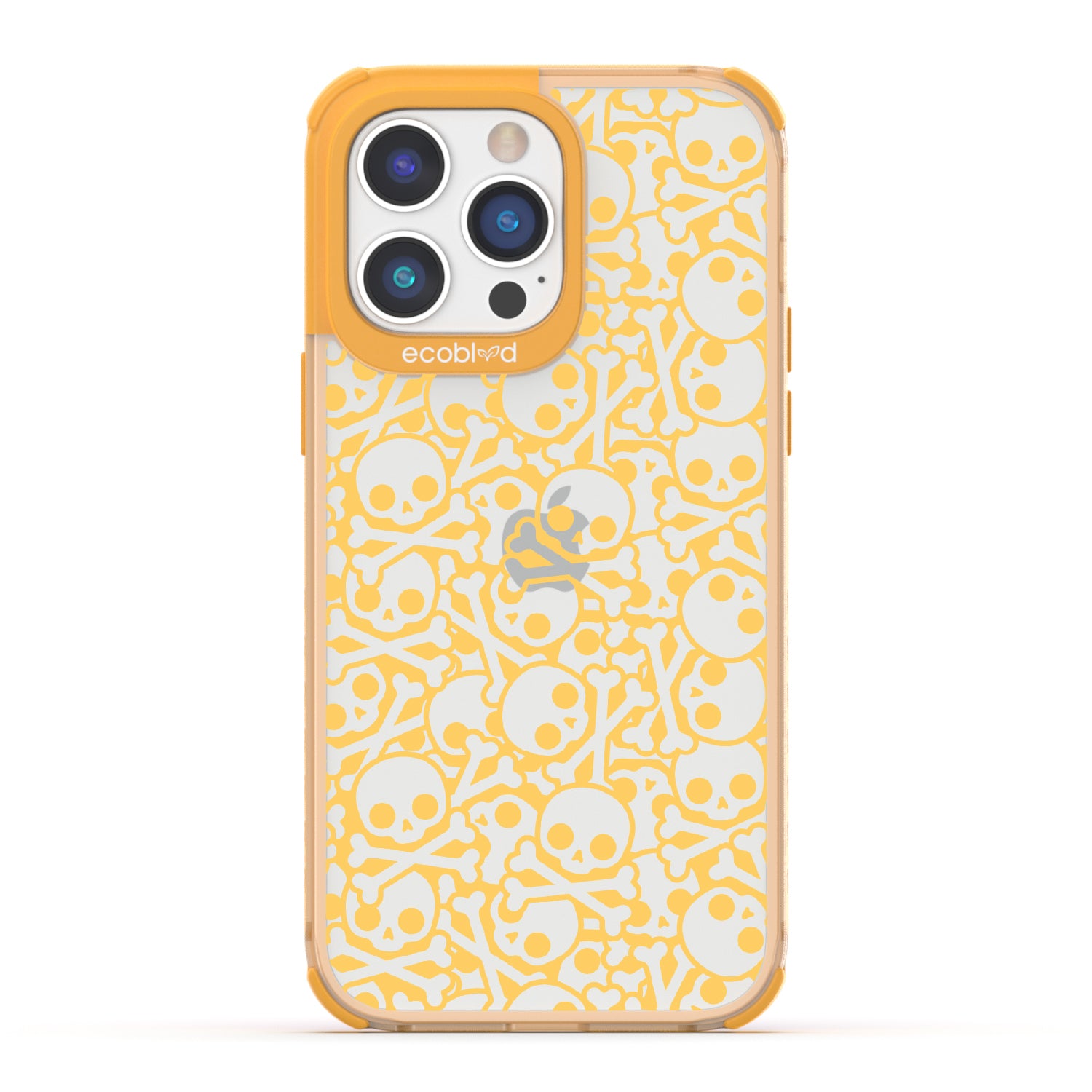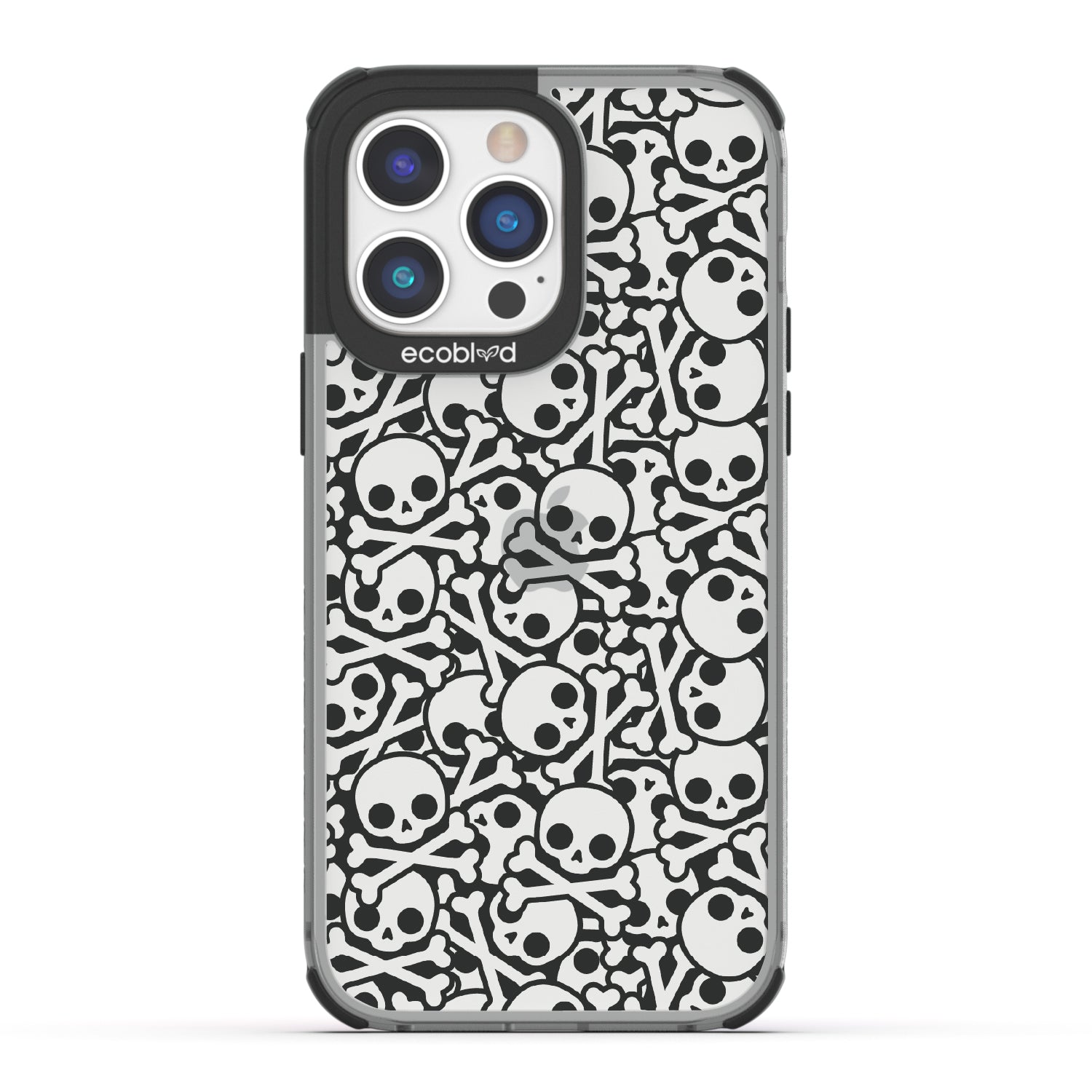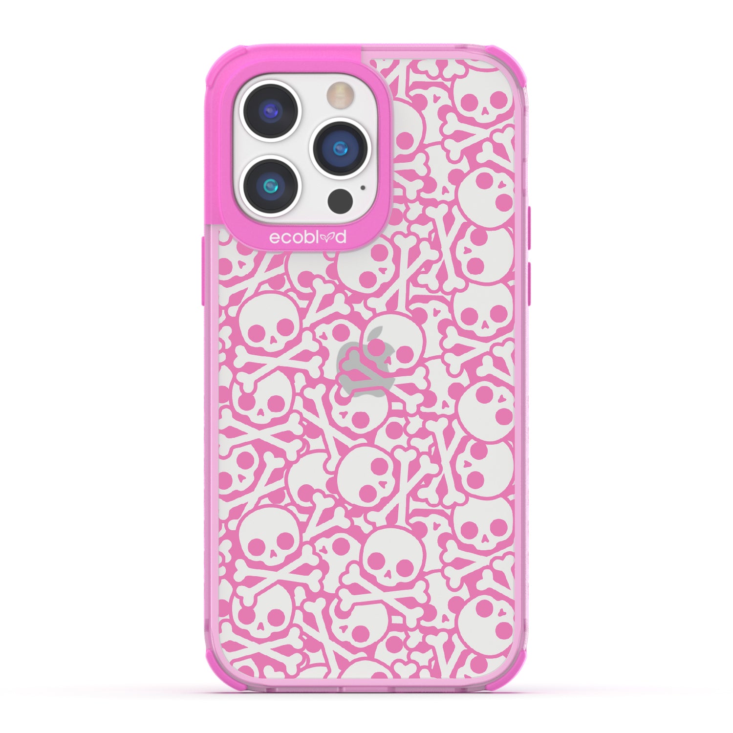 The Skull & Crossbones design on our Laguna clear iPhone 14 Pro Max case boldly embodies the ominous symbolism of danger and defiance. The stark white skull stares menacingly, its hollow eyes fixed on the crossed bones below. An iconic emblem, known for its historical ties to treacherous journeys and hidden codes, invites you to explore life's mysteries with a relentless spirit of bravery.