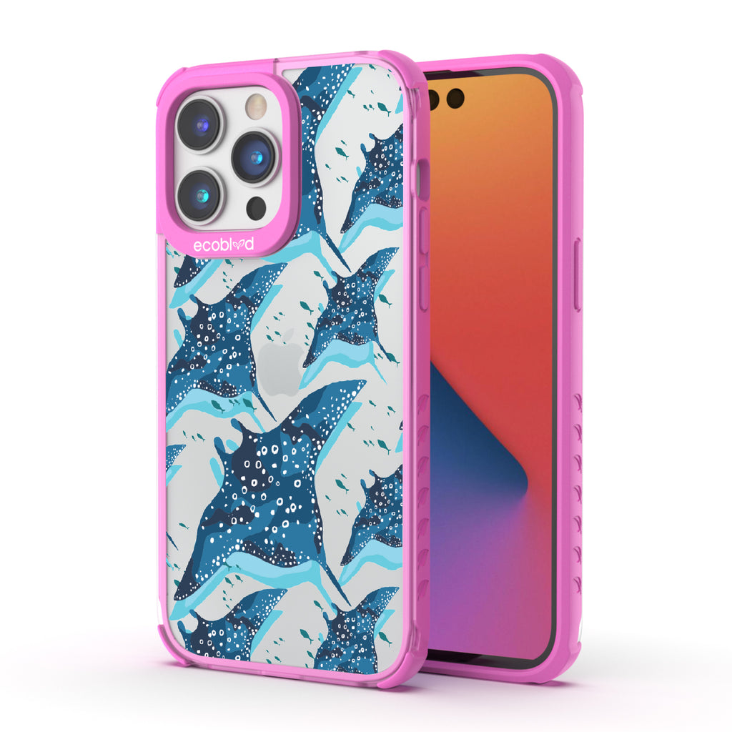 Sleek and stealthy, the Sting Ray design on our Laguna clear iPhone 14 Pro Max phone case showcases these marine marvels as they glide effortlessly through the ocean depths. The stingrays streamlined bodies and distinctive spotted patterns capture the fluid grace of the sea’s most agile navigators.