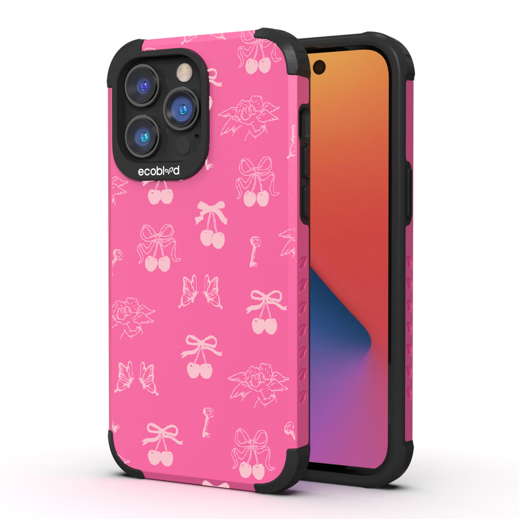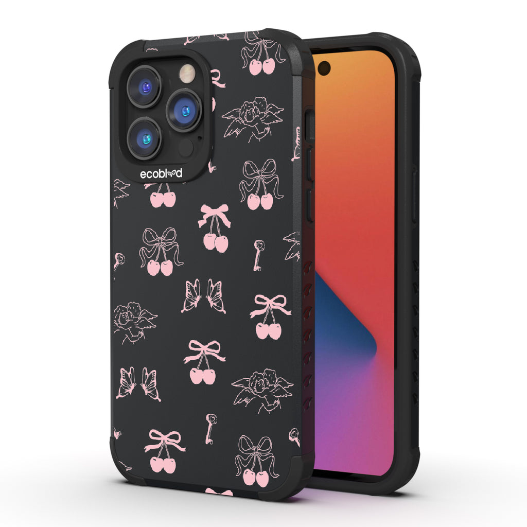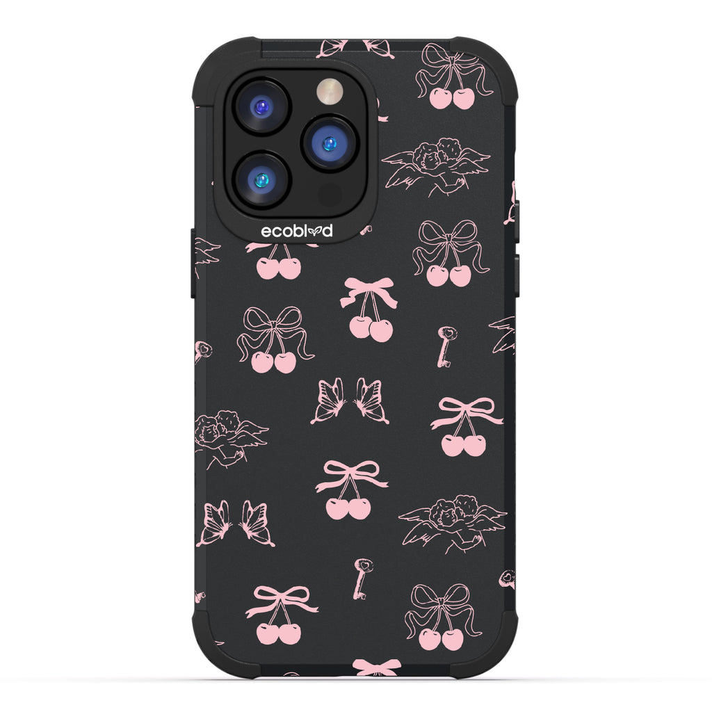 Being a Doll Face means exuding charm and playfulness, just like the Doll Face design on our Mojave rugged and compostable iPhone 14 Pro Max phone case. This cute design, with its cherubs, cherries, bows, keys, and butterflies, brings a whimsical coquette touch to your phone. The playful pattern adds a dainty, feminine energy, enhancing your coquette fashion. Bring out the frilly details that make you shine. Show off your Doll Face allure with this delightful design and let your phone be your cutest accessory!