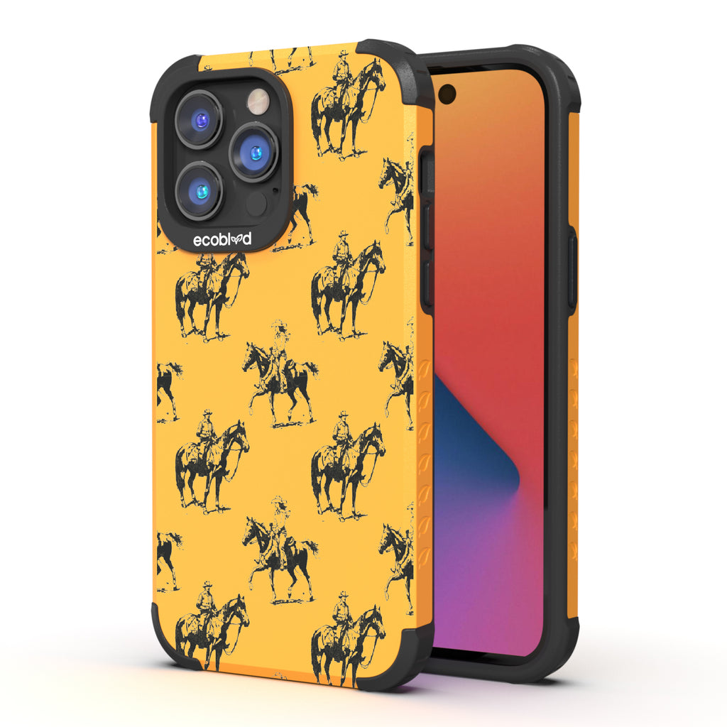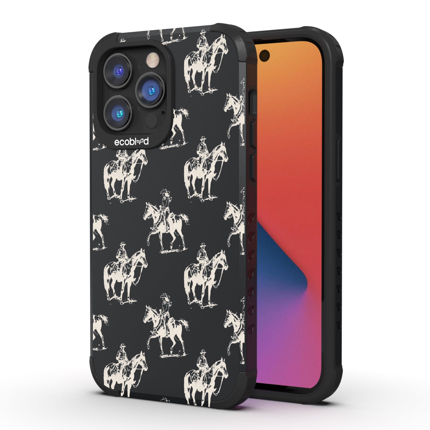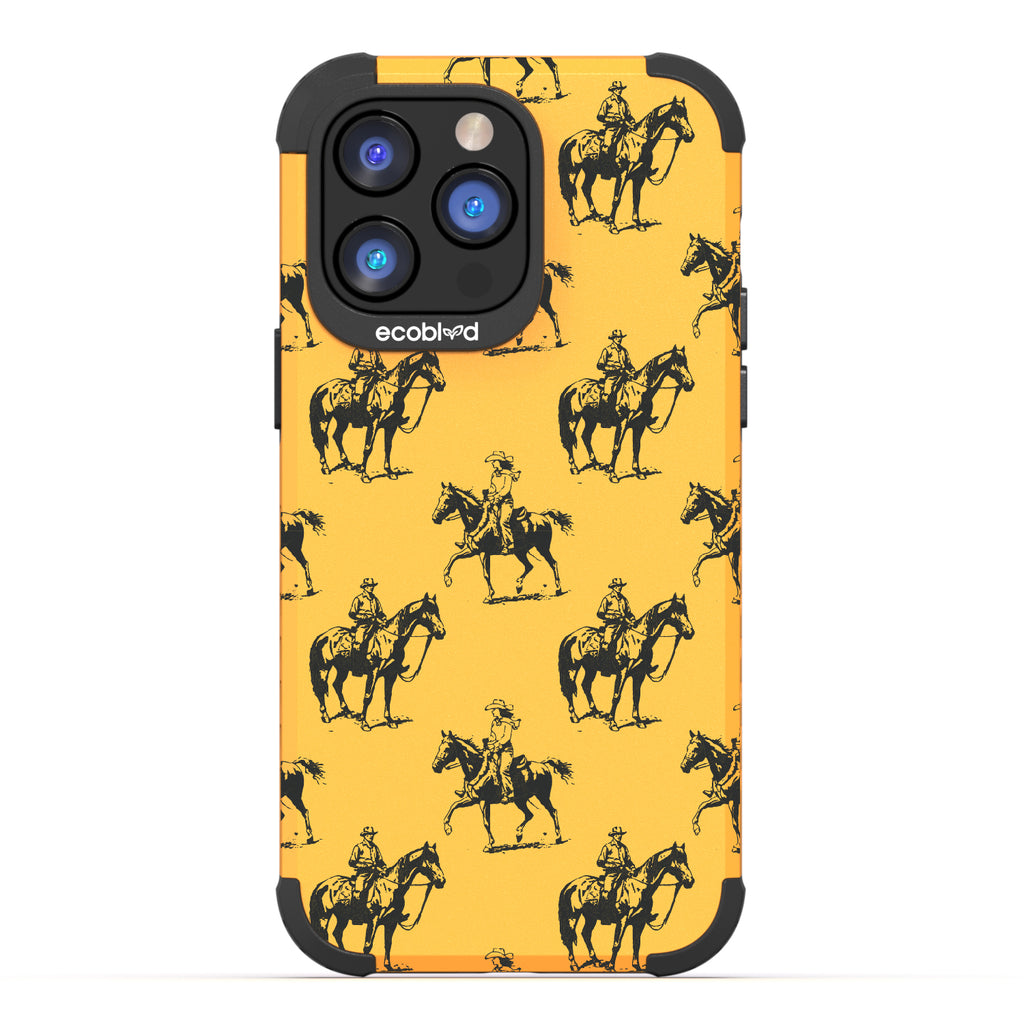 Yeehaw! It's time for an action-packed ride with the Horsin' Around exclusive design on our Mojave rugged and compostable iPhone 14 Pro Max phone case. See the daring cowboys and cowgirls with their majestic horses ride off into the distance, chasing dreams and forging unforgettable memories. Put this design on your phone and let every call echo the playful spirit of cowboys horsin' around in the free-ridin' time.