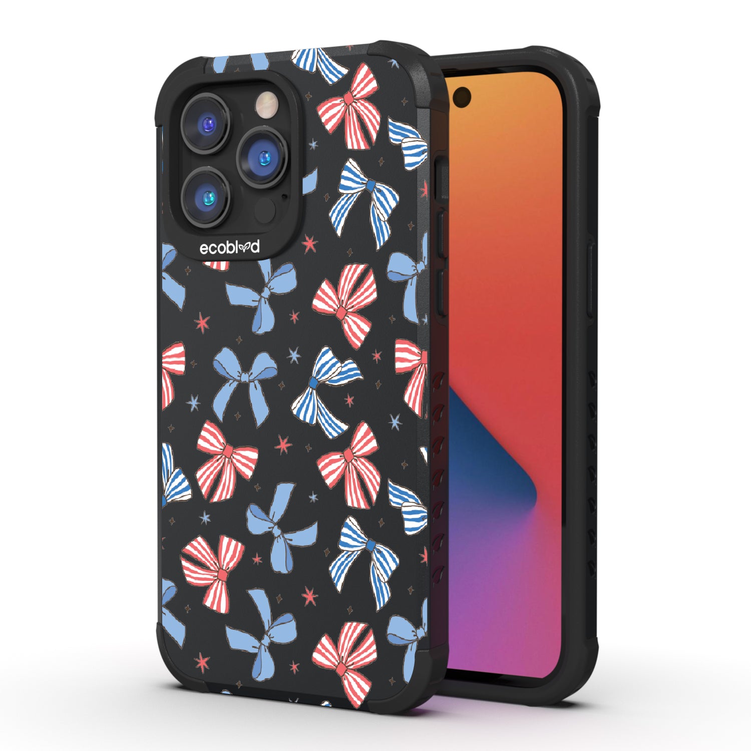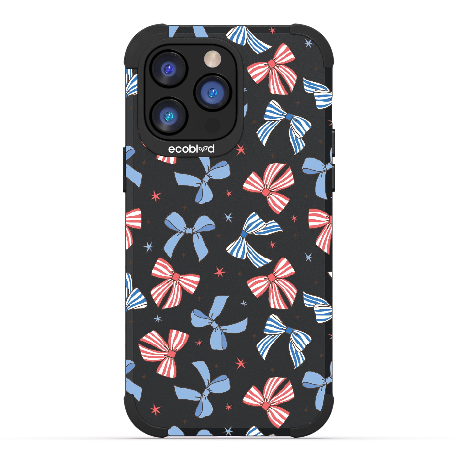 America the bow-tiful! The Miss Americana design on our Mojave rugged iPhone 14 Pro Max phone case crowns your phone with patriotic flair. With red, white, and blue bows, this coquette phone case design turns your phone into the belle of the Americana ball.