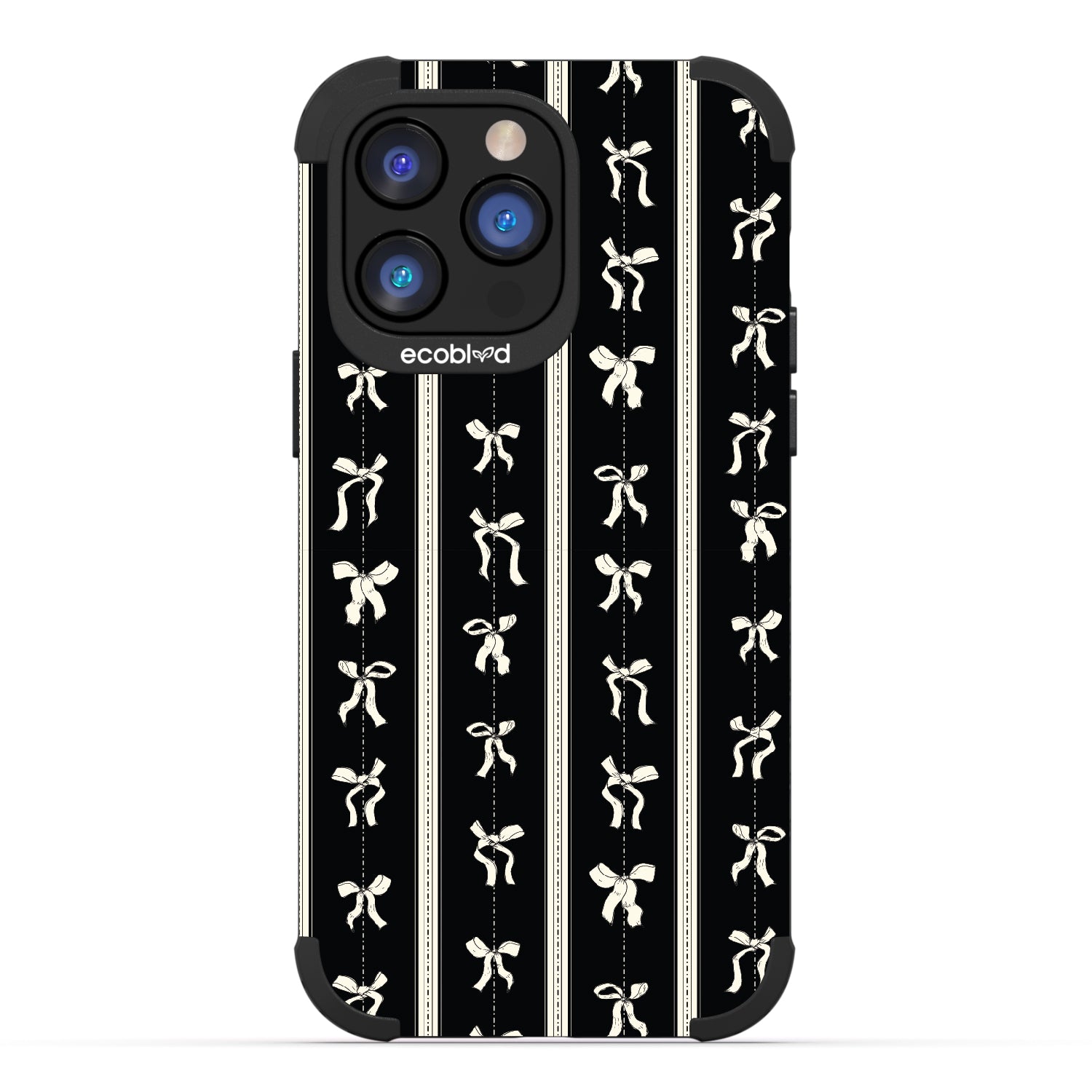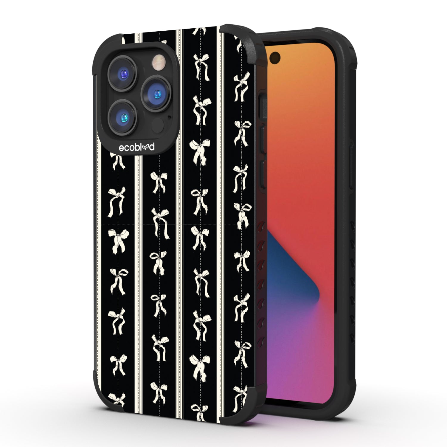 iPhone 14 Pro Max phone case. Ribbons gracefully swirl on a sleek black lace backdrop, infusing your look with dainty sophistication. These twirling ribbons will make every step feel like a stylish dance.