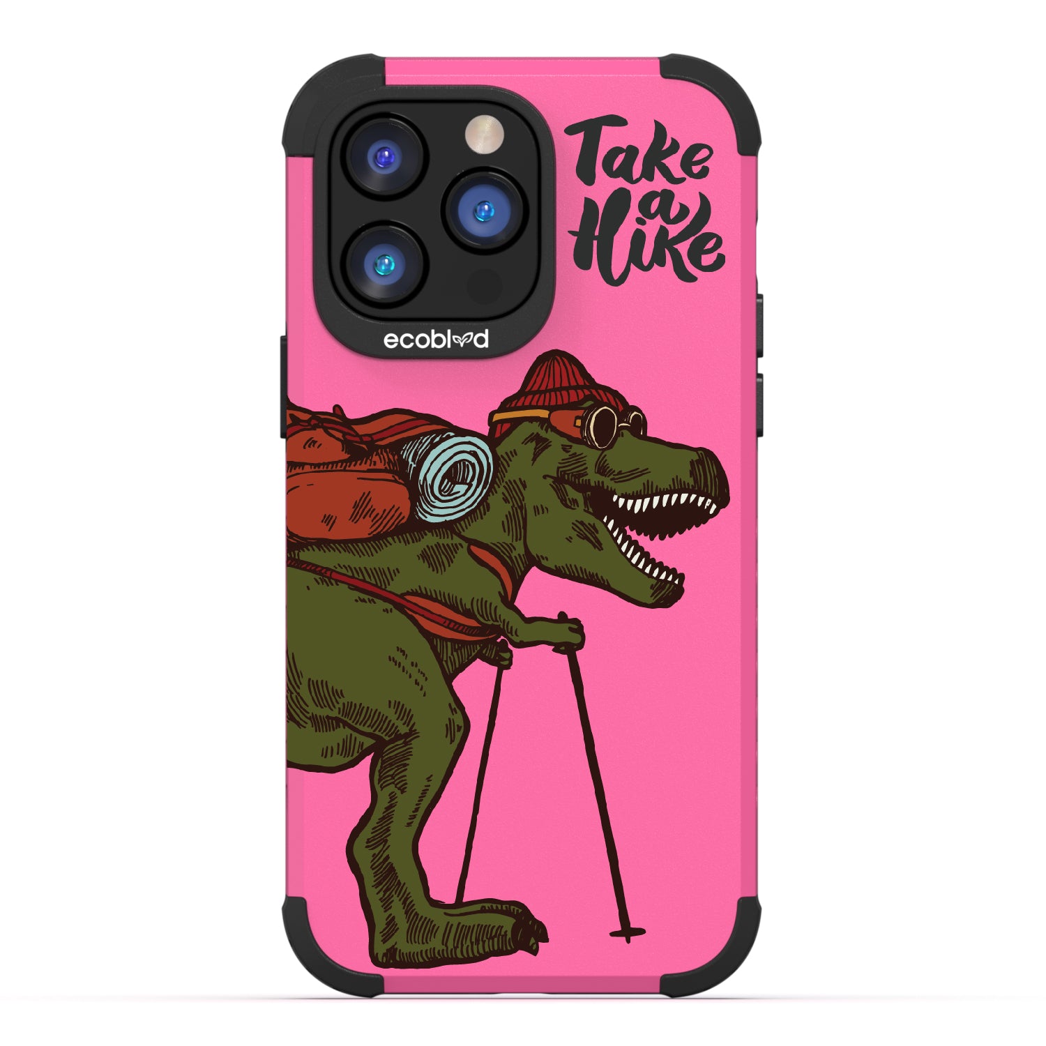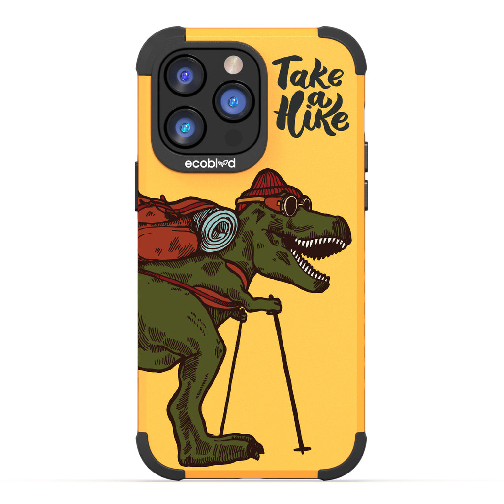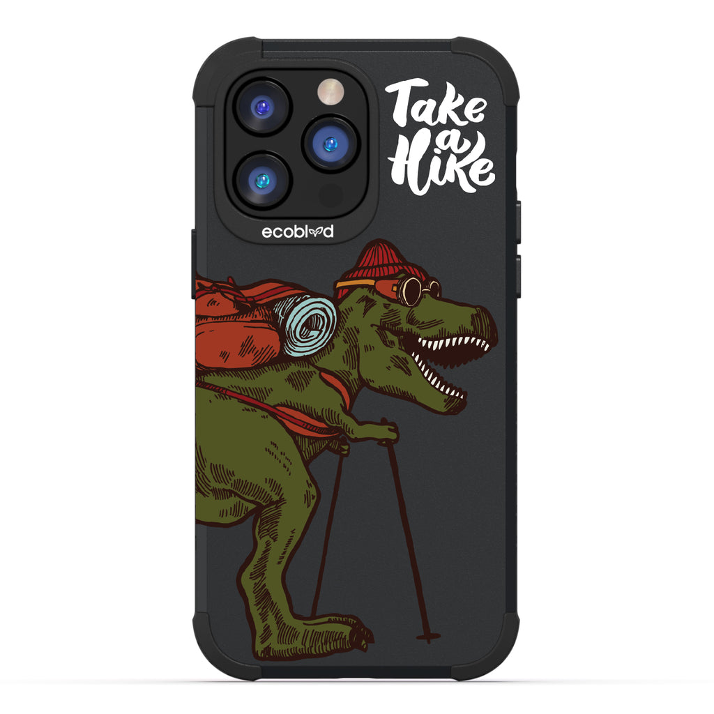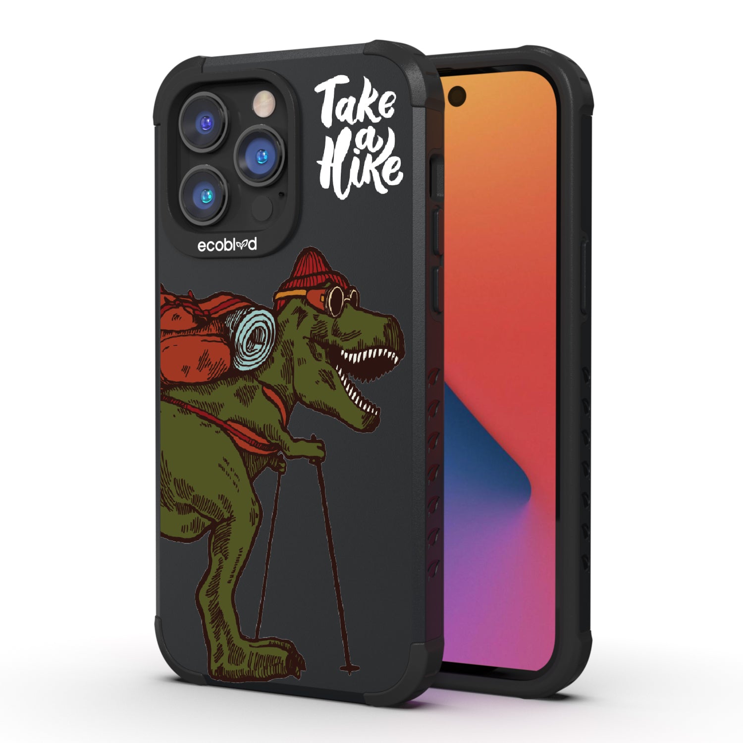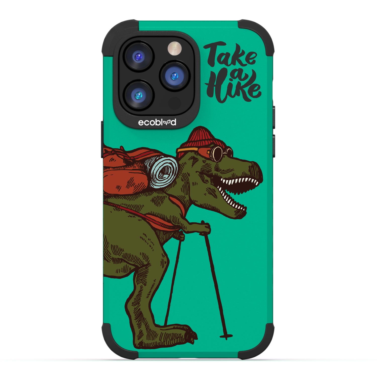 The Take a Hike design on our Mojave rugged and compostable iPhone 14 Pro Max case puts a "DINORMOUSLY" fun twist on the phrase as a trail-ready T-rex gets ready to wander on a new path.