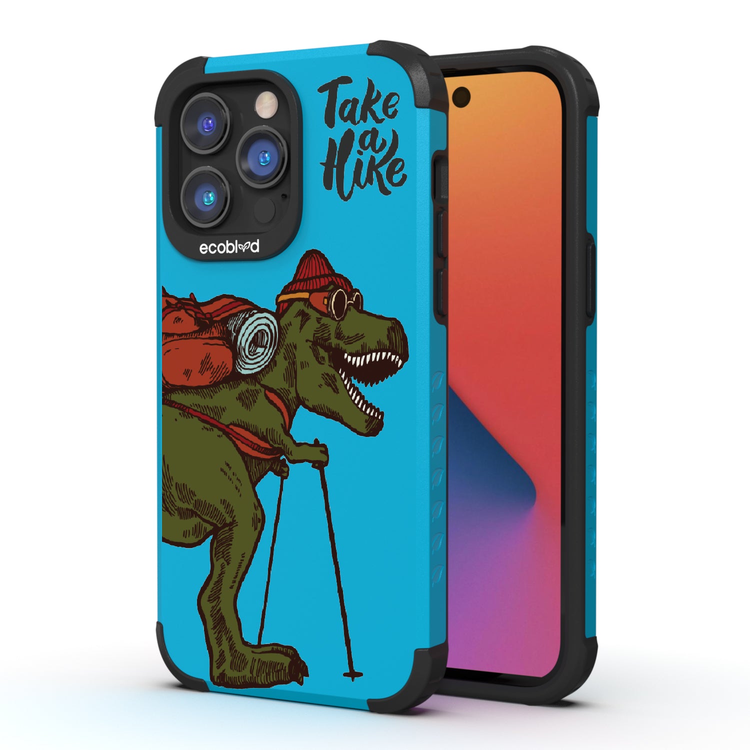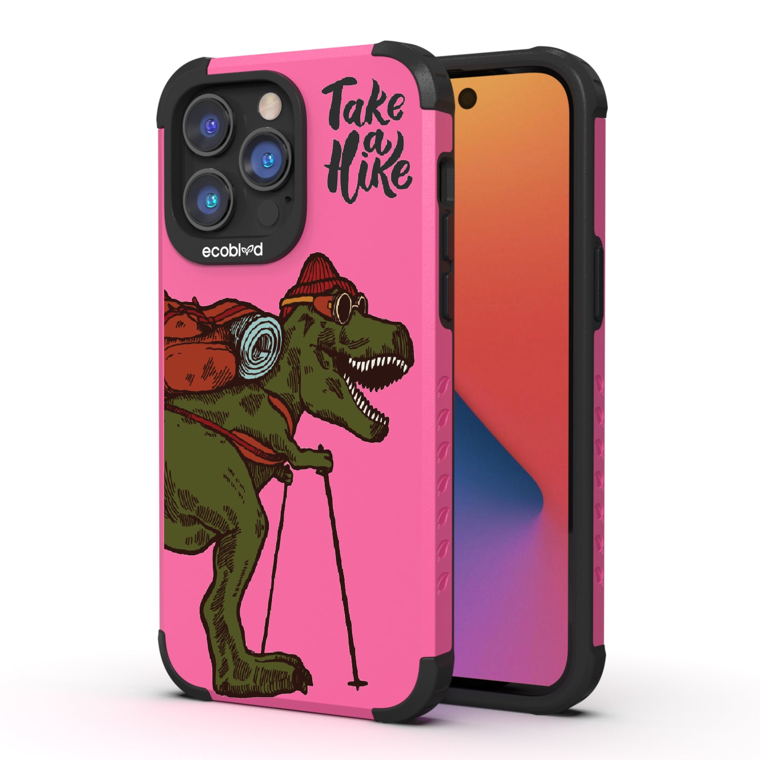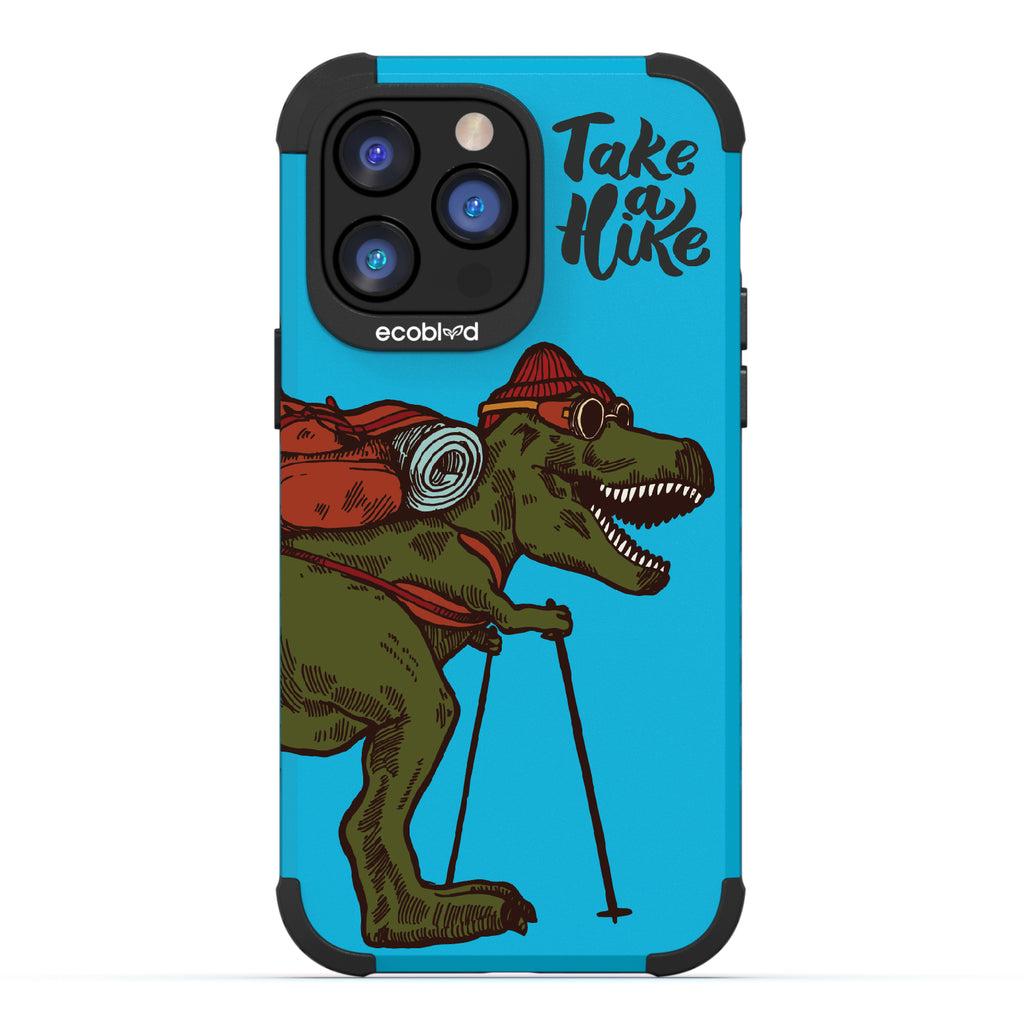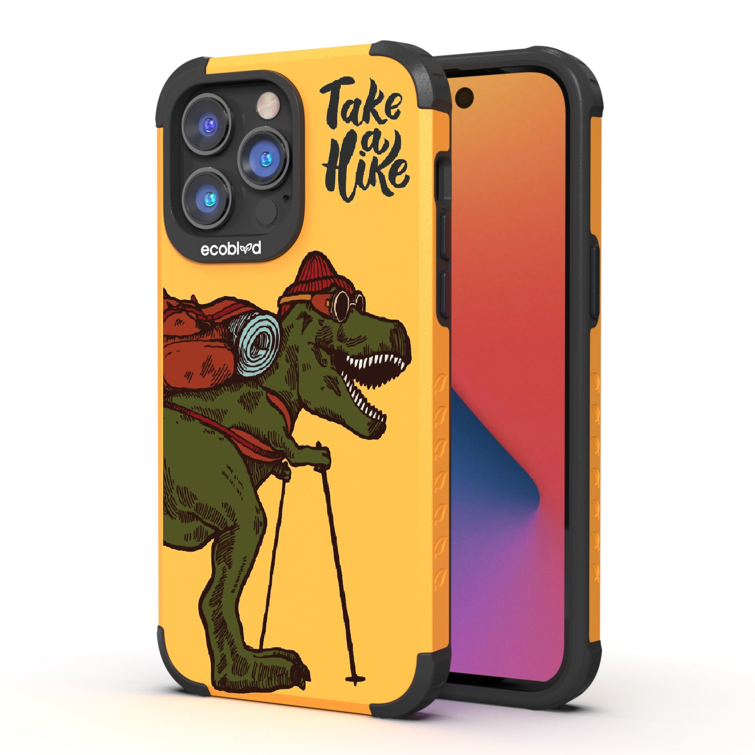 The Take a Hike design on our Mojave rugged and compostable iPhone 14 Pro Max case puts a "DINORMOUSLY" fun twist on the phrase as a trail-ready T-rex gets ready to wander on a new path.