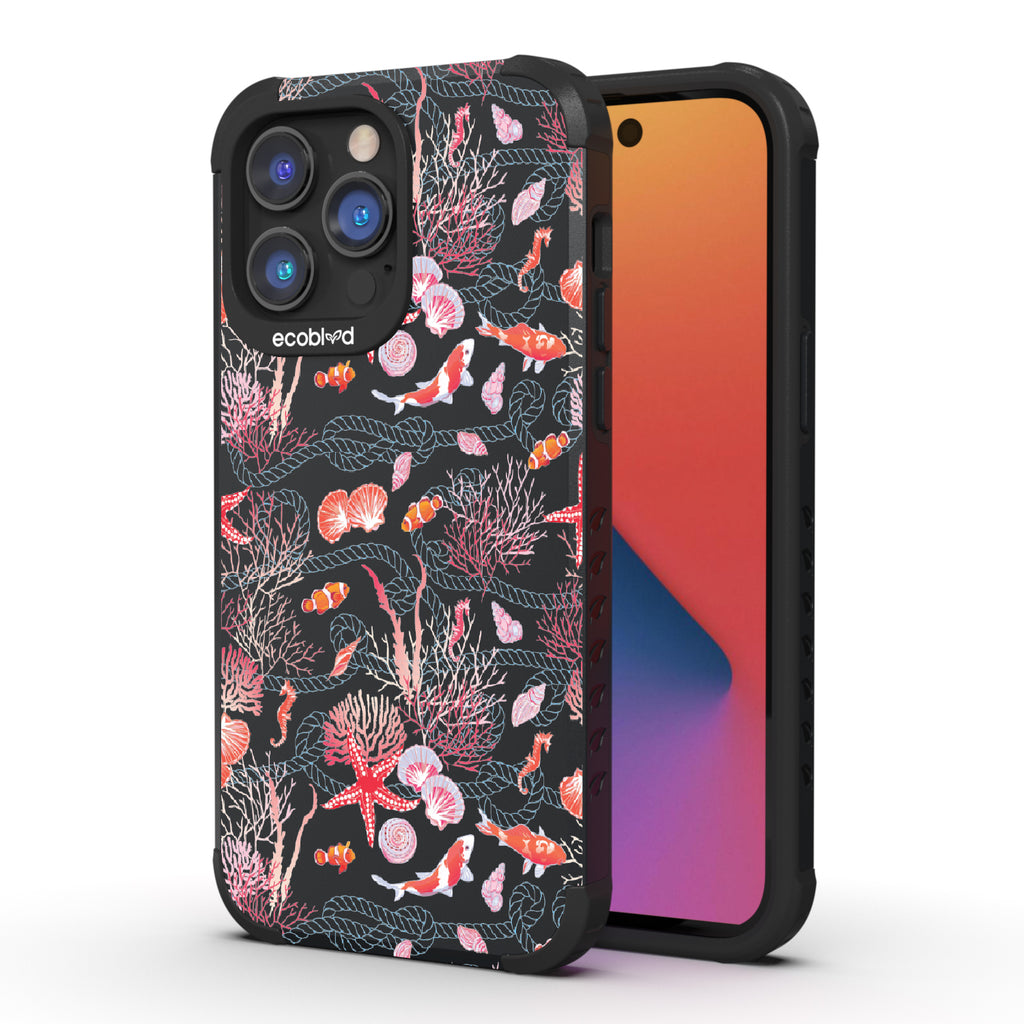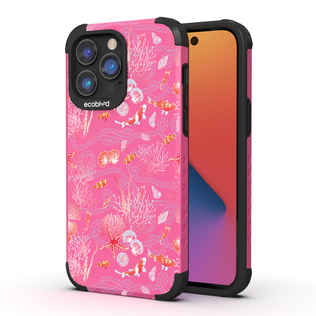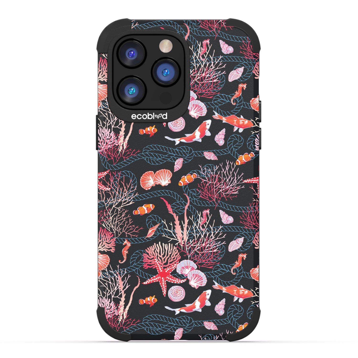 The coral is always brighter, Under the Sea! With this design our Mojave rugged and compostable iPhone 14 Pro Max phone case, you'll see, your phone’s full of glee, under the sea! Coral and critters, they all come together, swirling in hues, pinks, and blues, where life’s better wetter, take it from me! Your phone will be dancing, twirling, and prancing, carrying the magic of the ocean so fancy! So let your phone be, full of joy and glee, under the sea.