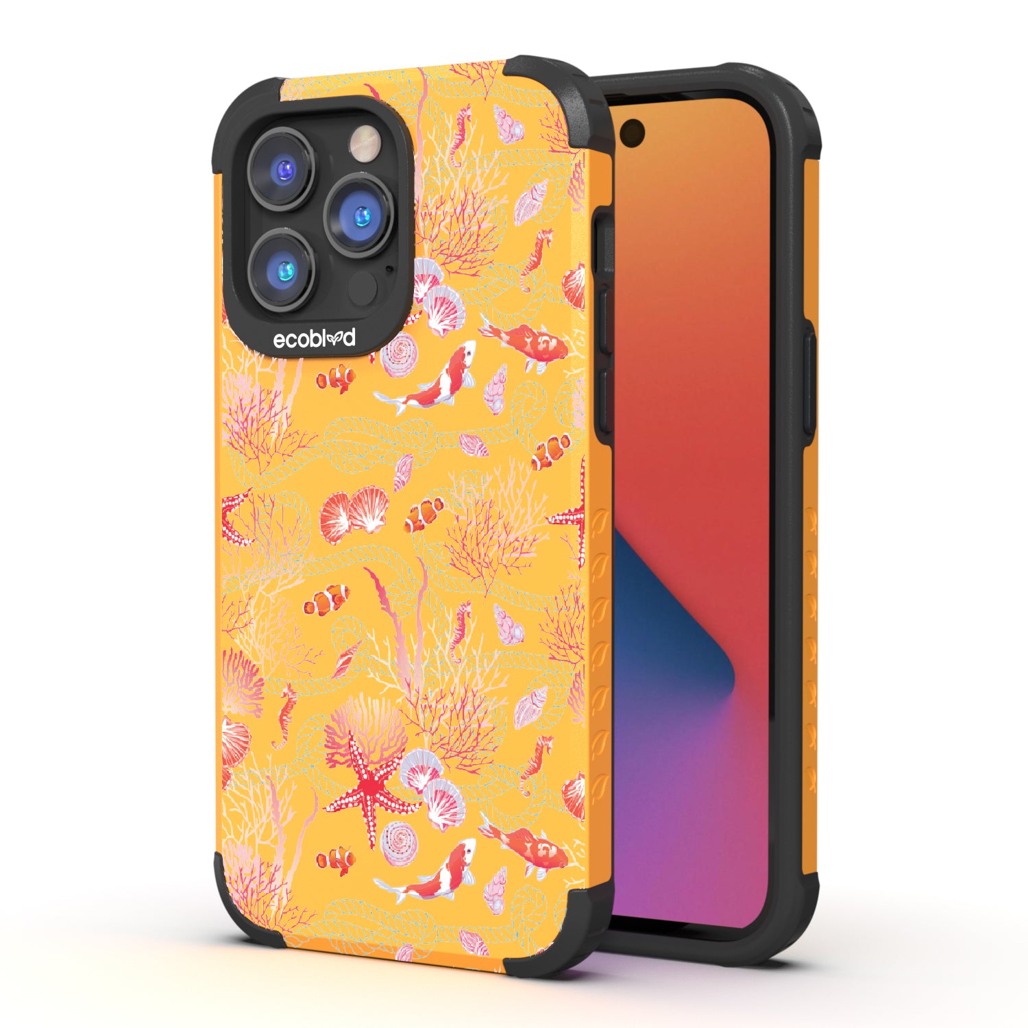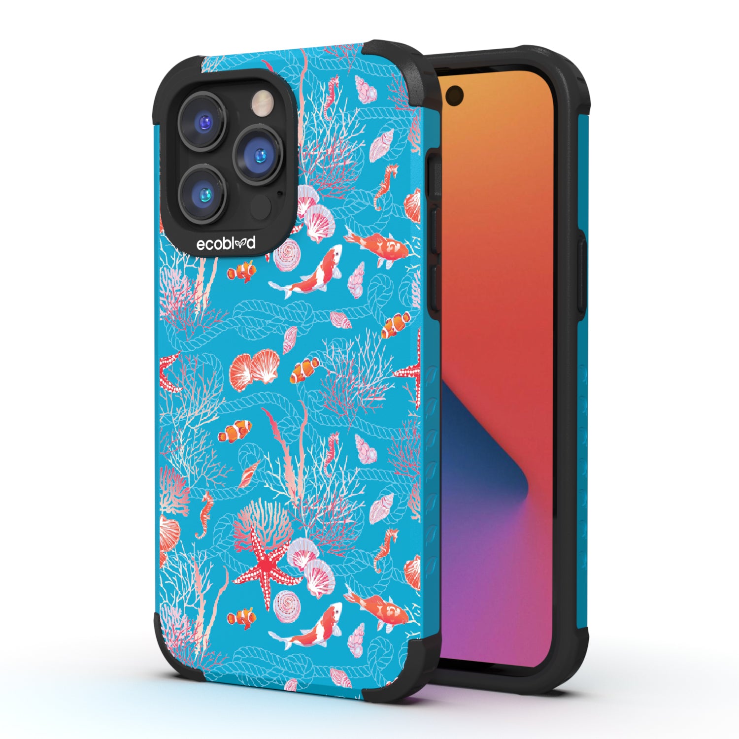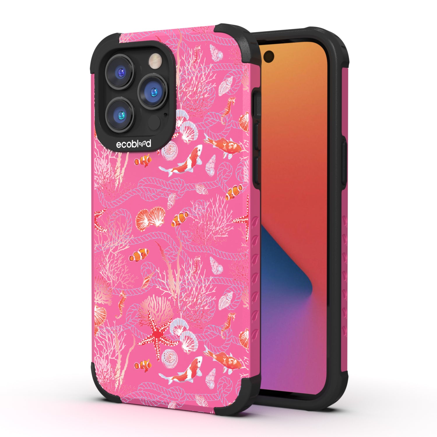 The coral is always brighter, Under the Sea! With this design our Mojave rugged and compostable iPhone 14 Pro Max phone case, you'll see, your phone’s full of glee, under the sea! Coral and critters, they all come together, swirling in hues, pinks, and blues, where life’s better wetter, take it from me! Your phone will be dancing, twirling, and prancing, carrying the magic of the ocean so fancy! So let your phone be, full of joy and glee, under the sea.