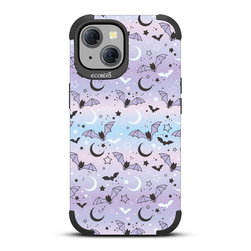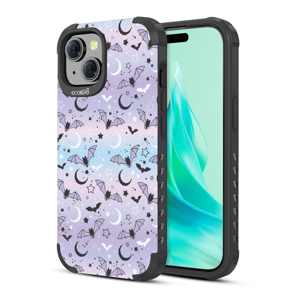 As twilight fades to darkness, the Bat Habits design comes alive on our mesmerizing Mojave rugged and compostable iPhone 15 MagSafe case, mirroring the bats as they take flight for their nocturnal rituals. Each crescent moon seems to whisper secrets to the celestial creatures, guiding them through the inky sky, while the stars above bear witness to this enchanting dance party!