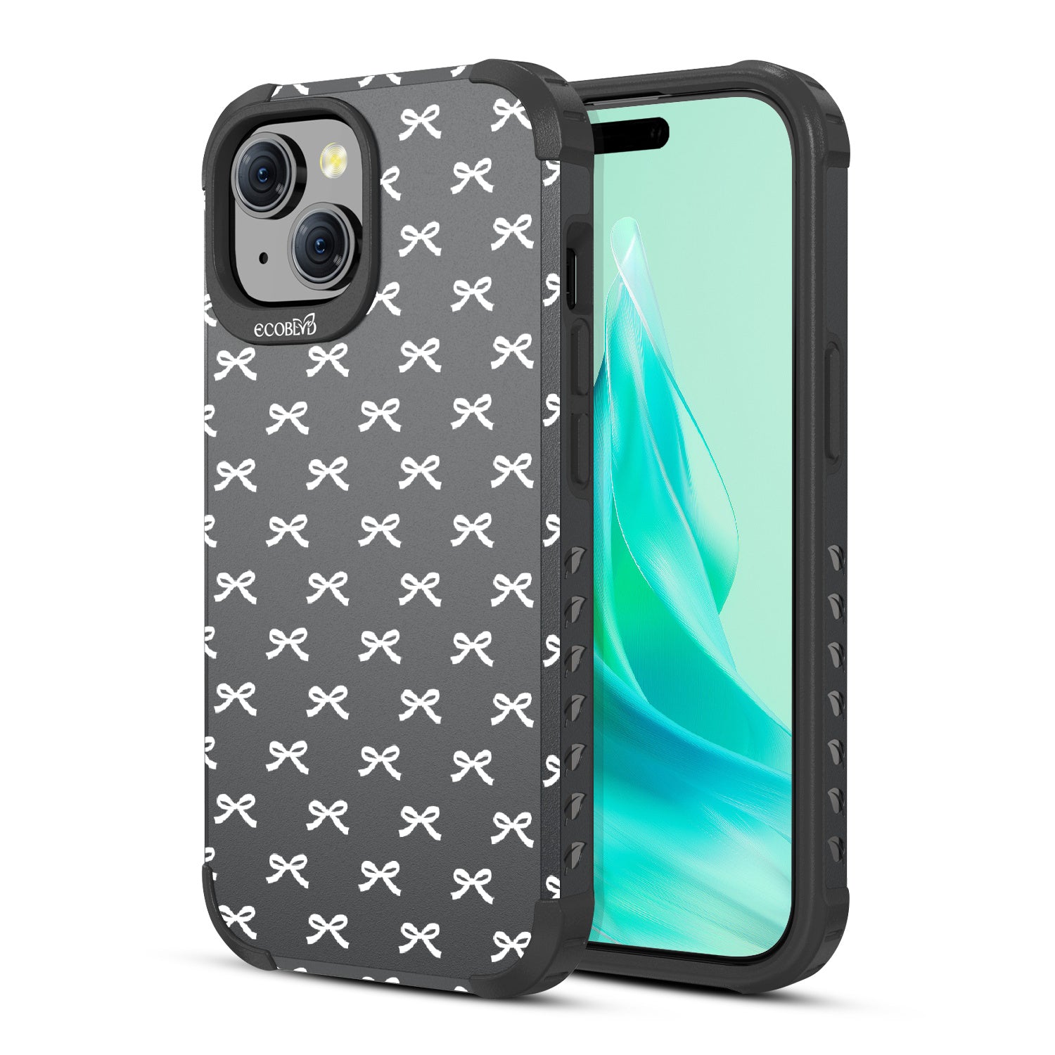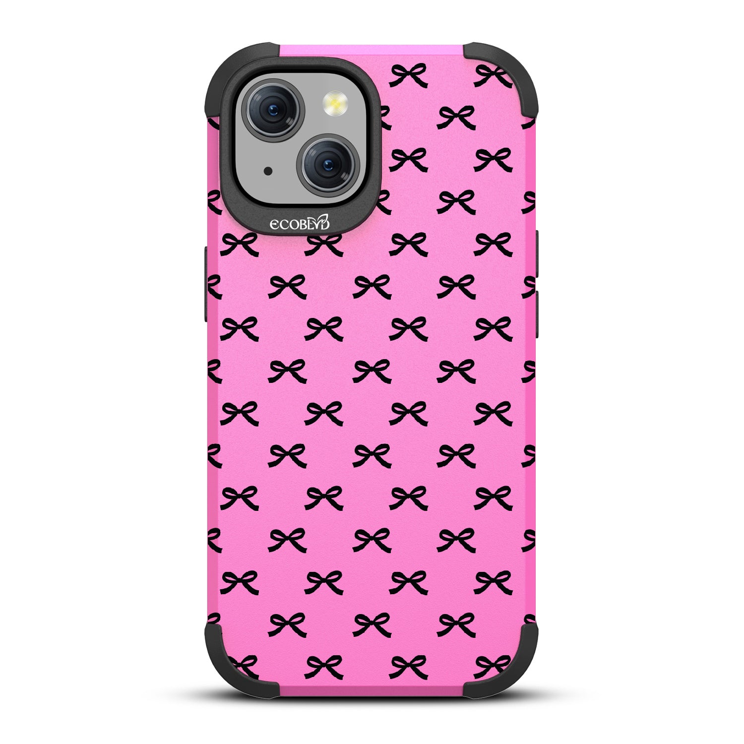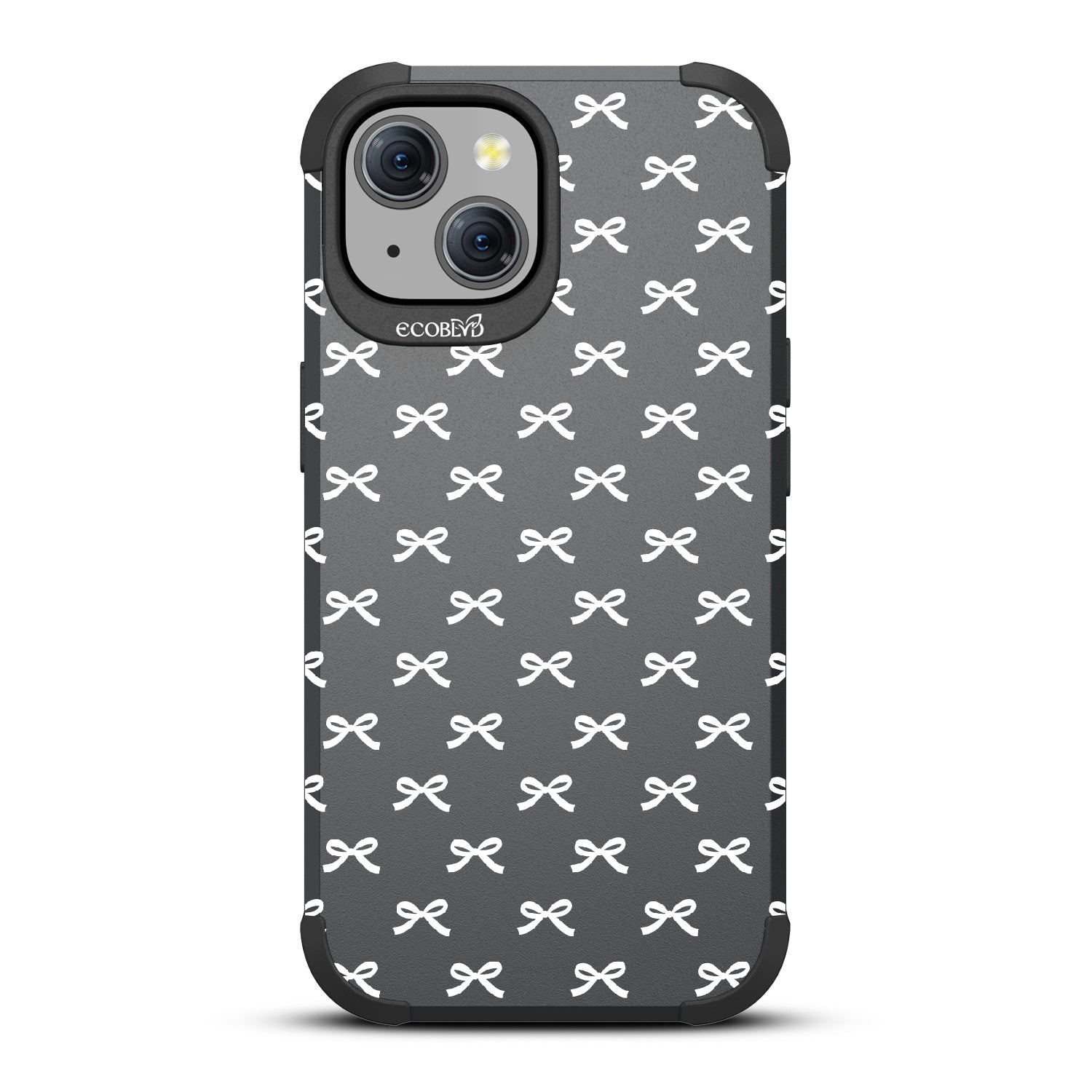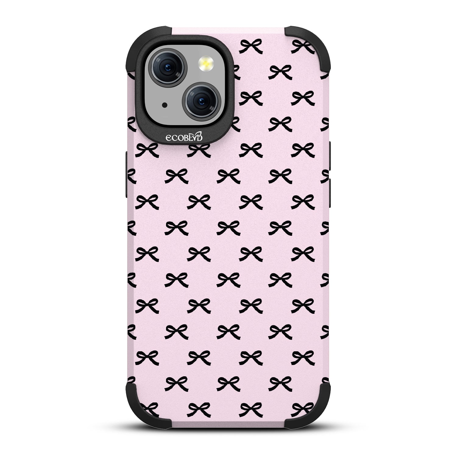 Get all dressed up to adorn and adore with the Coquette design on our Mojave rugged and compostable iPhone 15 MagSafe case. Let the cute black bows be the stars of the show, gracing your phone with their dainty presence. As you hold your device, you'll feel the subtle embrace of everlasting bonds formed by each dainty knot, creating a sense of feminine connection and girlhood that goes beyond mere aesthetics.