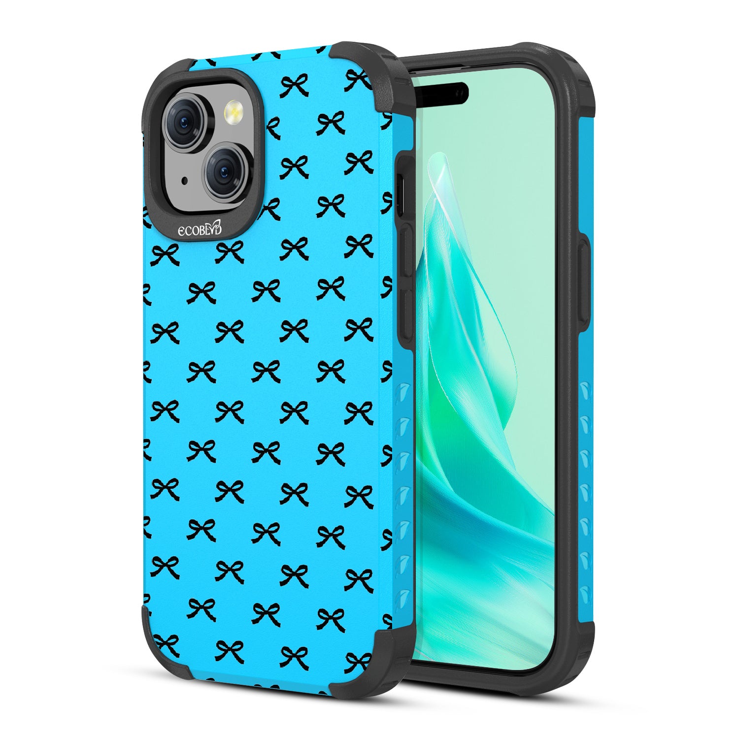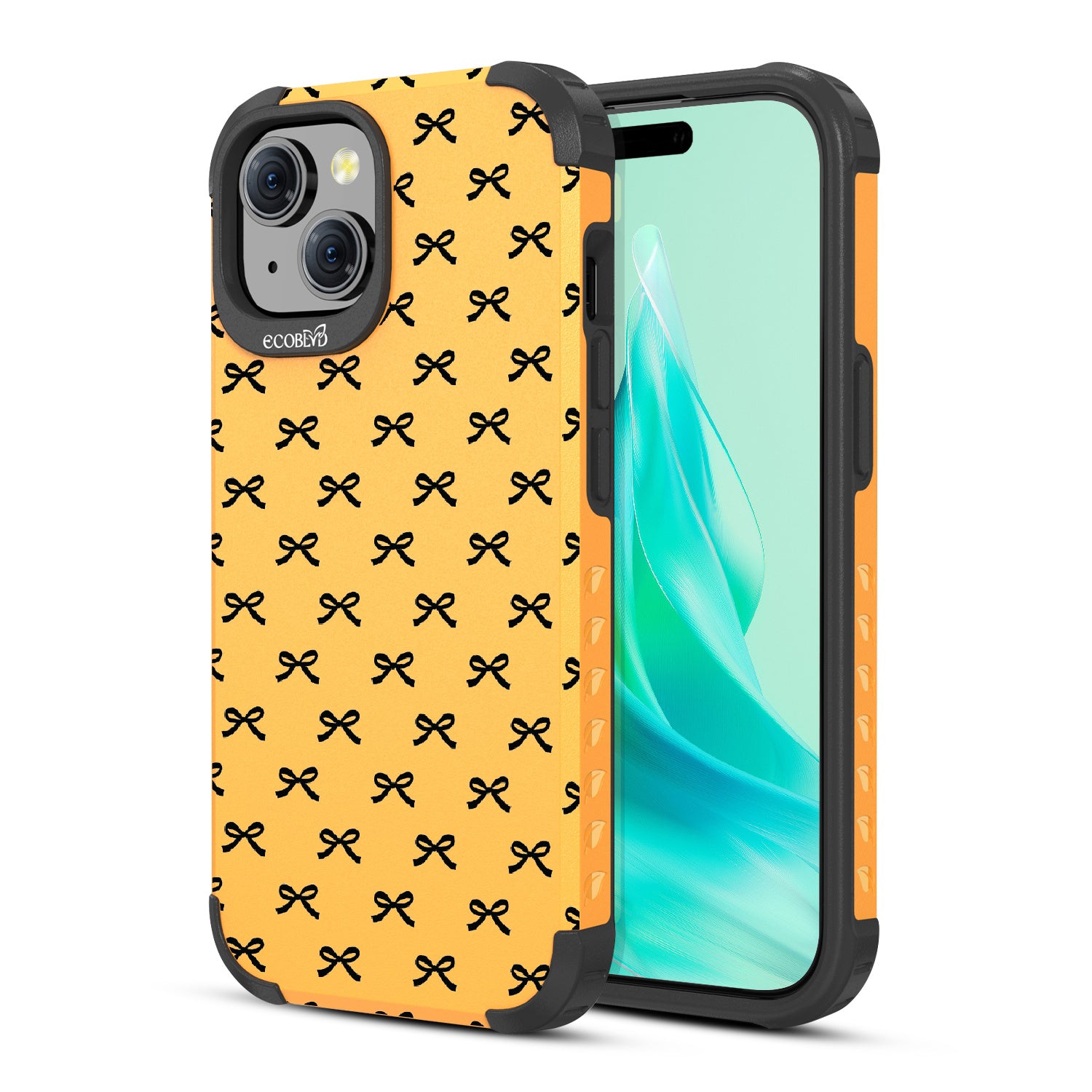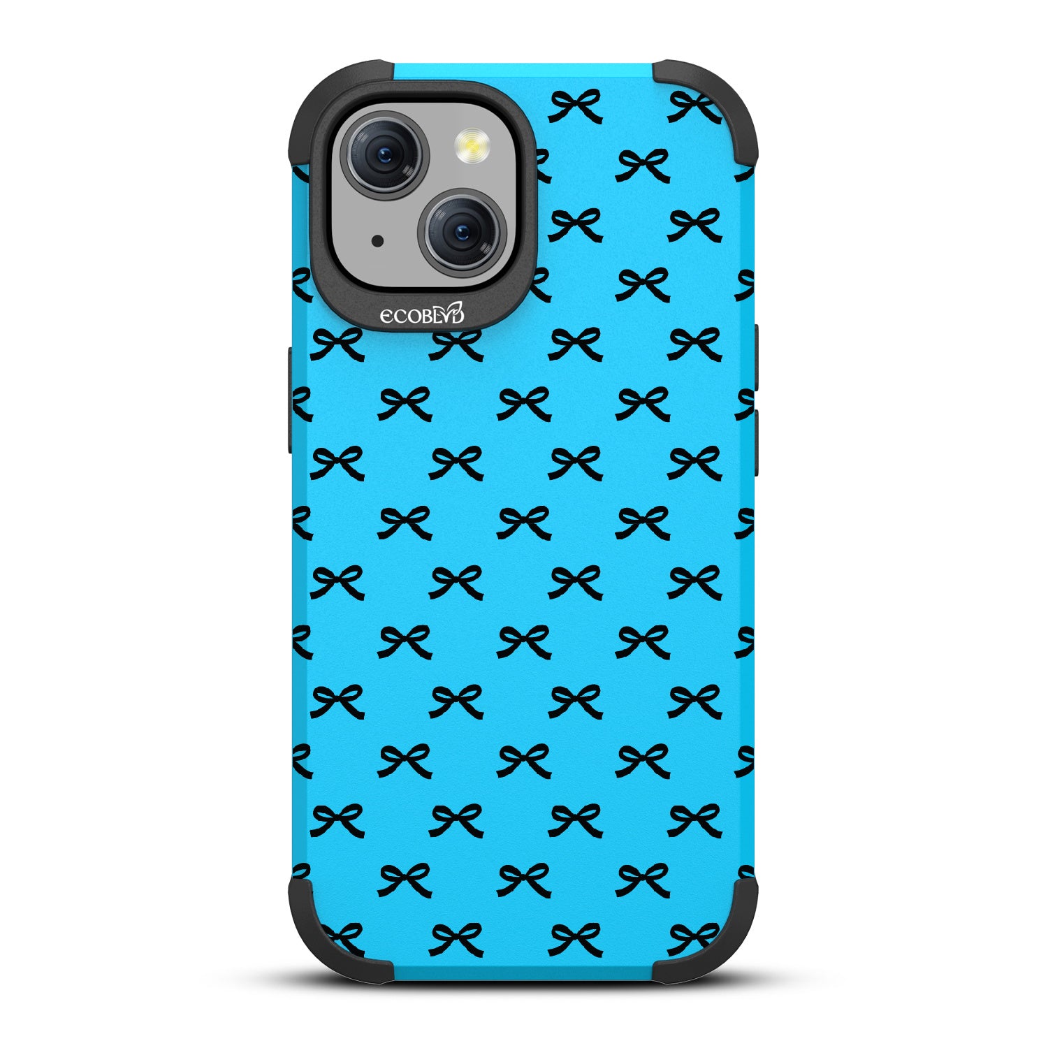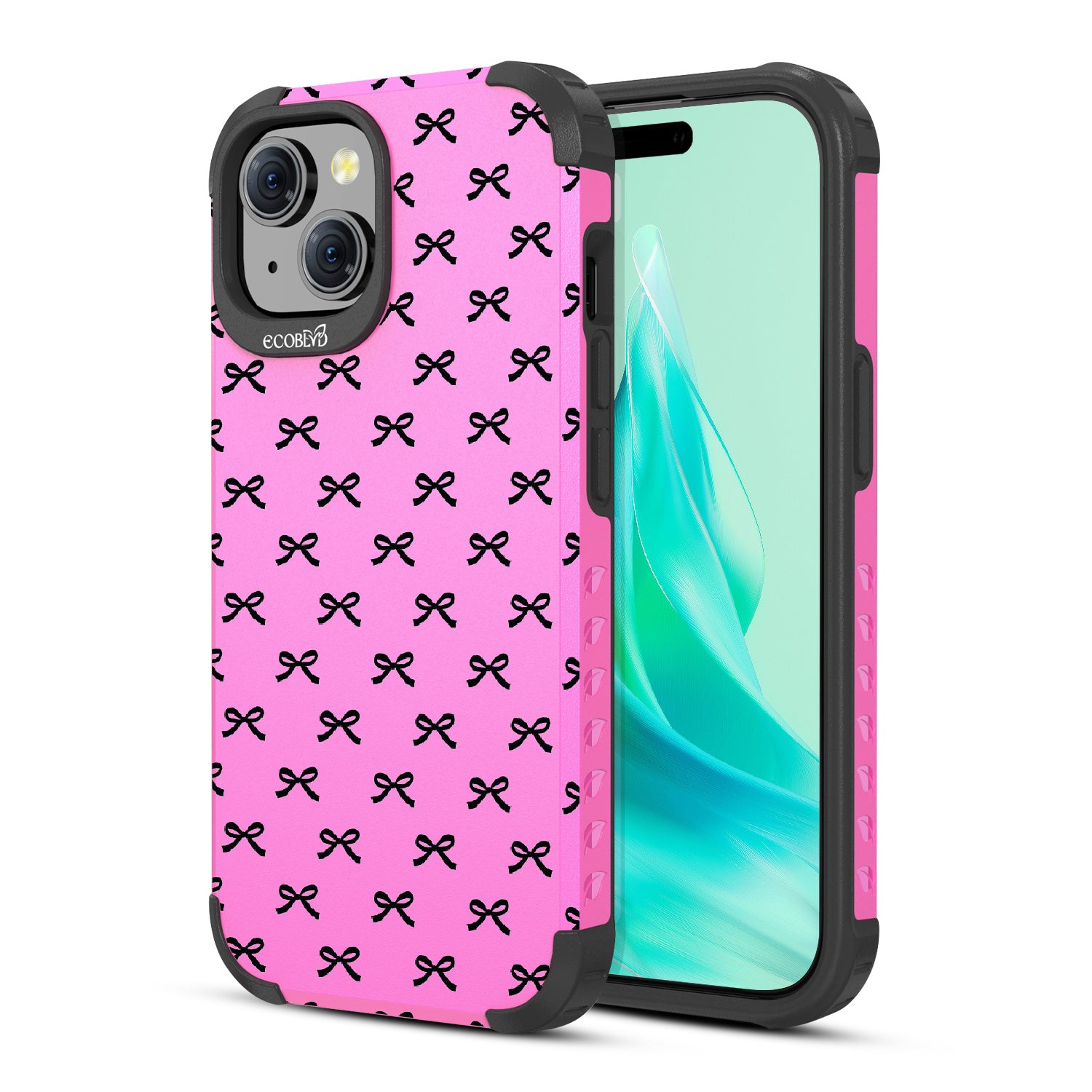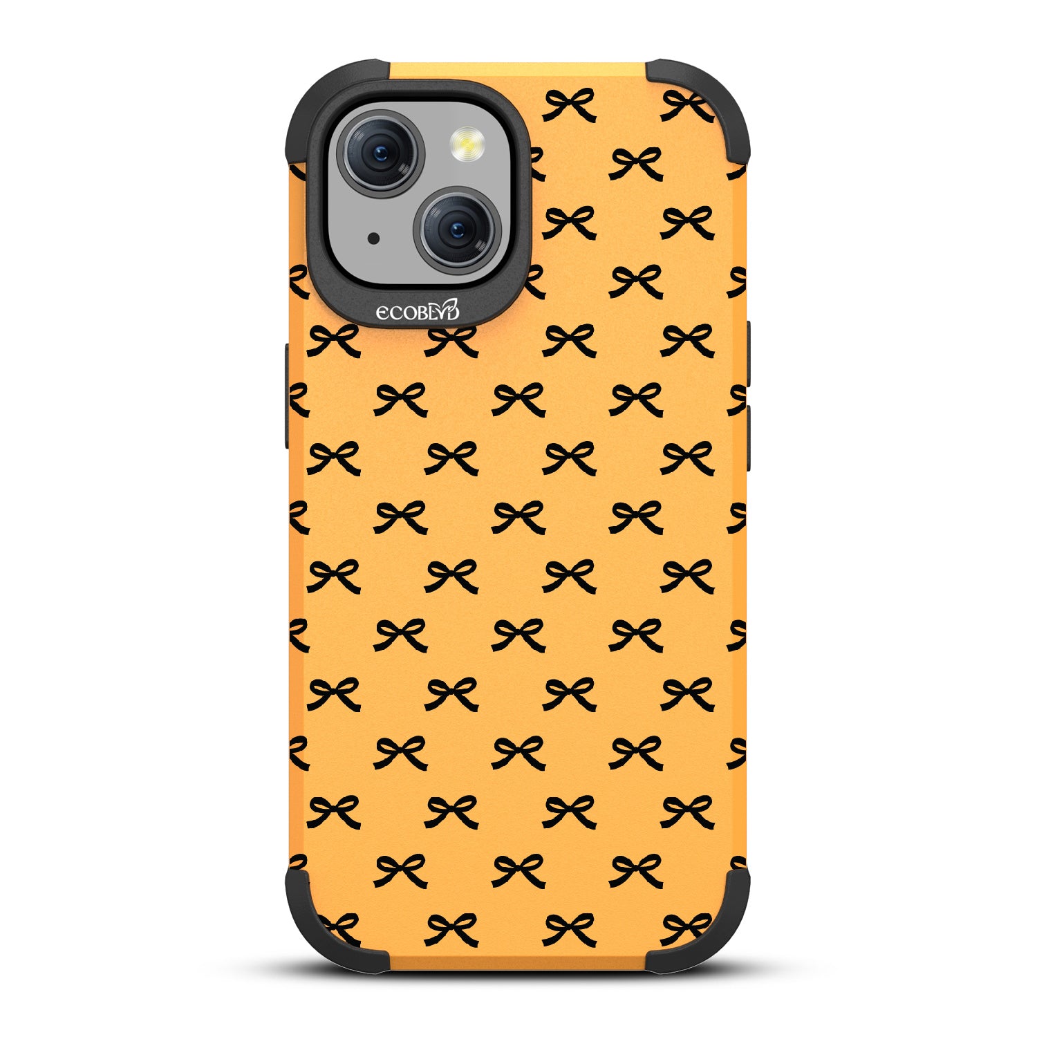 Get all dressed up to adorn and adore with the Coquette design on our Mojave rugged and compostable iPhone 15 MagSafe case. Let the cute black bows be the stars of the show, gracing your phone with their dainty presence. As you hold your device, you'll feel the subtle embrace of everlasting bonds formed by each dainty knot, creating a sense of feminine connection and girlhood that goes beyond mere aesthetics.