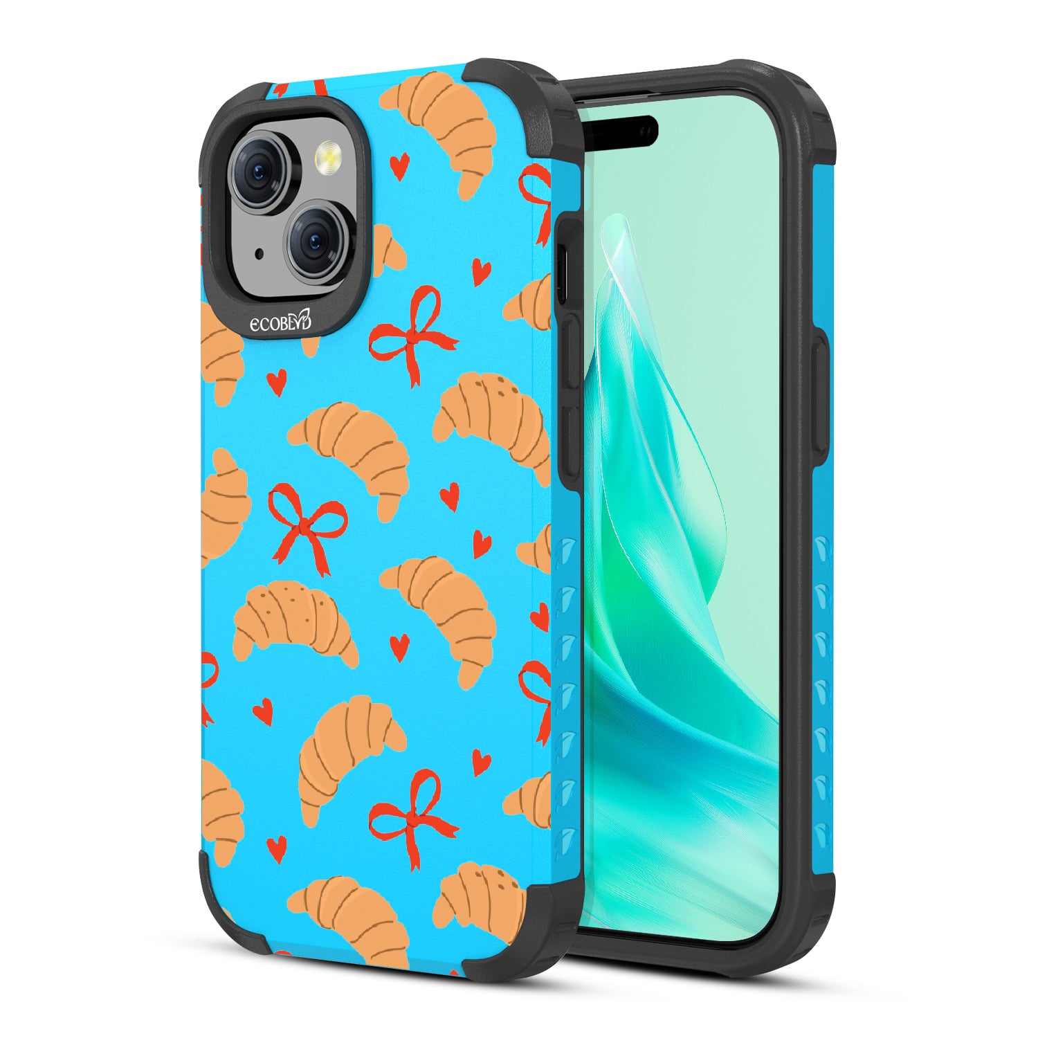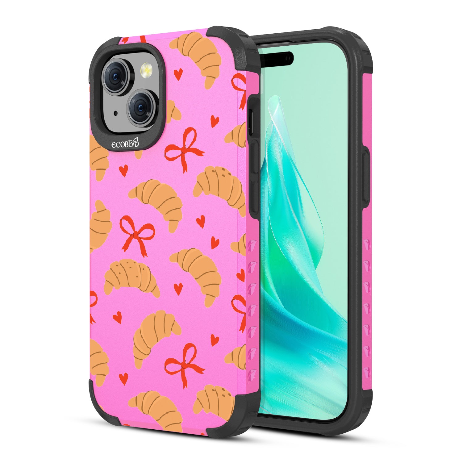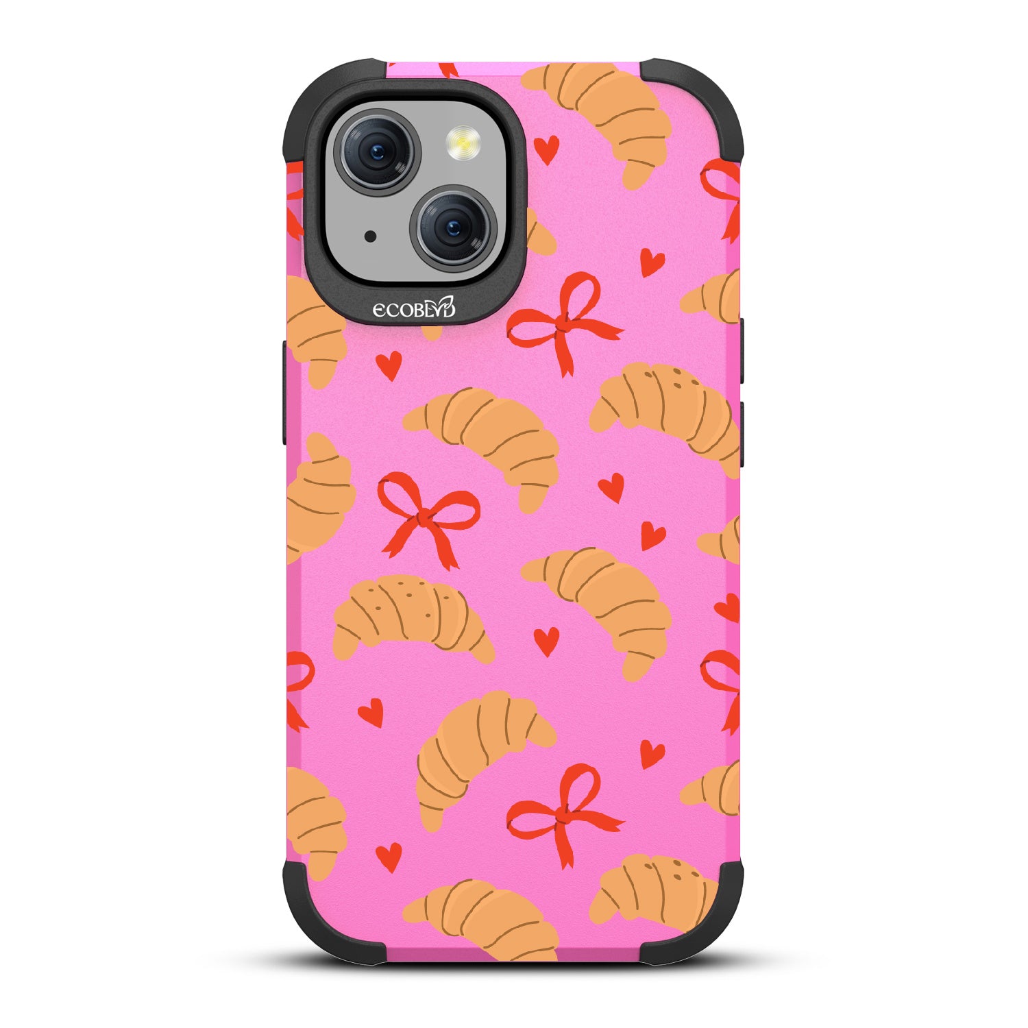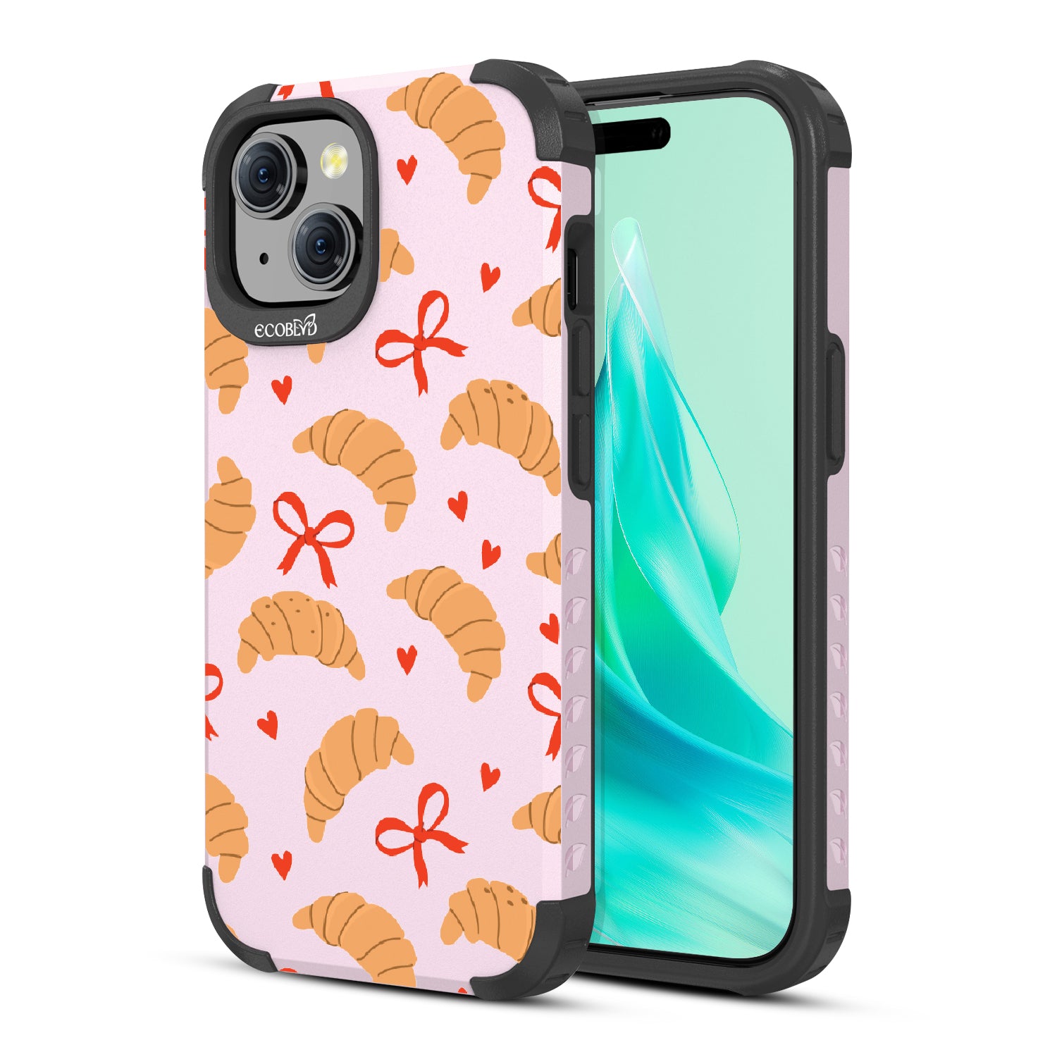Good taste deserves the perfect recipe like the Croissant Couture design on our Mojave rugged and compostable iPhone 15 case! Softly folded croissants, tied with dainty red bows and sprinkled with sweet hearts, evoke the lightness and care of a true delicacy.