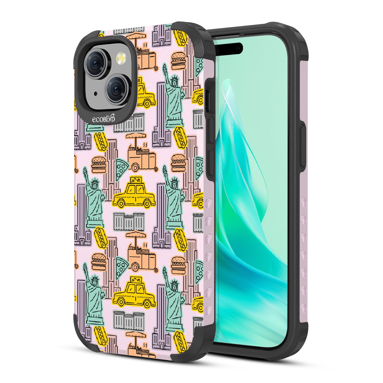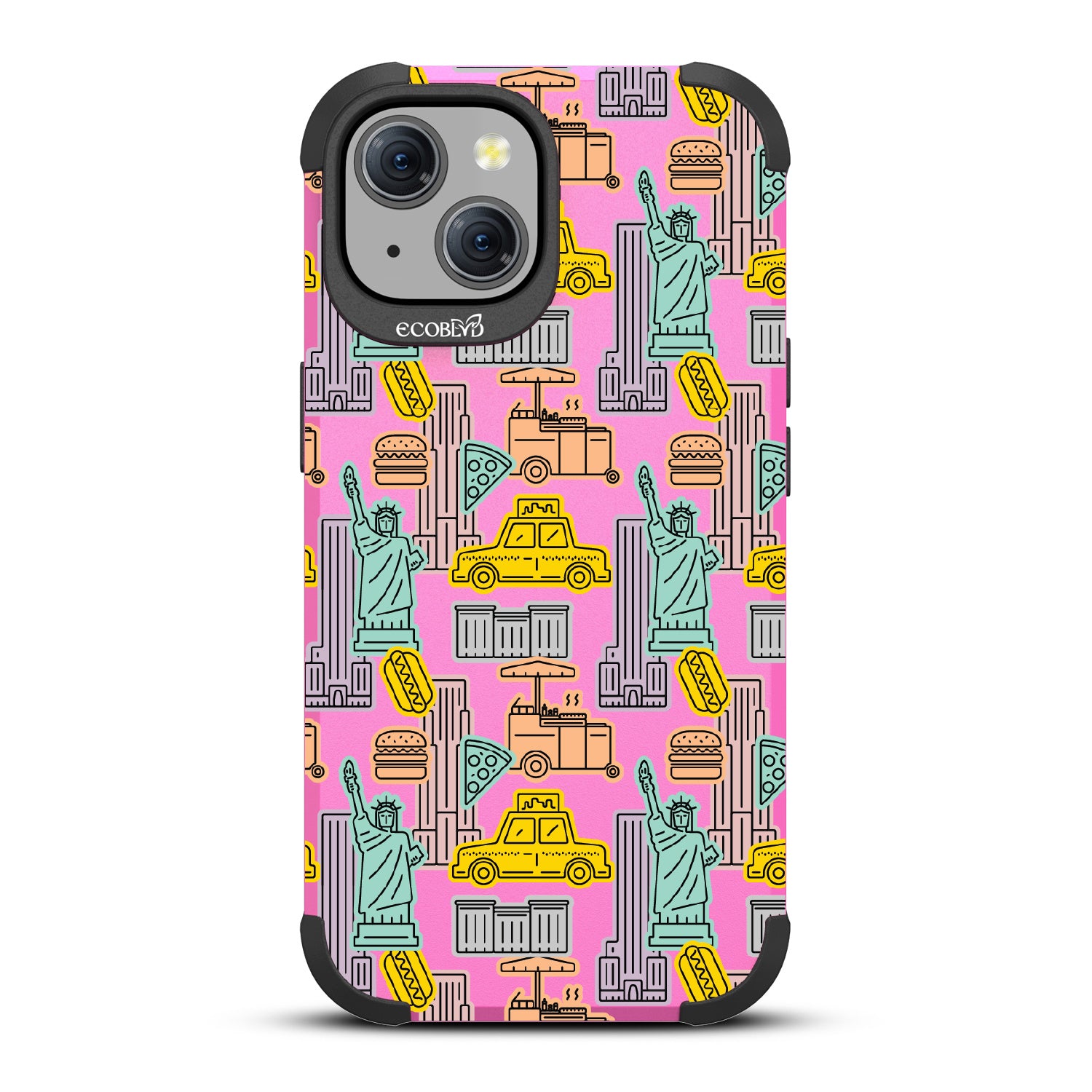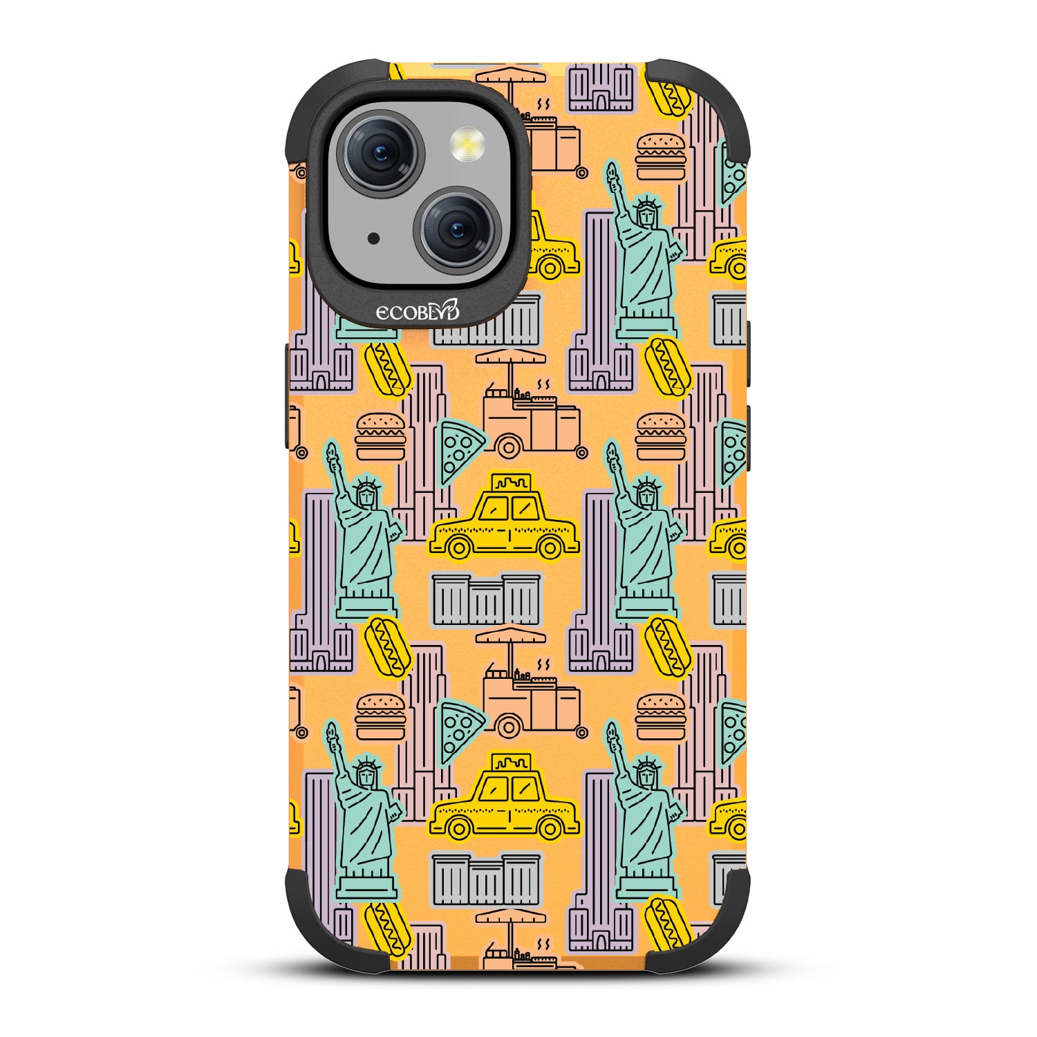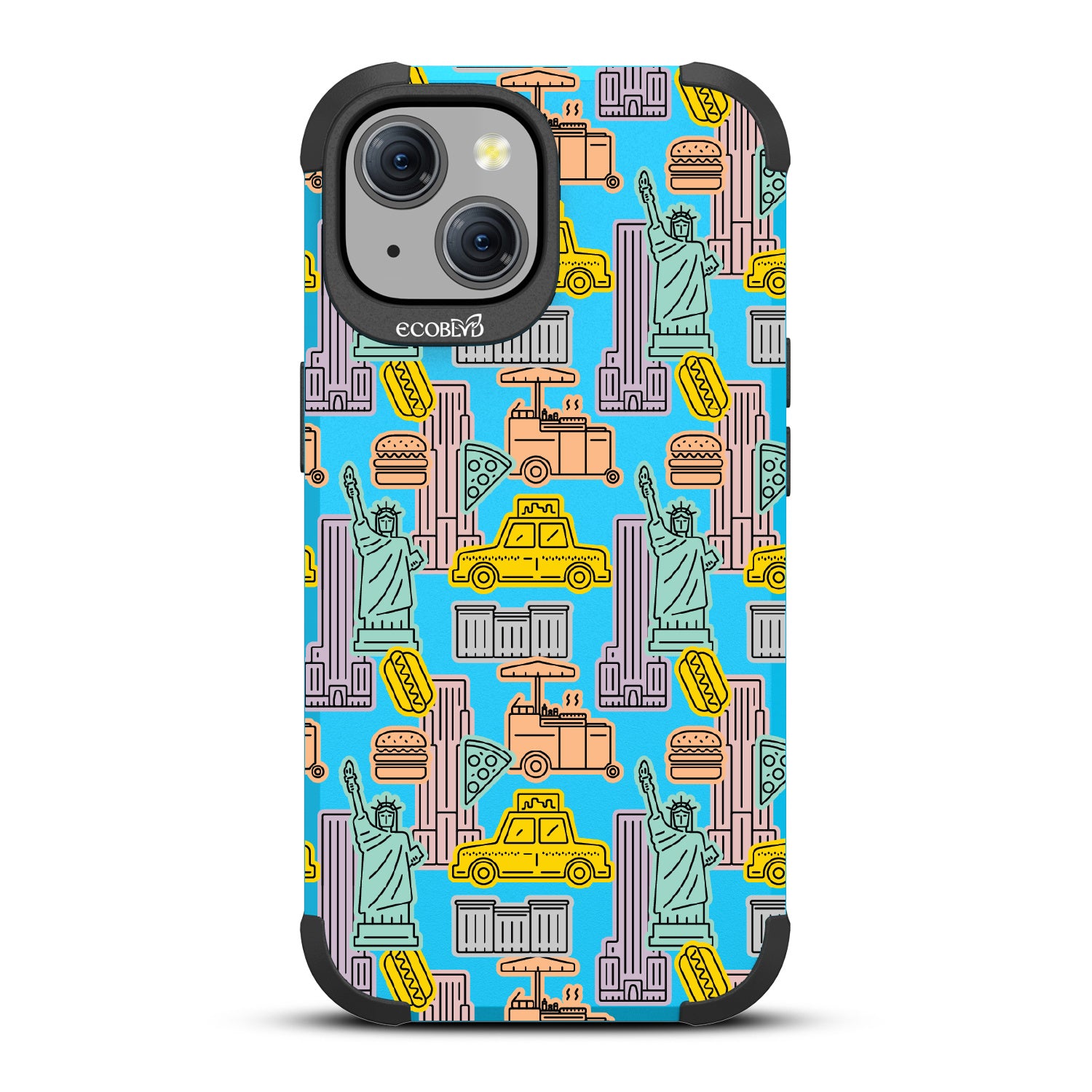 Capture the buzz of the city that never sleeps with the New York Minute design on our Mojave rugged iPhone 15 MagSafe case. It's a slice of the Big Apple, with iconic yellow cabs, steaming hotdogs, and Lady Liberty herself, all wrapped up in that unmistakable NYC rhythm.