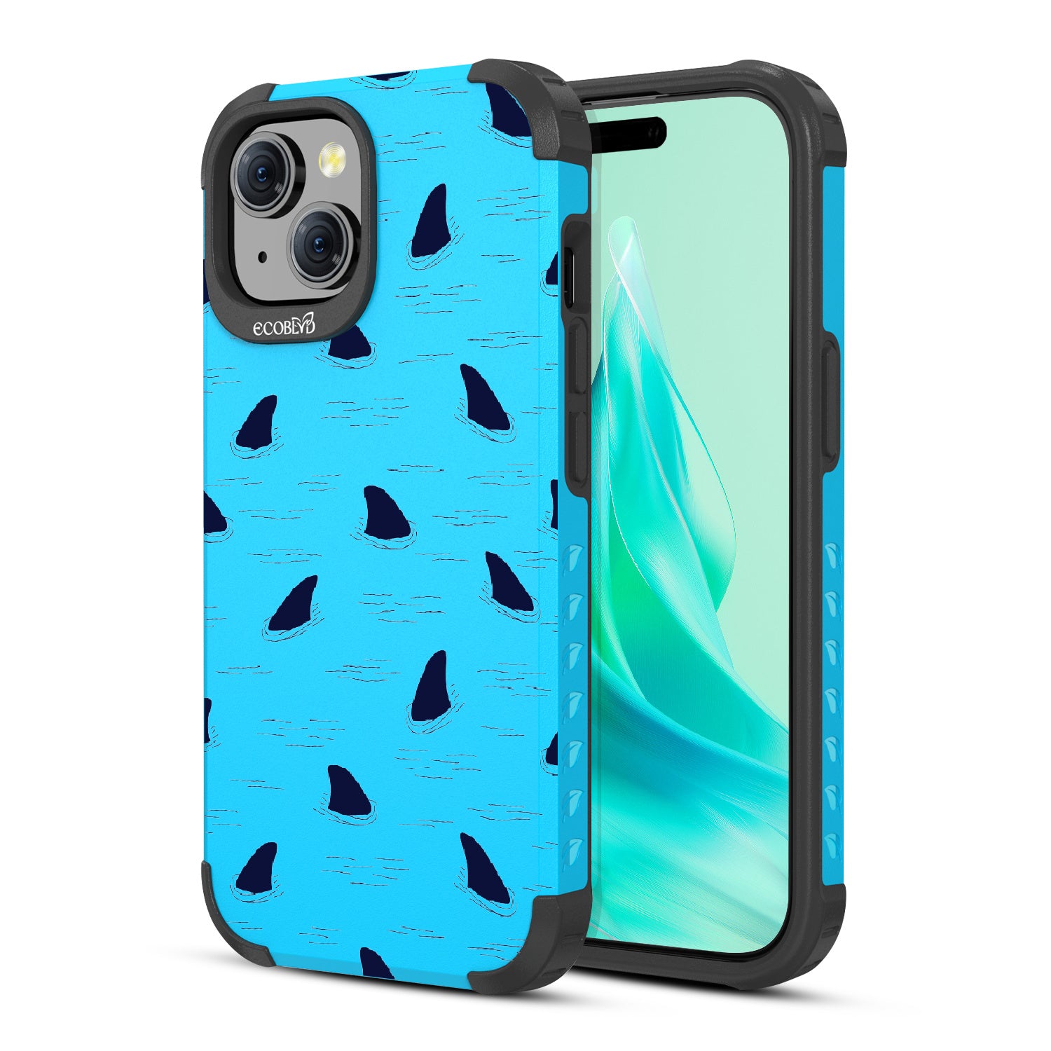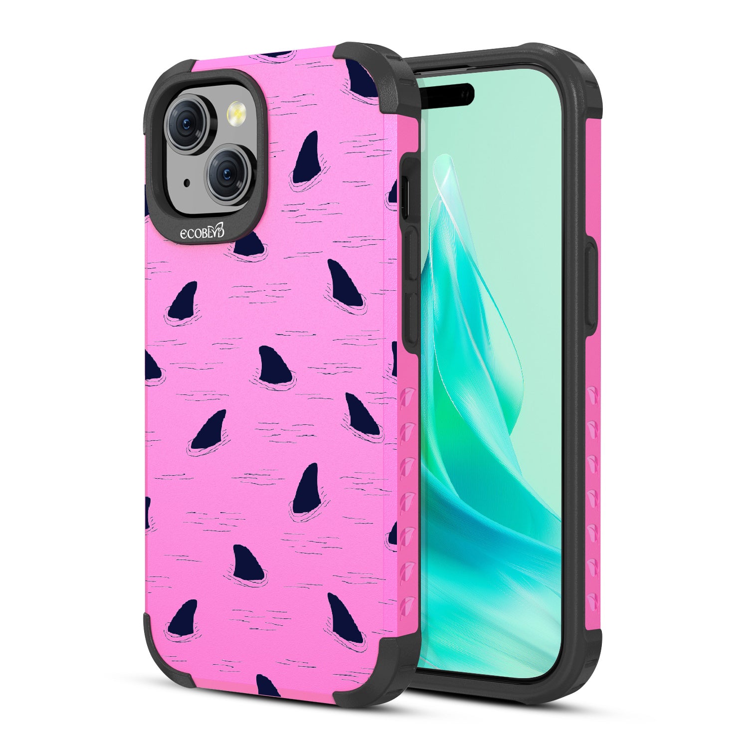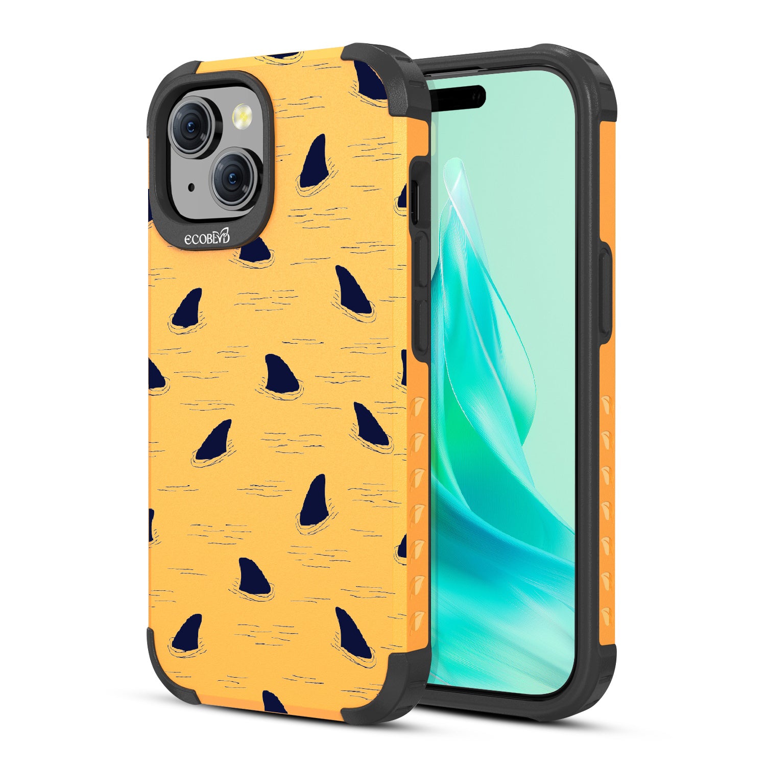 You never know what could be lurking around your phone as the Shark Fin design on our Mojave rugged and compostable iPhone 15 case surrounds it with an adrenaline-pumping look that shows off your fearless side and your bold spirit - brave enough to swim with sharks. Available in five colorways: Midnight Black, Cascade Blue, Wildflower Pink, Illuminating Yellow, and the exclusive Pastel Lilac!
