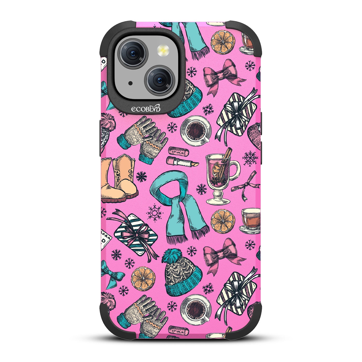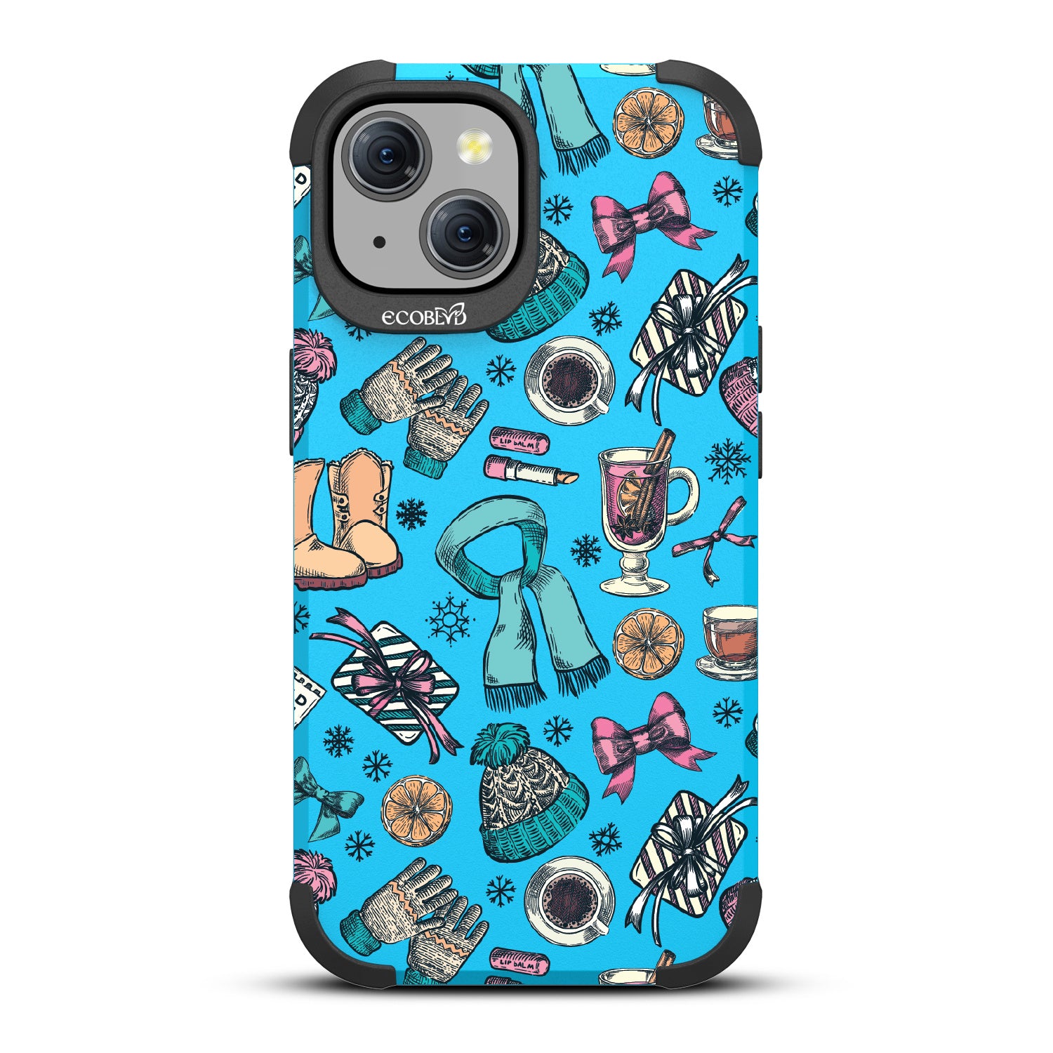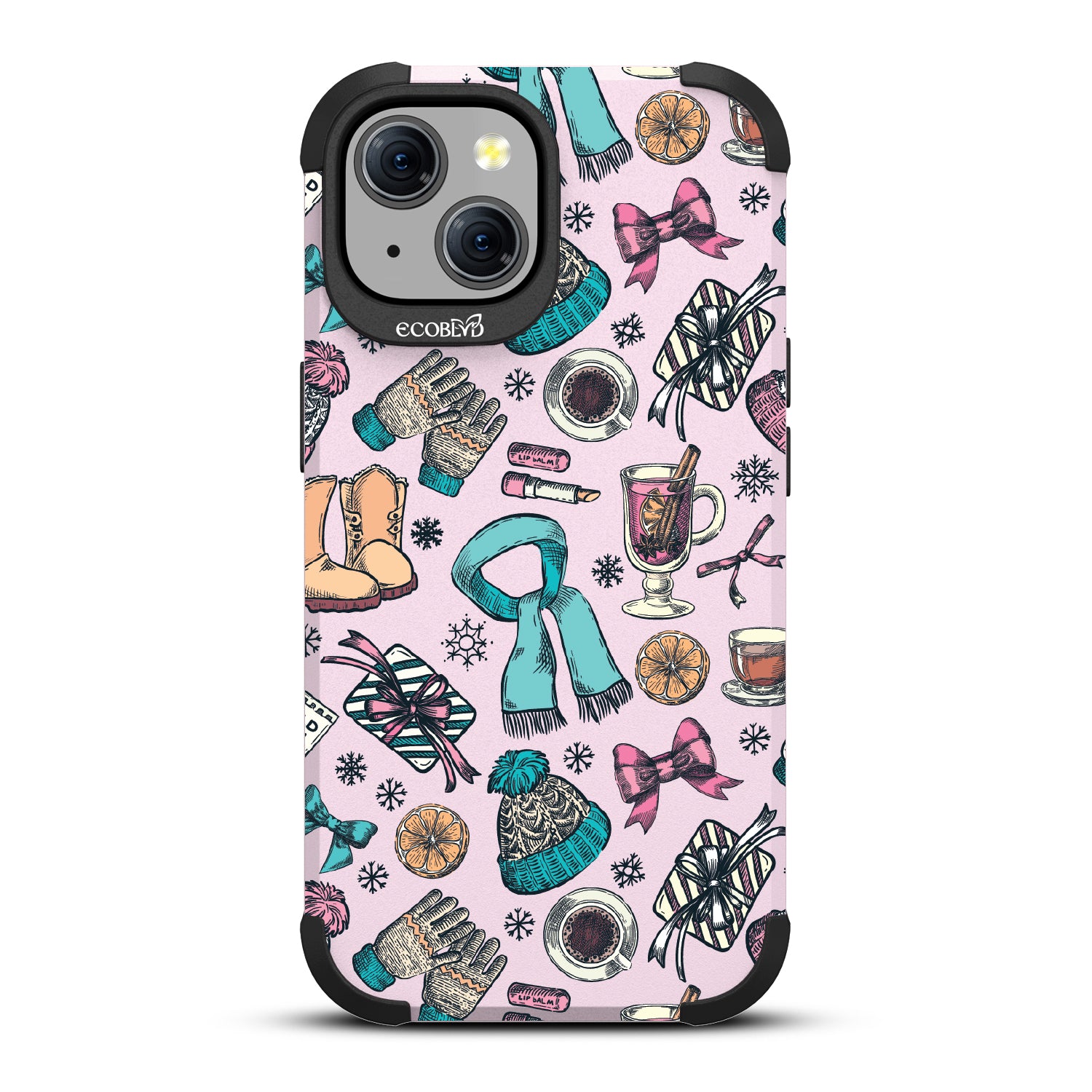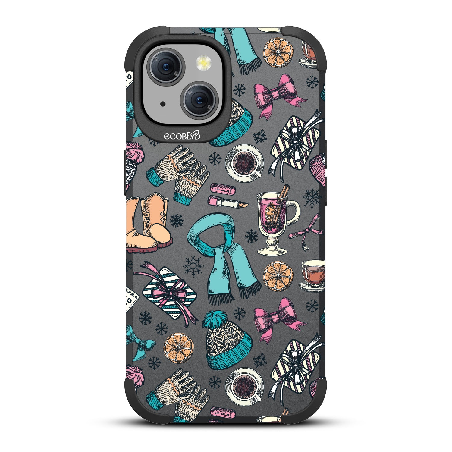 Keeping your phone warm this time of year has never been easier thanks to the Winter Essentials design on our Mojave rugged and compostable iPhone 15 MagSafe case, which includes beanies, scarves, mittens, furry boots, and hot drinks always at your fingertips.