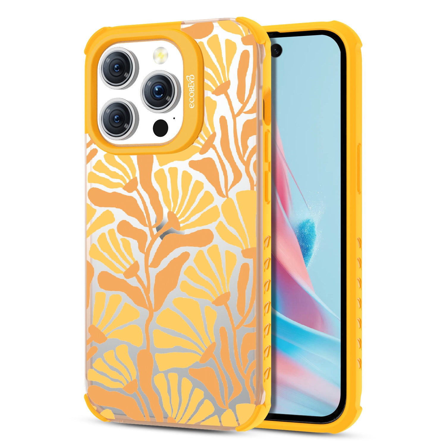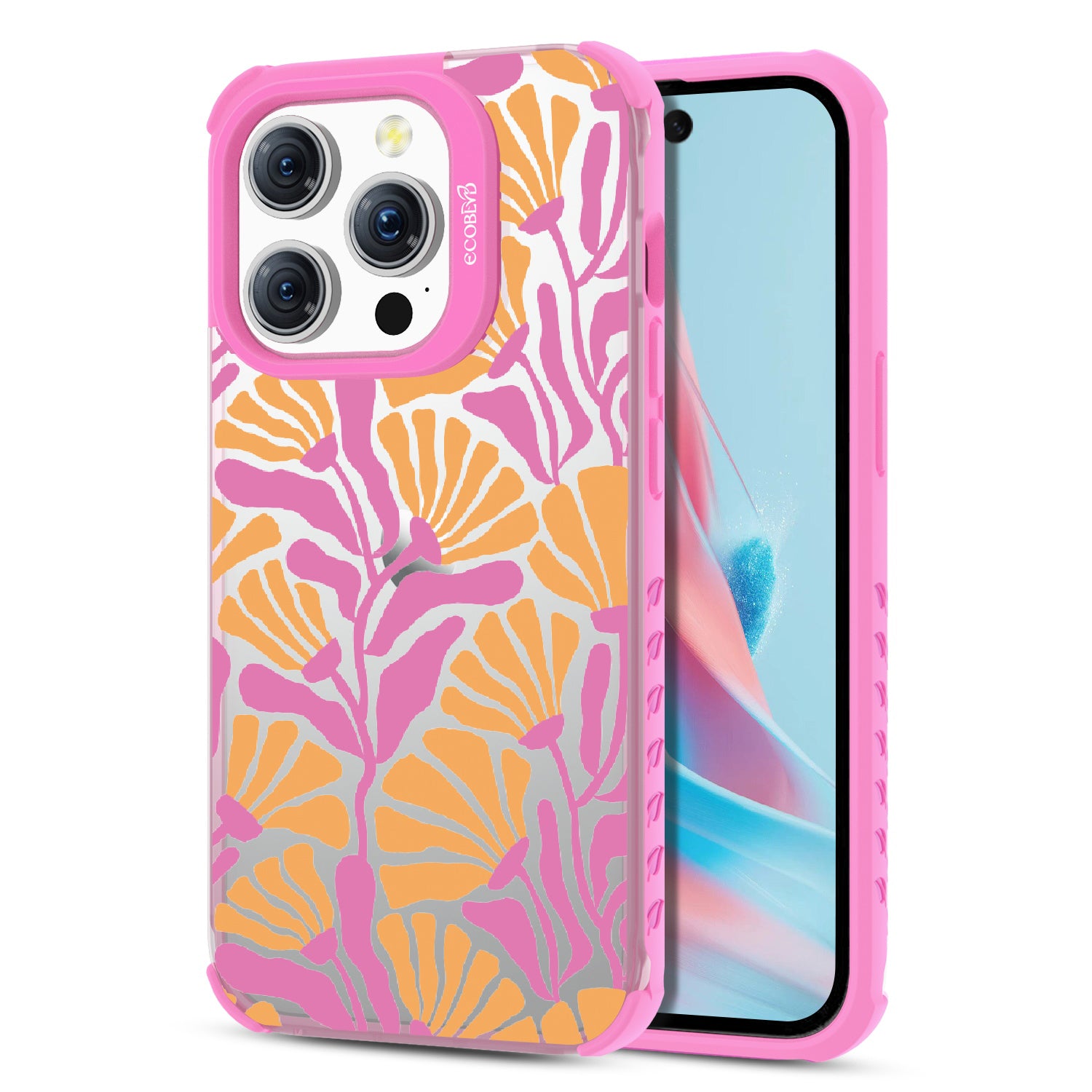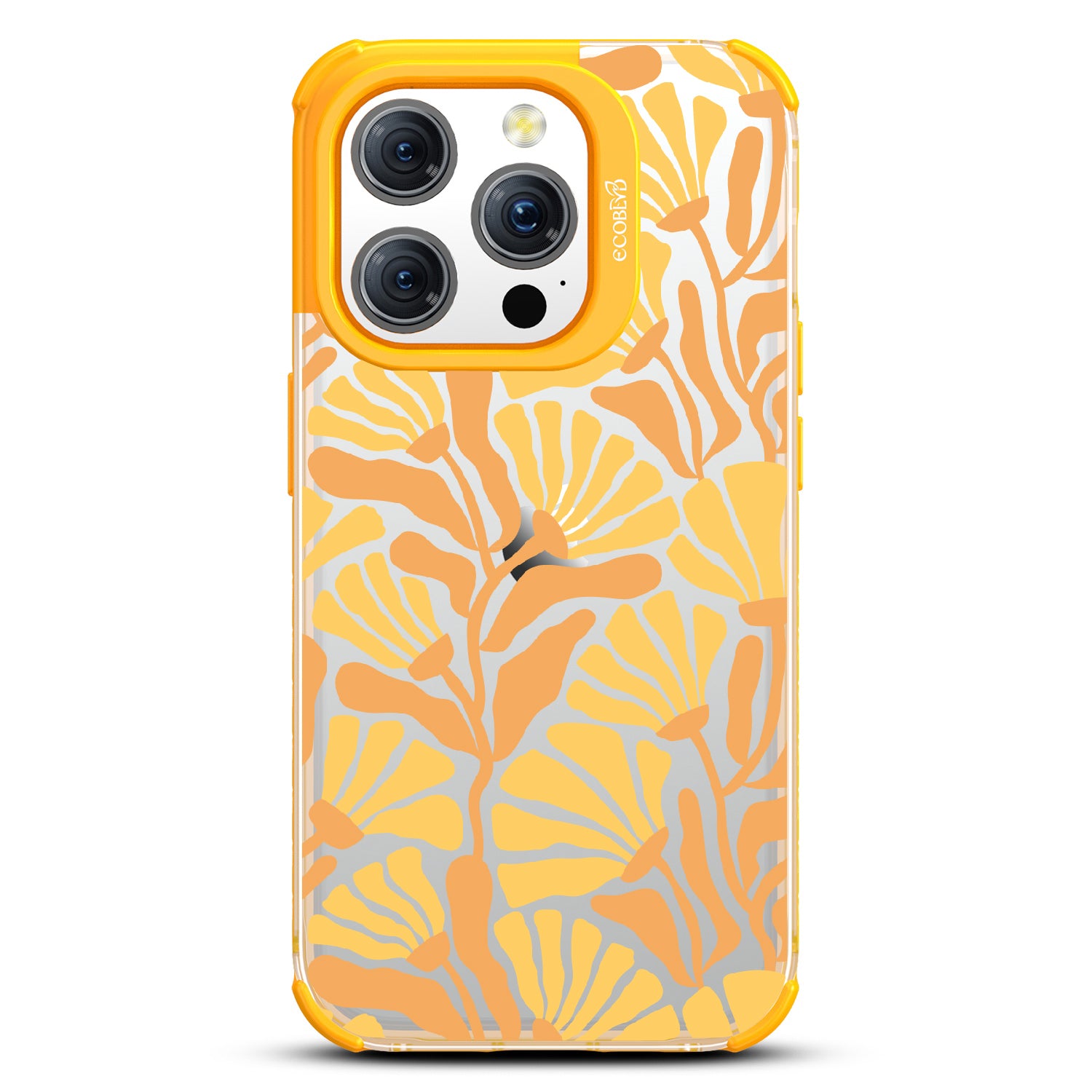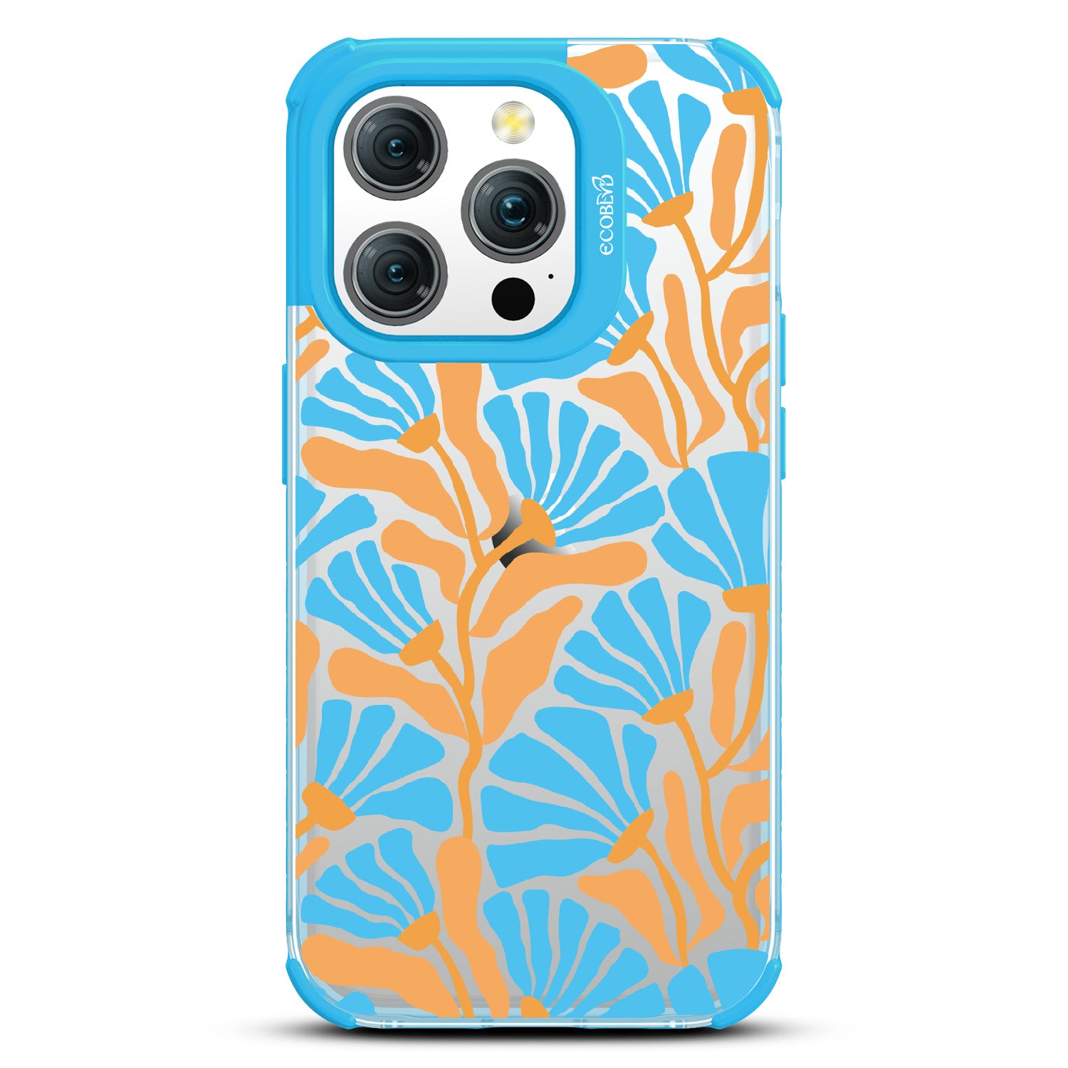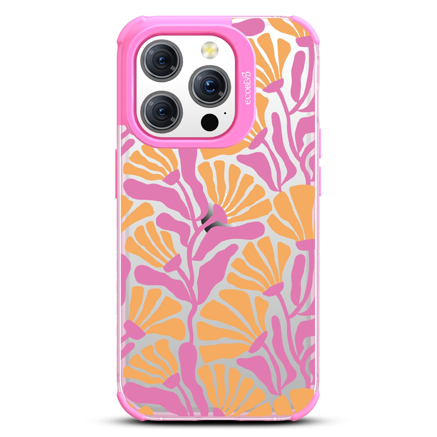 Experience the beauty of paradise in the palm of your hand with the Floral Escape design on our Laguna clear iPhone 15 Pro case; a breathtaking, eye-catching design with a mix of tropical colors and floral elements, like a retro Hawaiian shirt print and vintage botanical travel posters, perfect for a tropical Spring Break getaway in three colors: Cascade Blue, Illuminating Yellow, and Wildflower Pink.