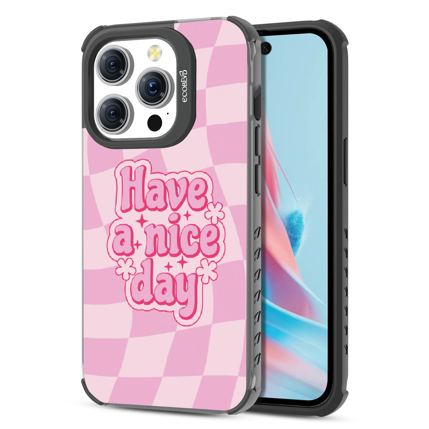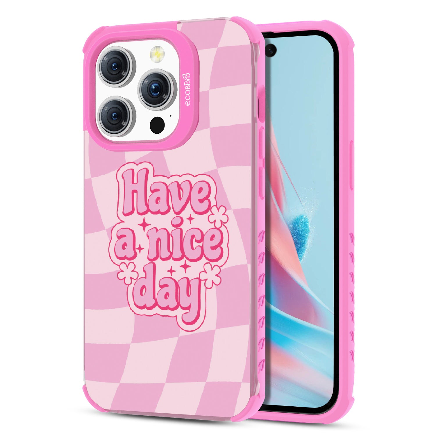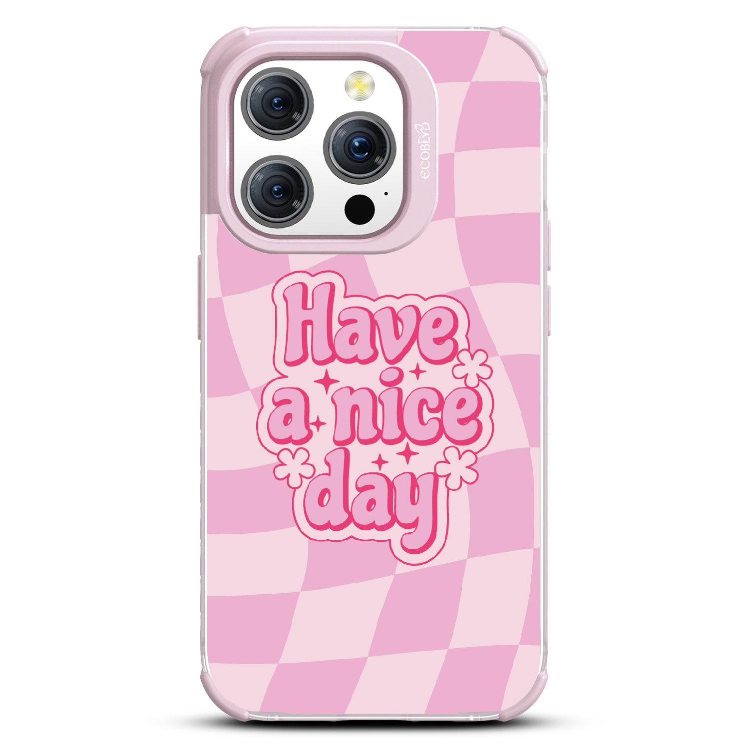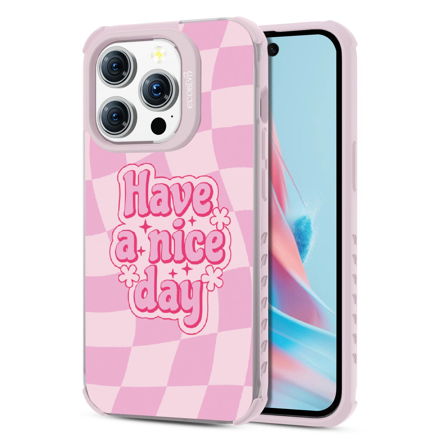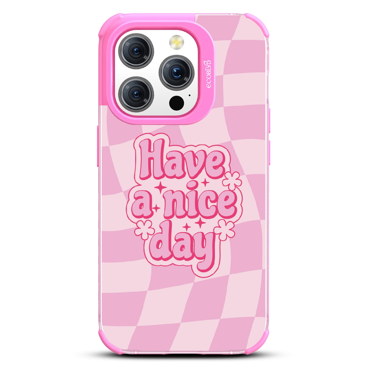 Set the stage for a brighter day with the Have A Nice Day design on our Laguna clear iPhone 15 Pro phone case, featuring an eye-catching wavy checker print pattern. This daily reminder gives an uplifting atmosphere your phone needs, making every day a nice day filled with positivity.
