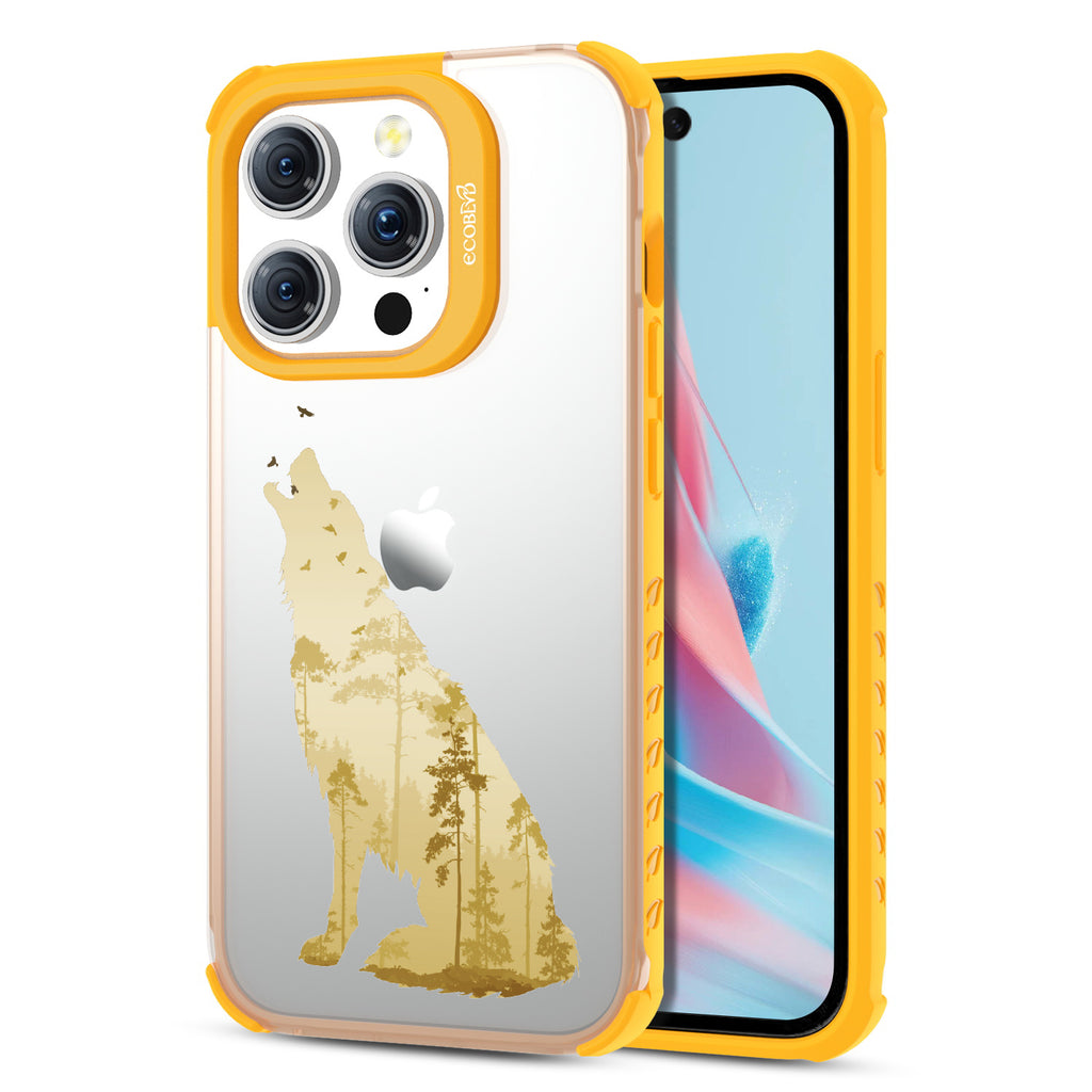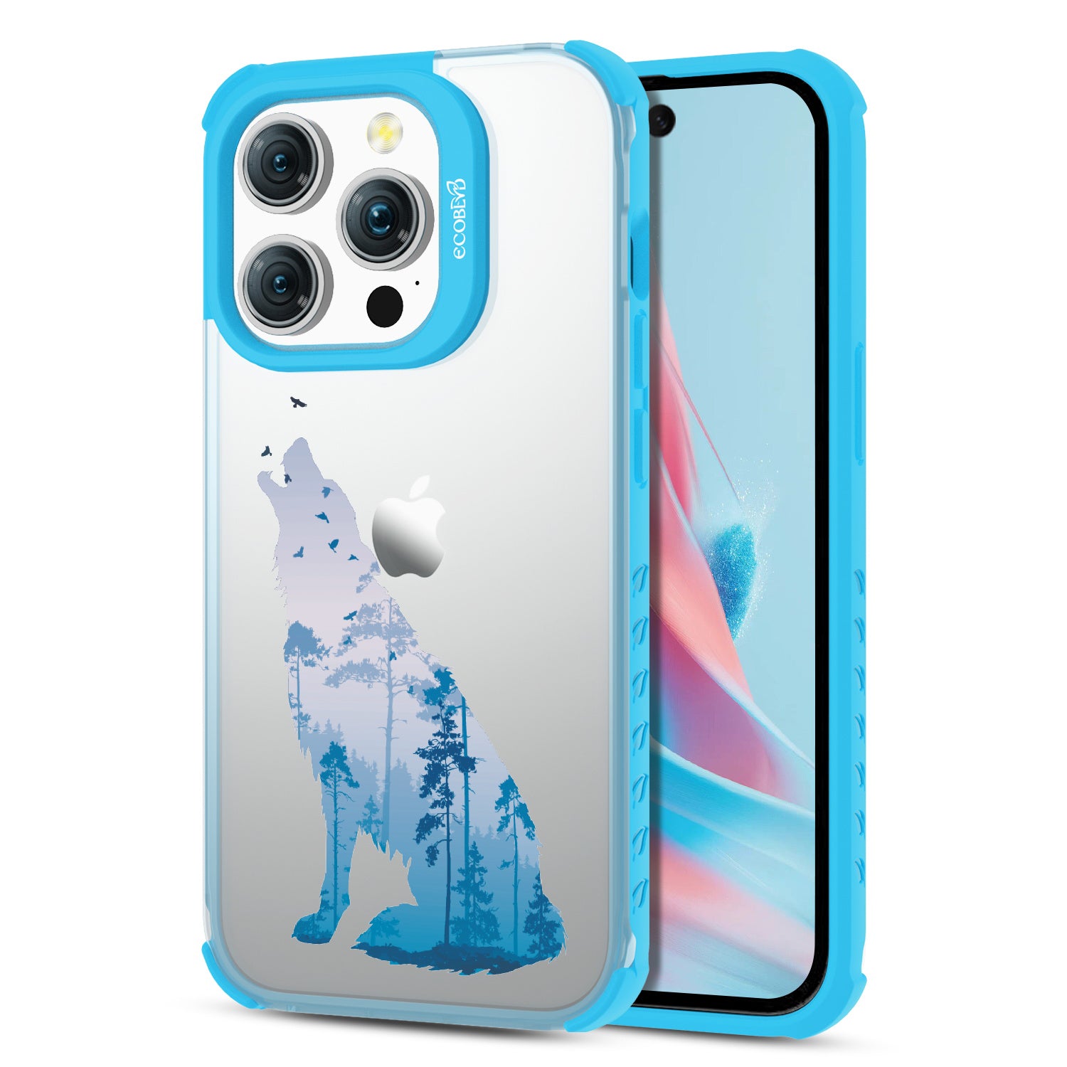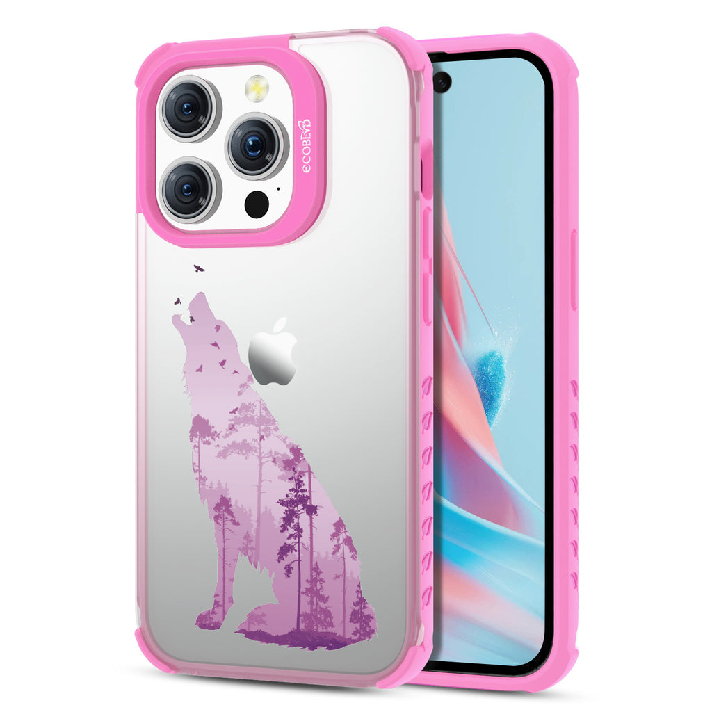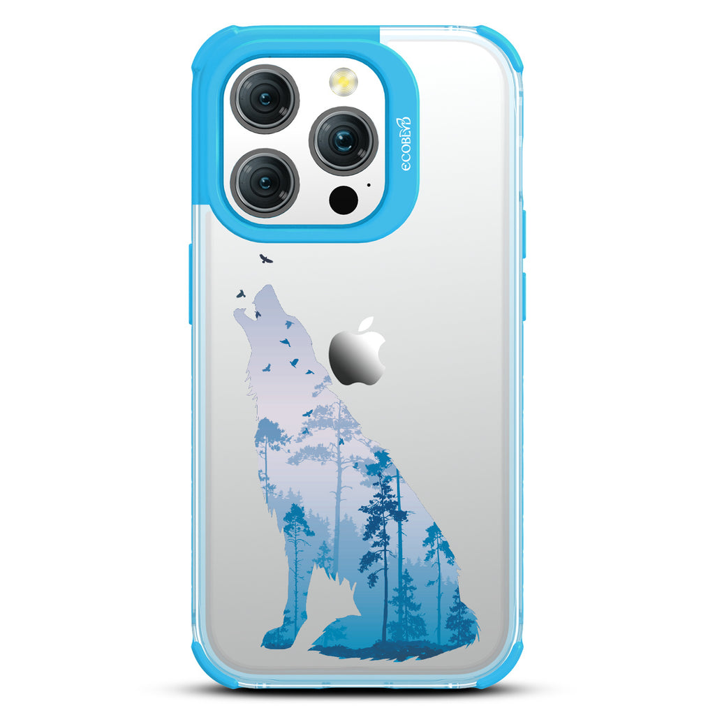Embrace your wild side as the Howl At The Moon design on our Laguna clear iPhone 15 Pro phone case transforms your phone into an enchanting moonlit woodland with a howling wolf prowling through the darkness and across five vibrant color options: Midnight Black, Cascade Blue, Pastel Lilac, Illuminating Yellow, and Wildflower Pink.