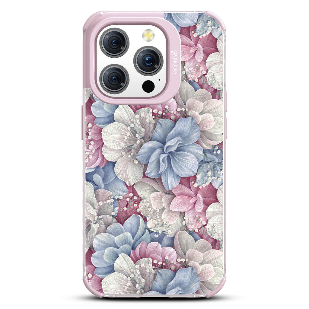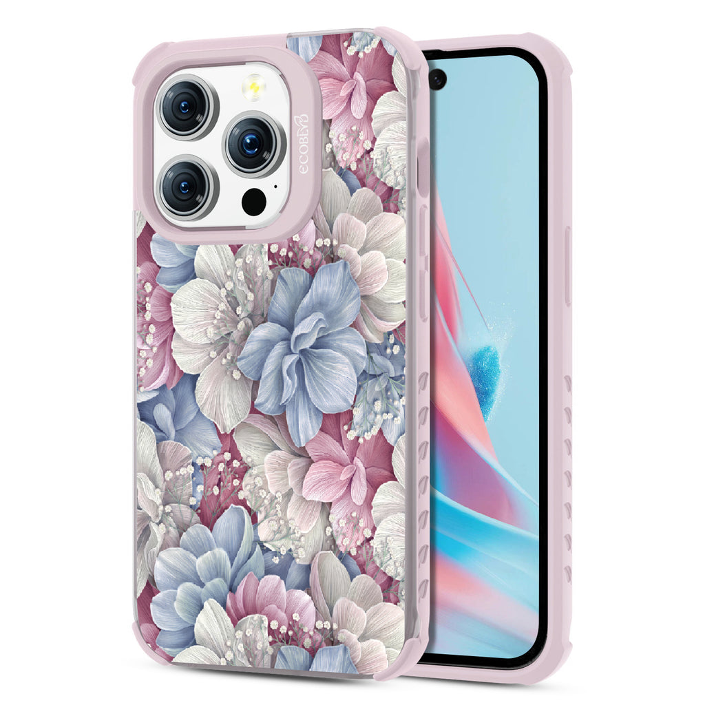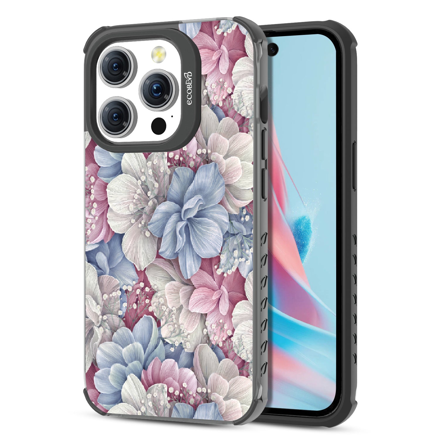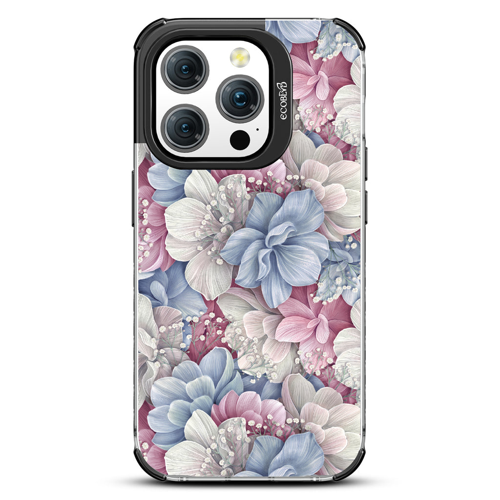 The Petals & Pearls design on our Laguna clear iPhone 15 Pro case is like a melody of spring, its pastel colors swaying like a sweet tune and the water droplets on the petals ringing like pearls, harmoniously reflecting the blooming beauty of the season in four colors: Midnight Black, Cascade Blue, Pastel Lilac, and Wildflower Pink.