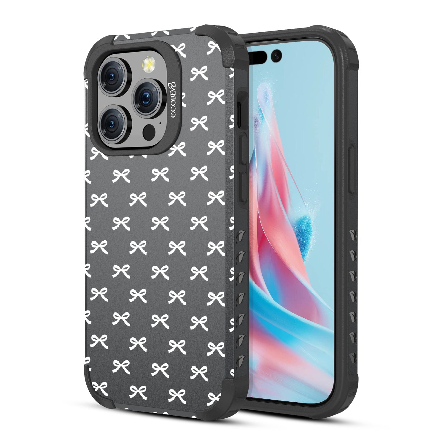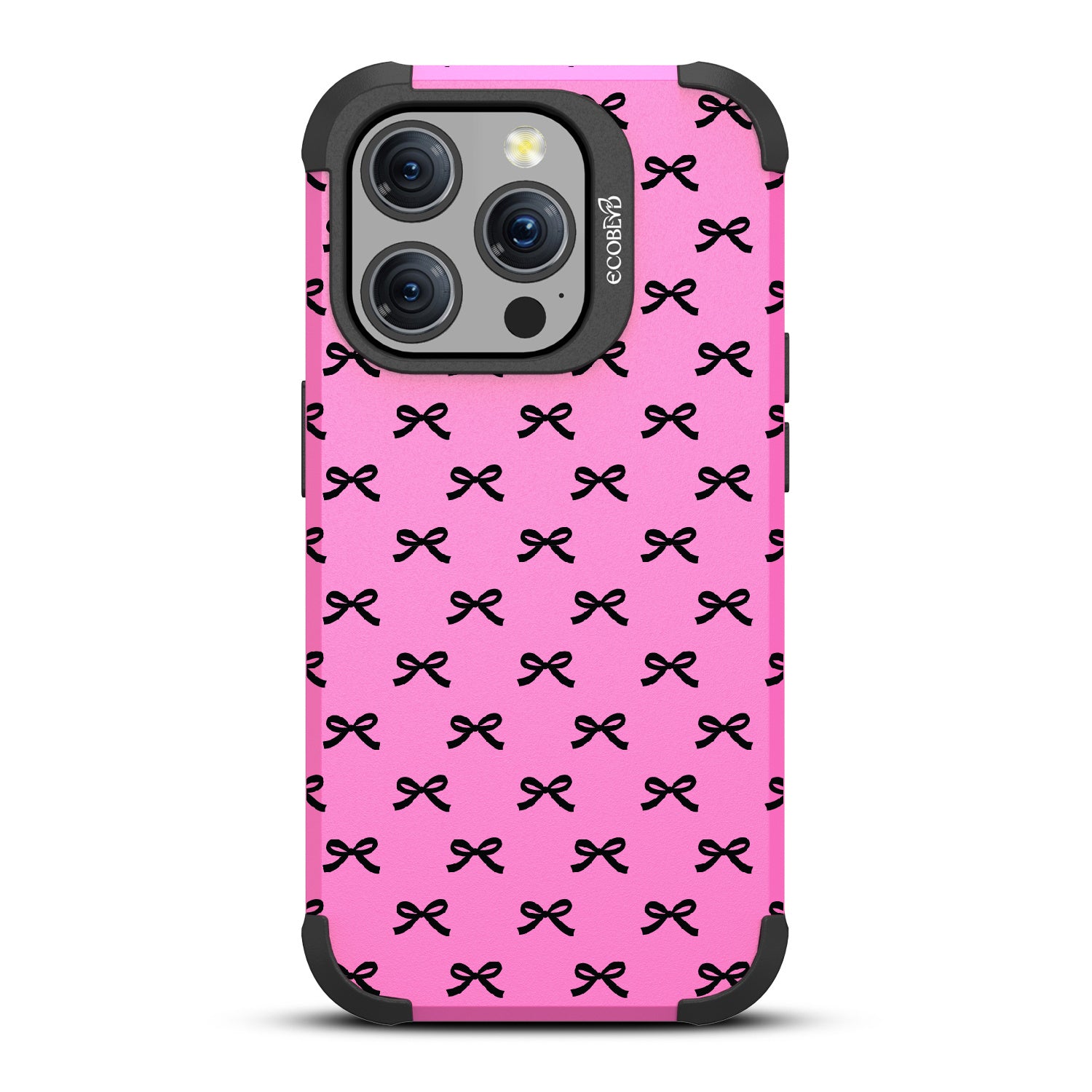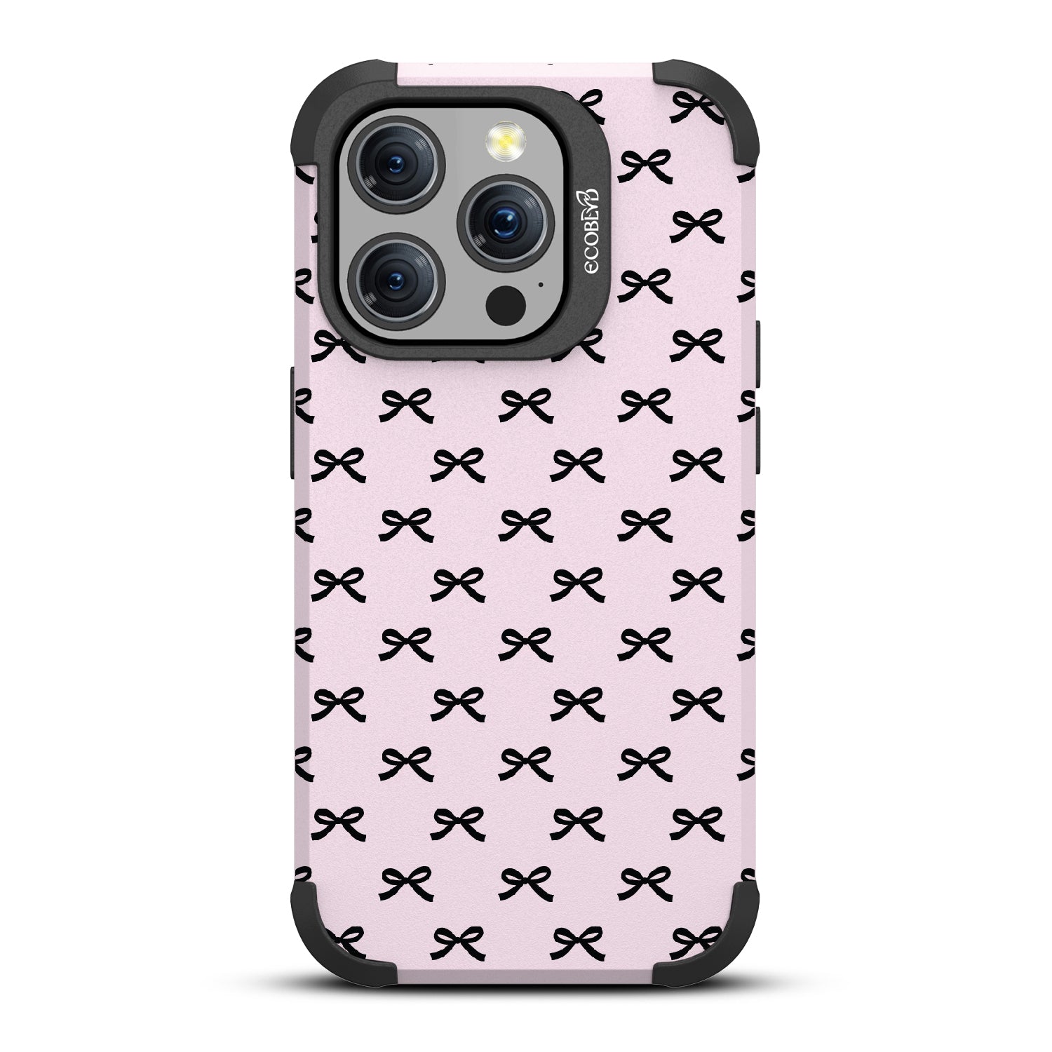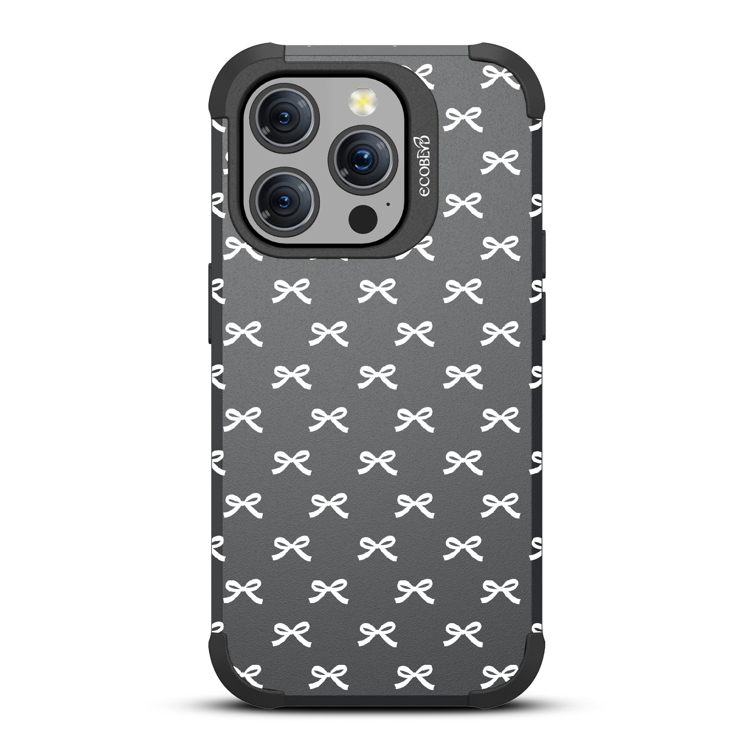 Get all dressed up to adorn and adore with the Coquette design on our Mojave rugged and compostable iPhone 15 Pro MagSafe case. Let the cute black bows be the stars of the show, gracing your phone with their dainty presence. As you hold your device, you'll feel the subtle embrace of everlasting bonds formed by each dainty knot, creating a sense of feminine connection and girlhood that goes beyond mere aesthetics.