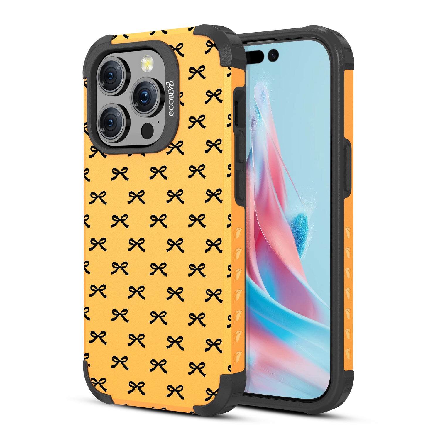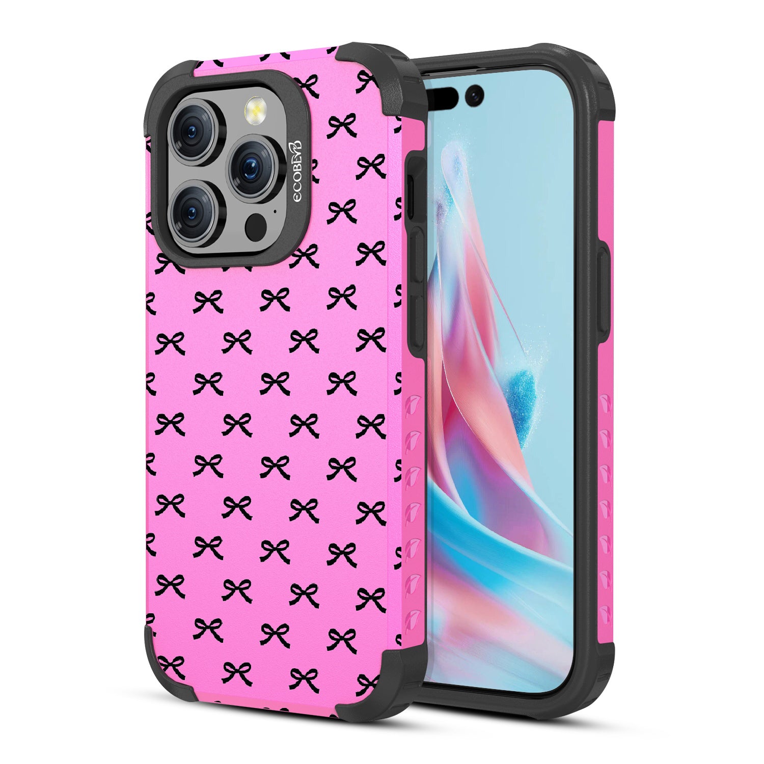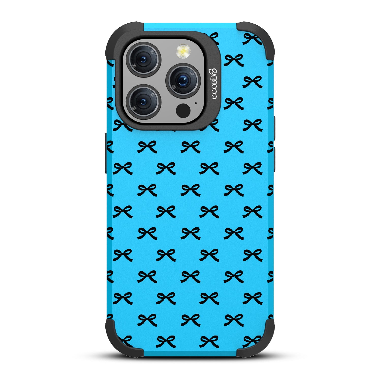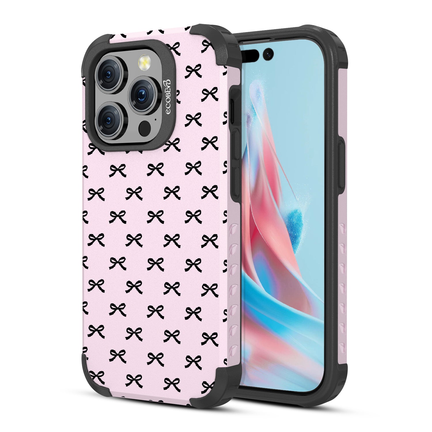 Get all dressed up to adorn and adore with the Coquette design on our Mojave rugged and compostable iPhone 15 Pro MagSafe case. Let the cute black bows be the stars of the show, gracing your phone with their dainty presence. As you hold your device, you'll feel the subtle embrace of everlasting bonds formed by each dainty knot, creating a sense of feminine connection and girlhood that goes beyond mere aesthetics.