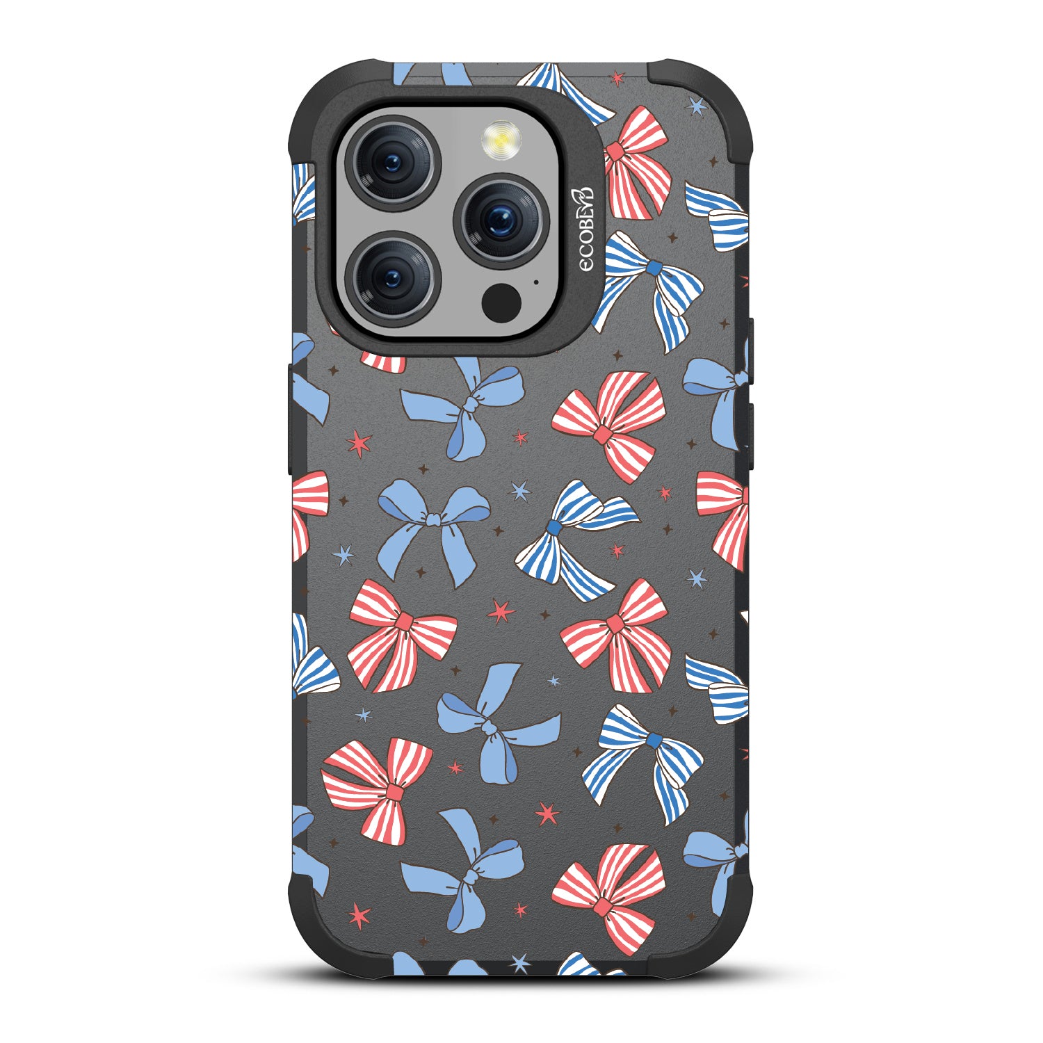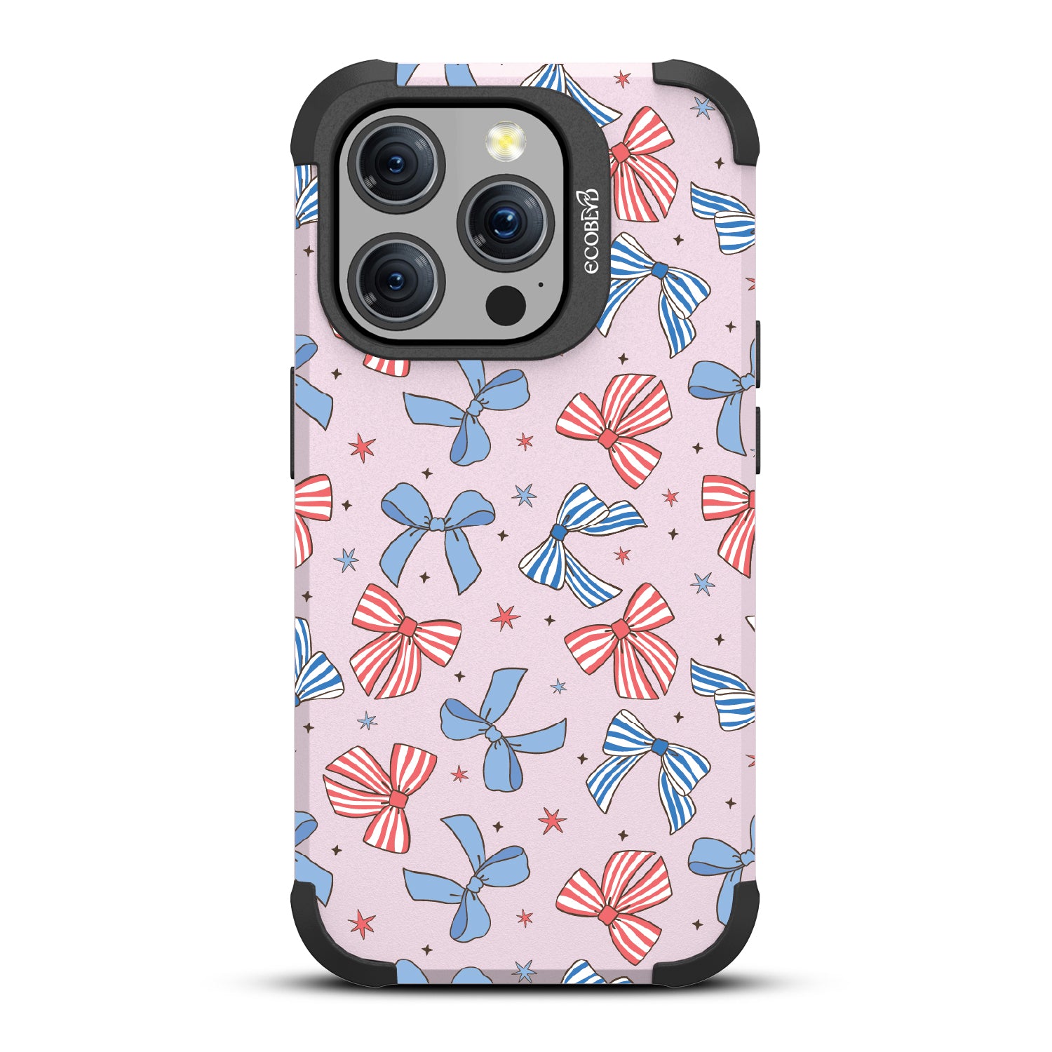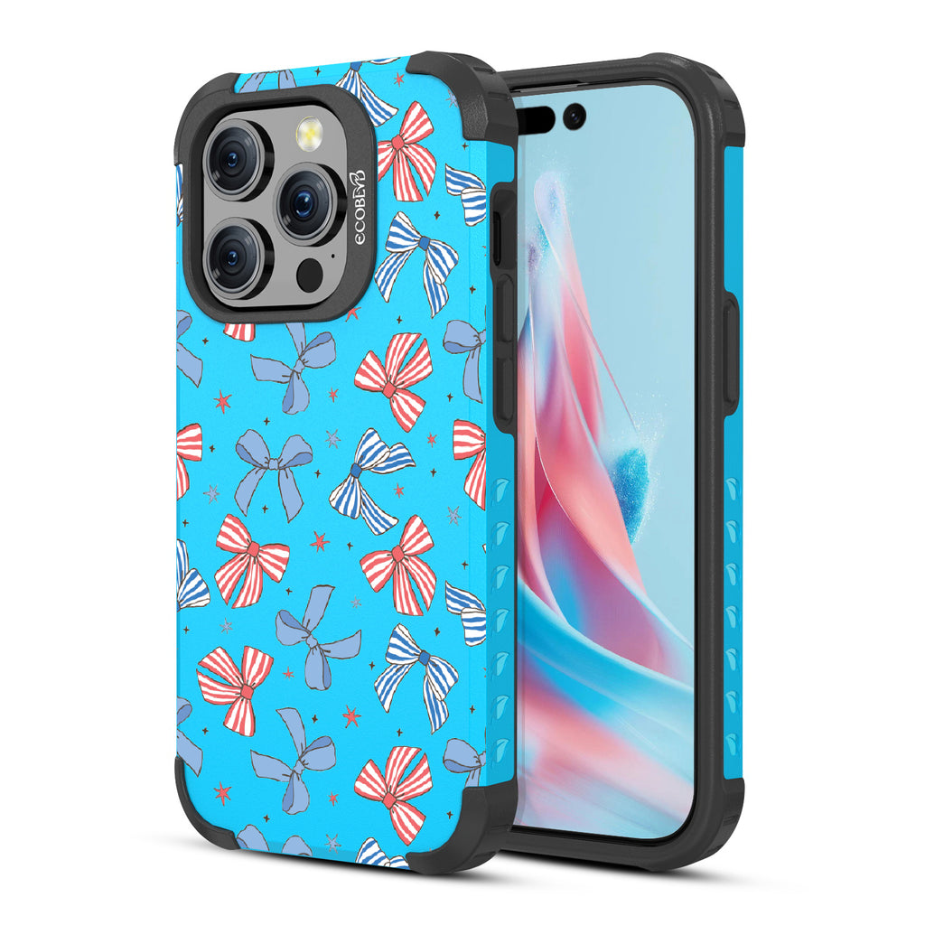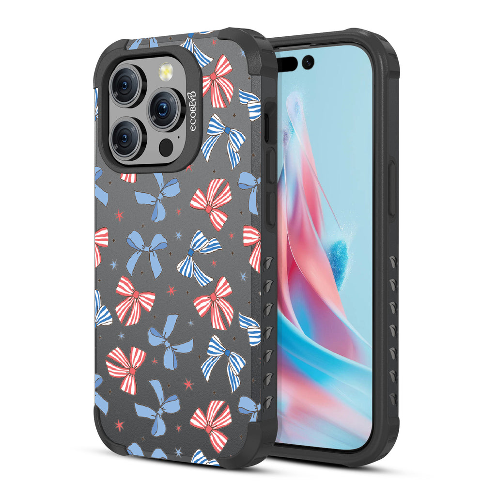 America the bow-tiful! The Miss Americana design on our Mojave rugged iPhone 15 Pro MagSafe case crowns your phone with patriotic flair. With red, white, and blue bows, this coquette phone case design turns your phone into the belle of the Americana ball.