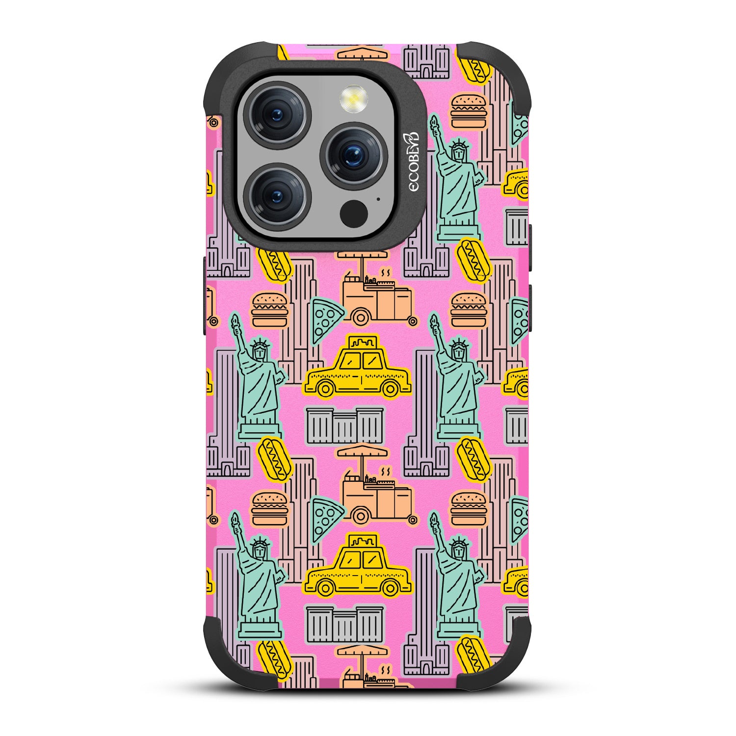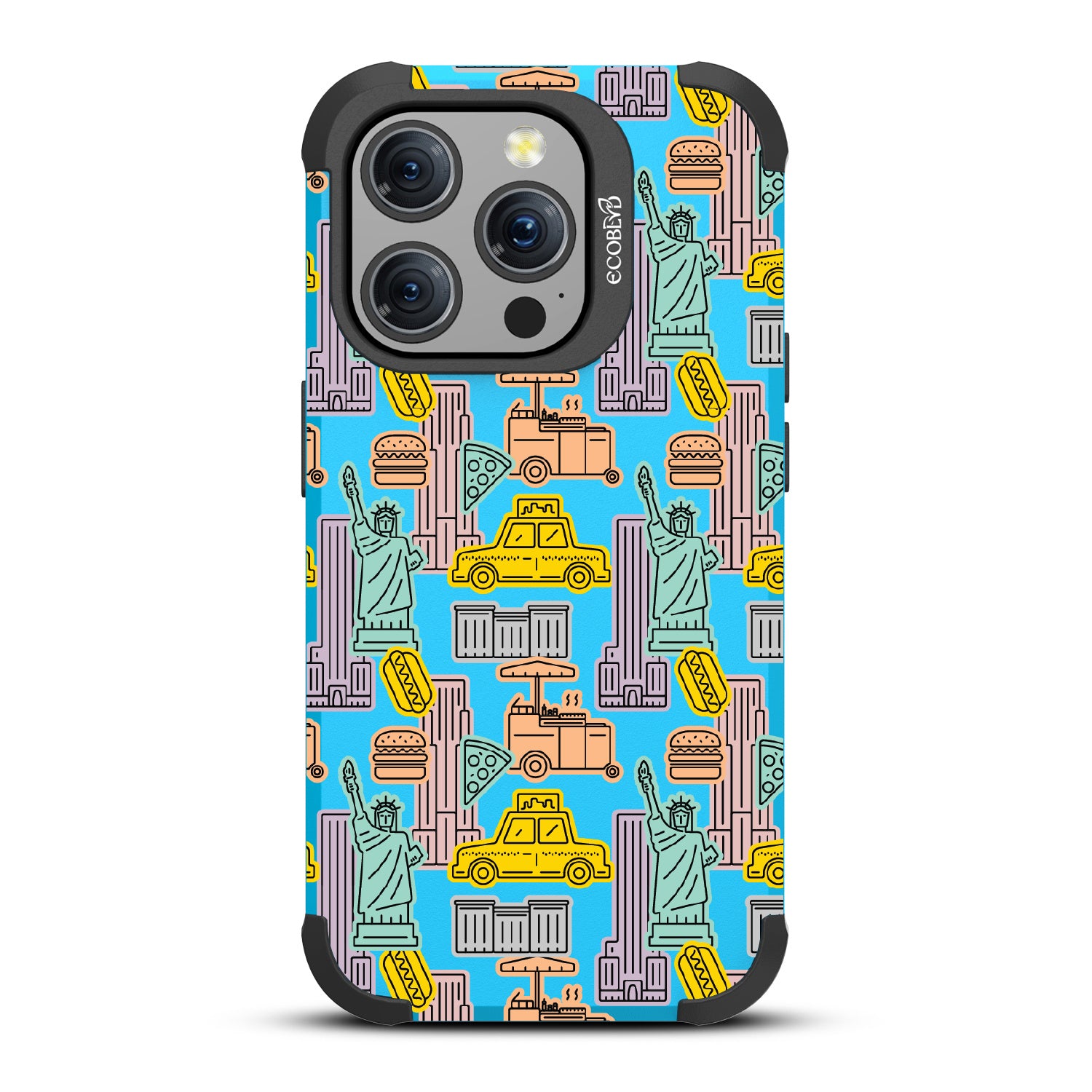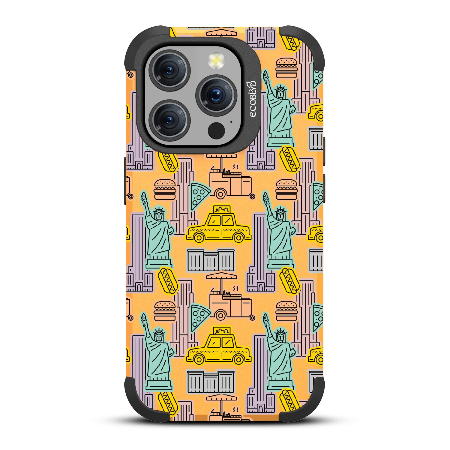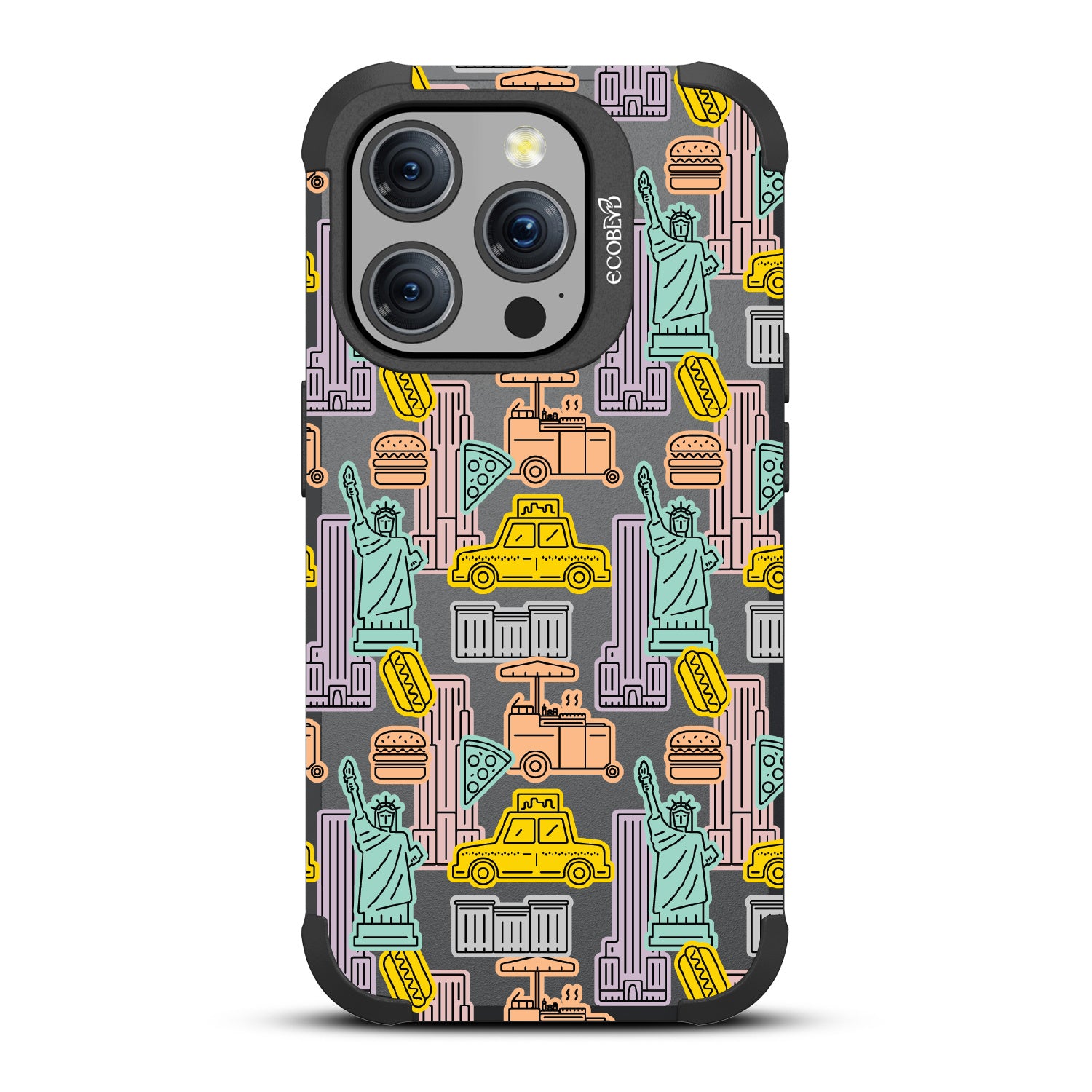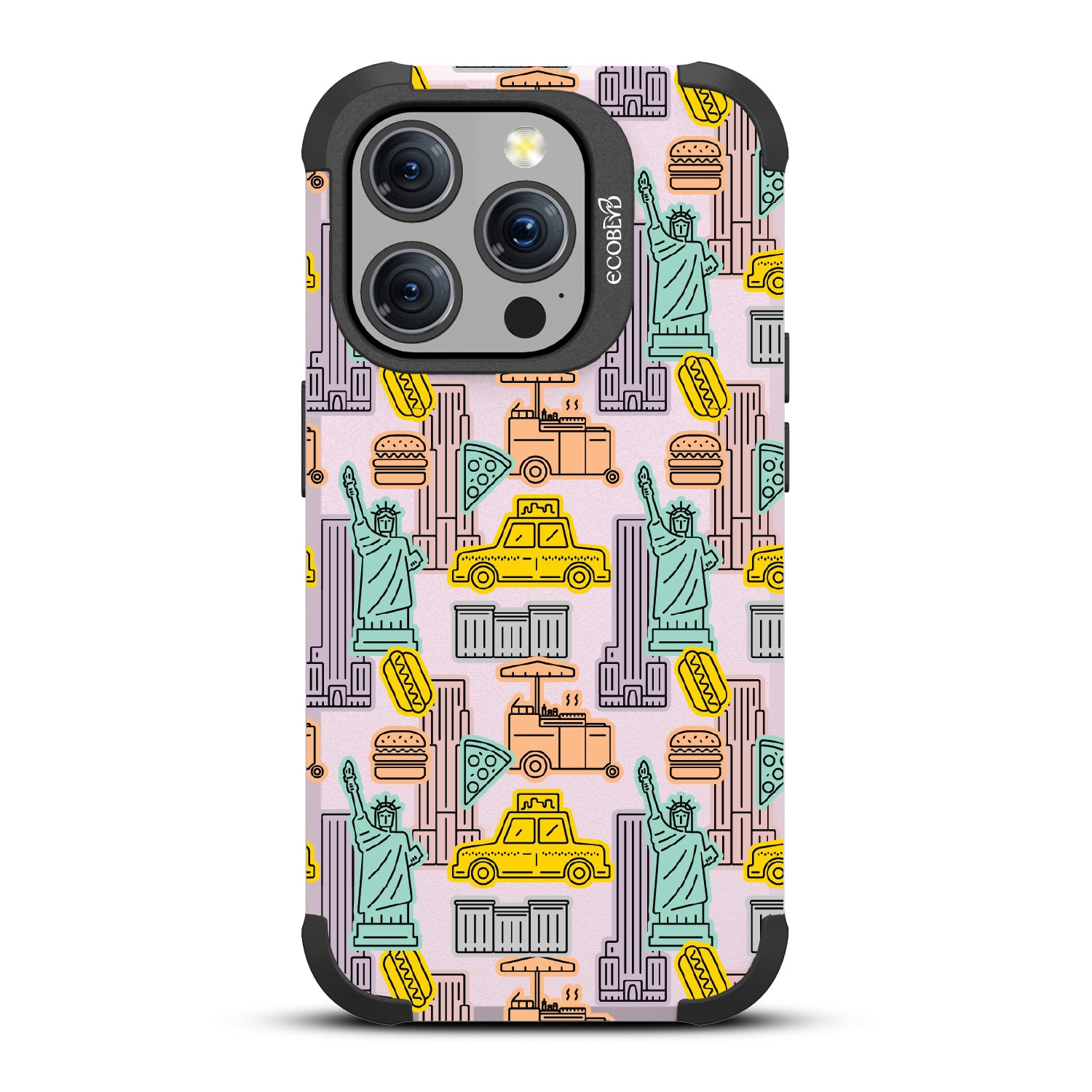 Capture the buzz of the city that never sleeps with the New York Minute design on our Mojave rugged iPhone 15 Pro MagSafe case. It's a slice of the Big Apple, with iconic yellow cabs, steaming hotdogs, and Lady Liberty herself, all wrapped up in that unmistakable NYC rhythm.