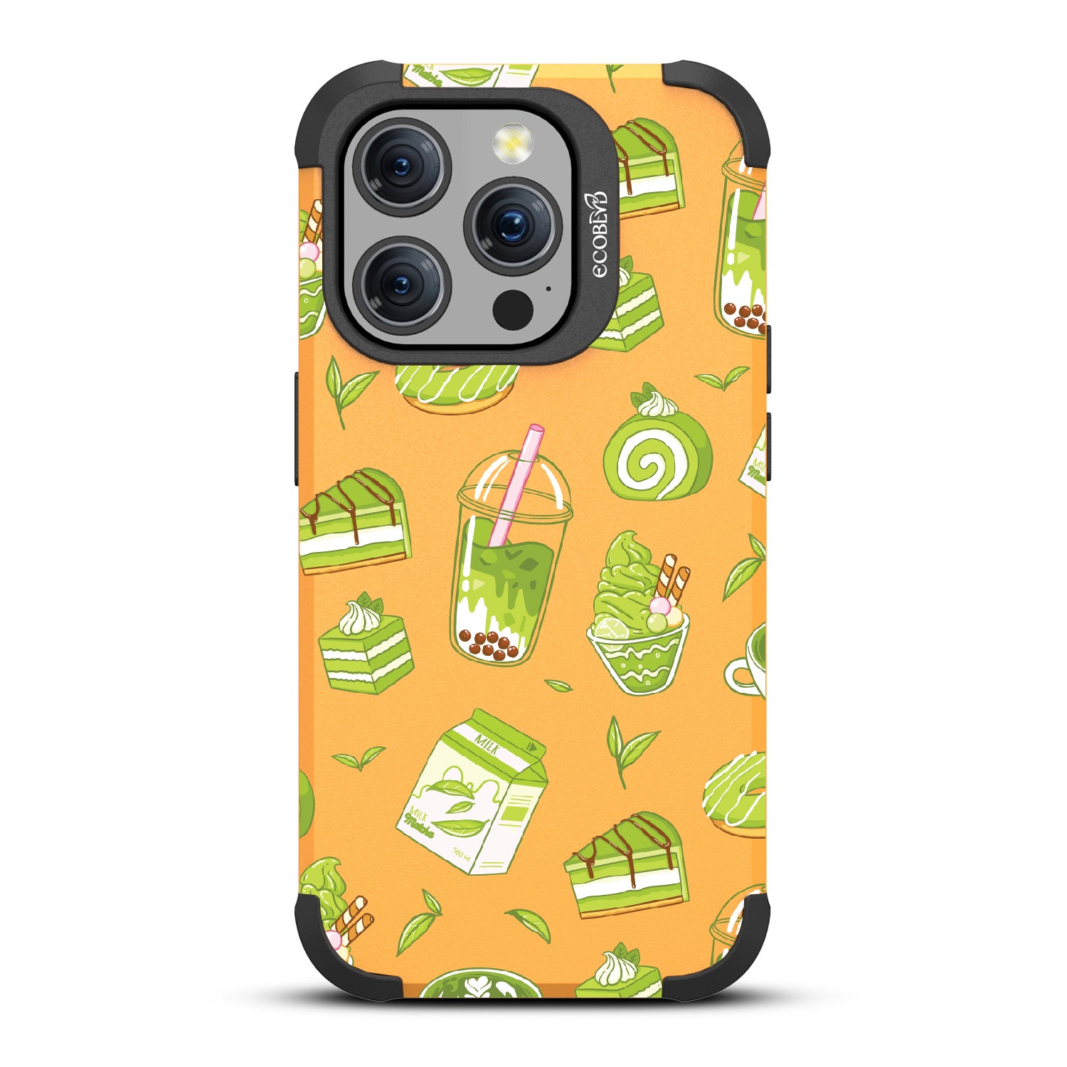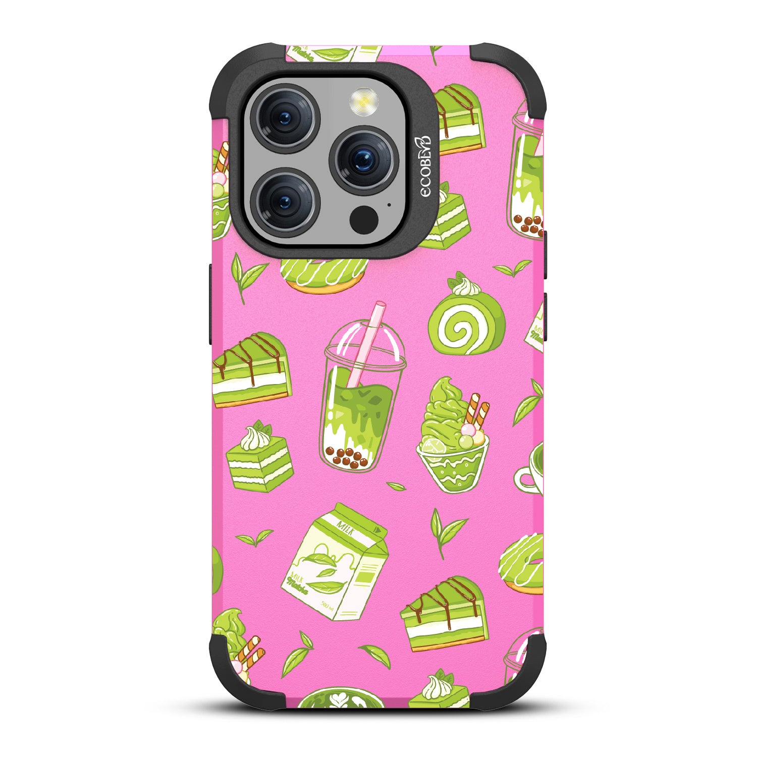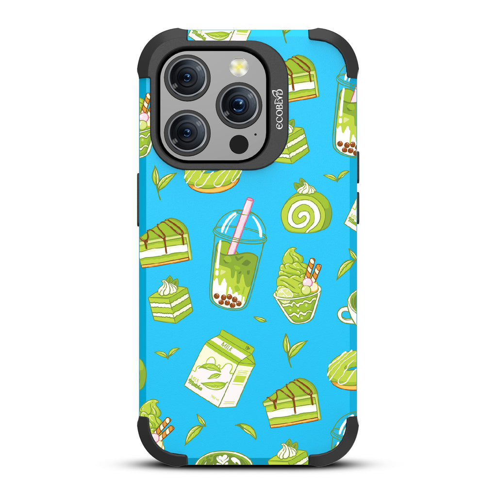 Ice cream and boba, cake, milk, and so matcha more! Overflowing with matcha flavor, this design on our Mojave rugged and compostable iPhone 15 Pro case! brings you a perfect blend of your favorite green treats. Because who ever said there was such a thing as too much matcha?