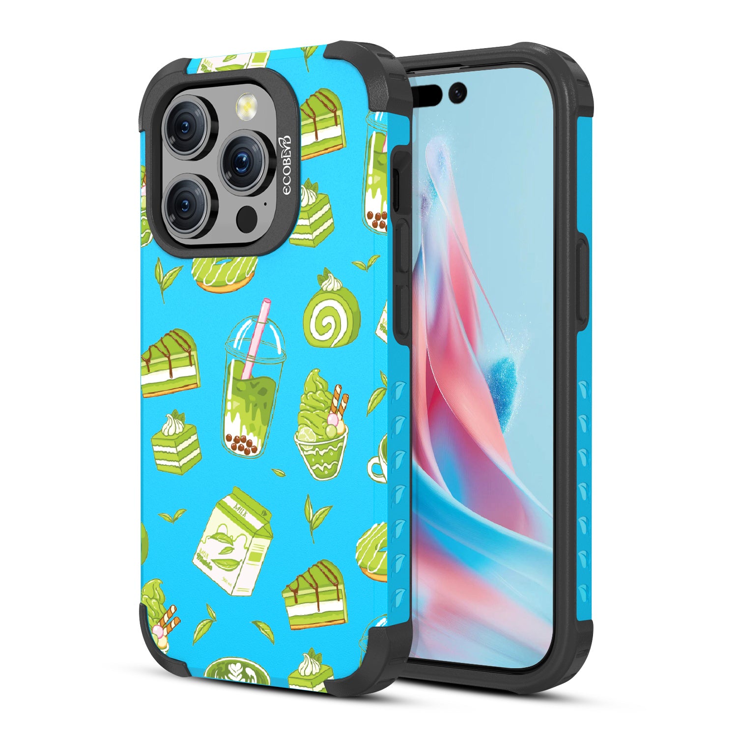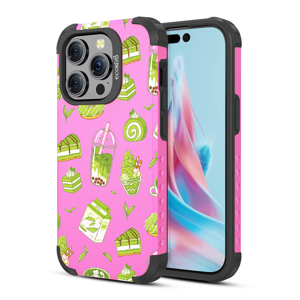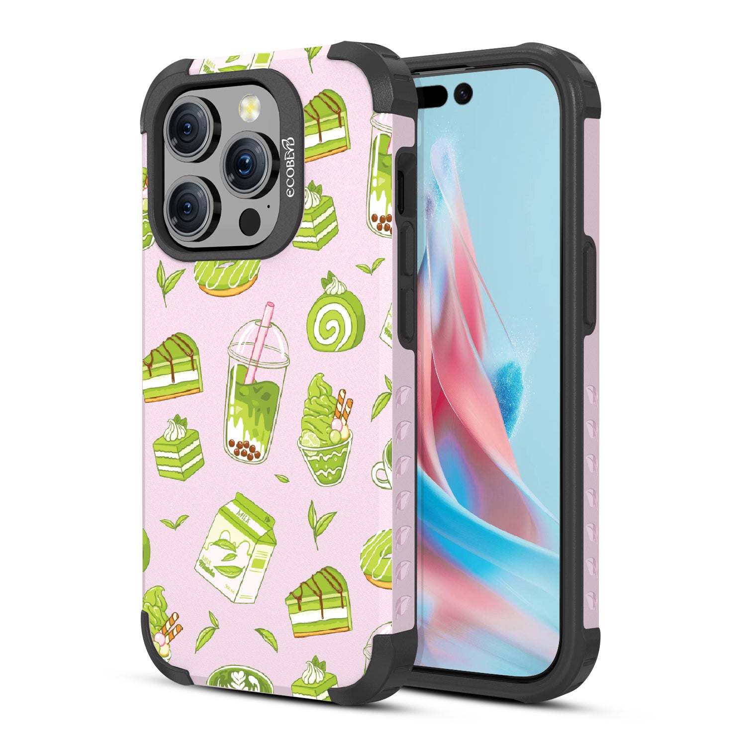Ice cream and boba, cake, milk, and so matcha more! Overflowing with matcha flavor, this design on our Mojave rugged and compostable iPhone 15 Pro case! brings you a perfect blend of your favorite green treats. Because who ever said there was such a thing as too much matcha?