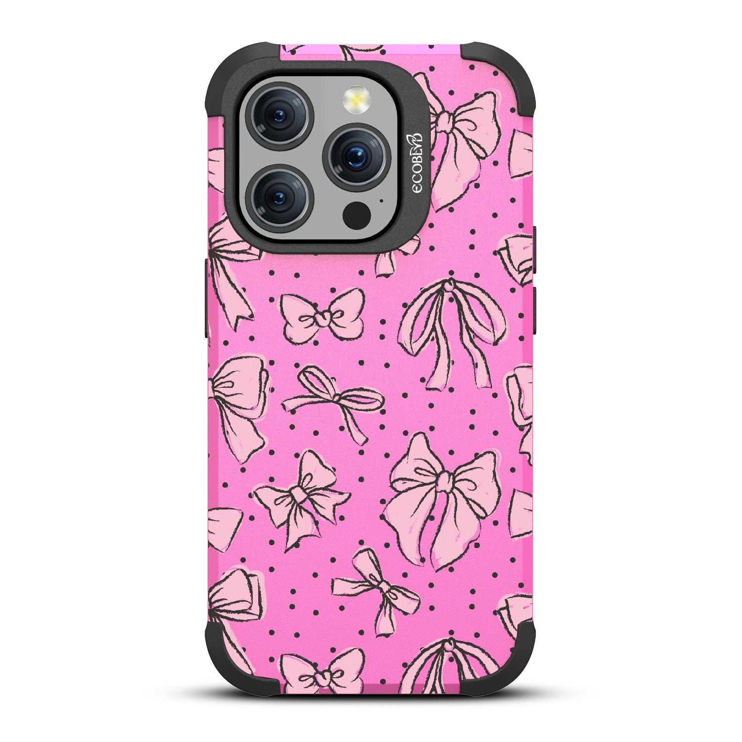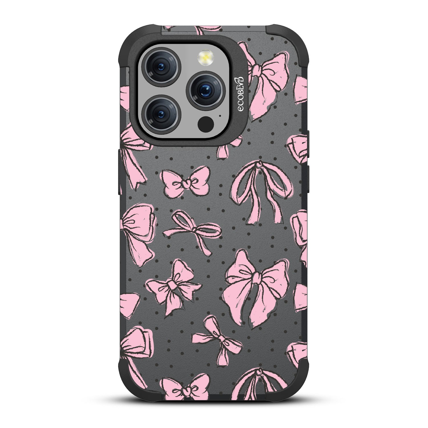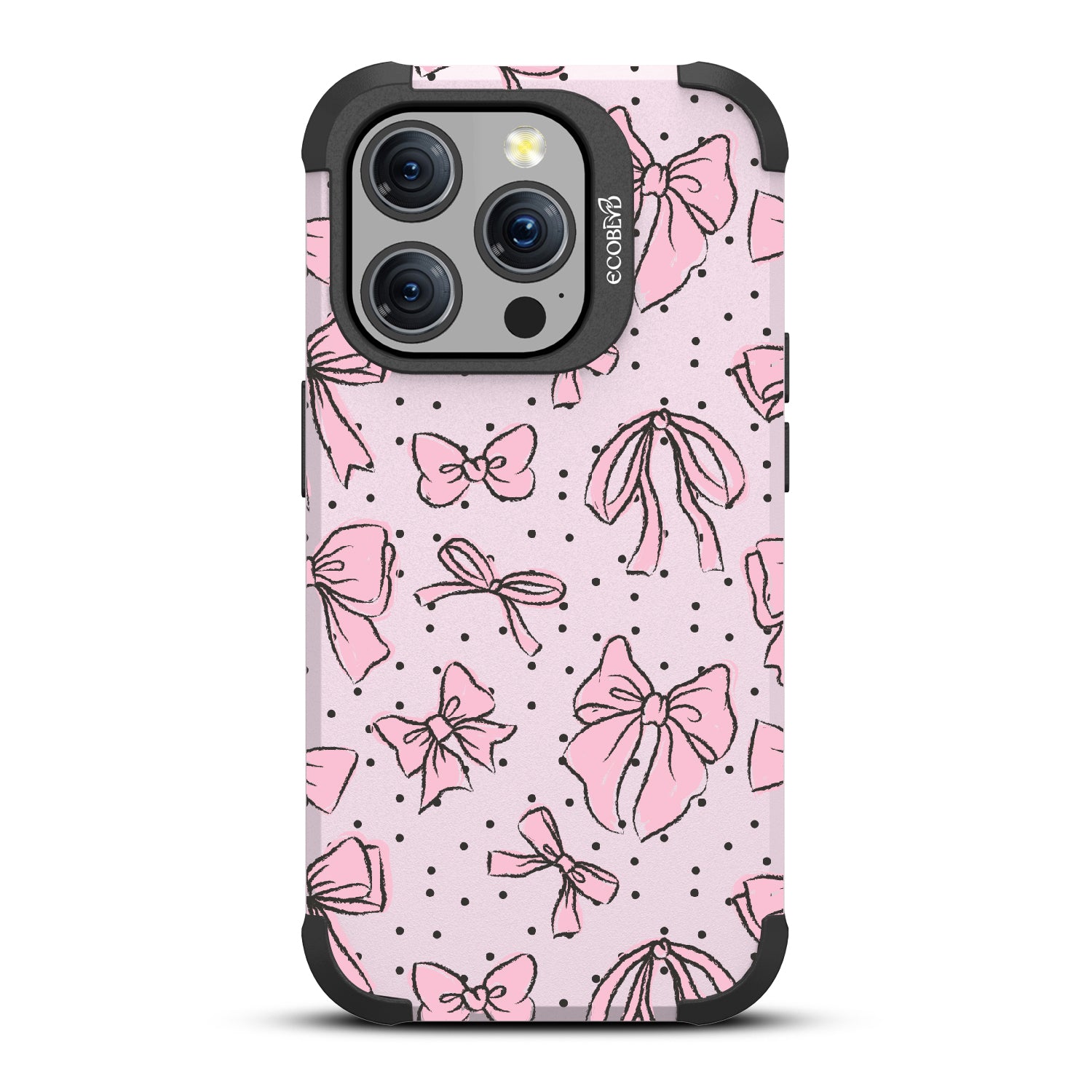 Enter your Soft Girl Era with this bow-tiful design on our Mojave rugged and compostable iPhone 15 Pro MagSafe case,, where coquette pink bows and black polka dots team up to give your device a dose of girly glam. Surround yourself with girl power, radiating kindness, love, and gentle energy. Let your phone be a reminder of the unbreakable ties that bind us together.