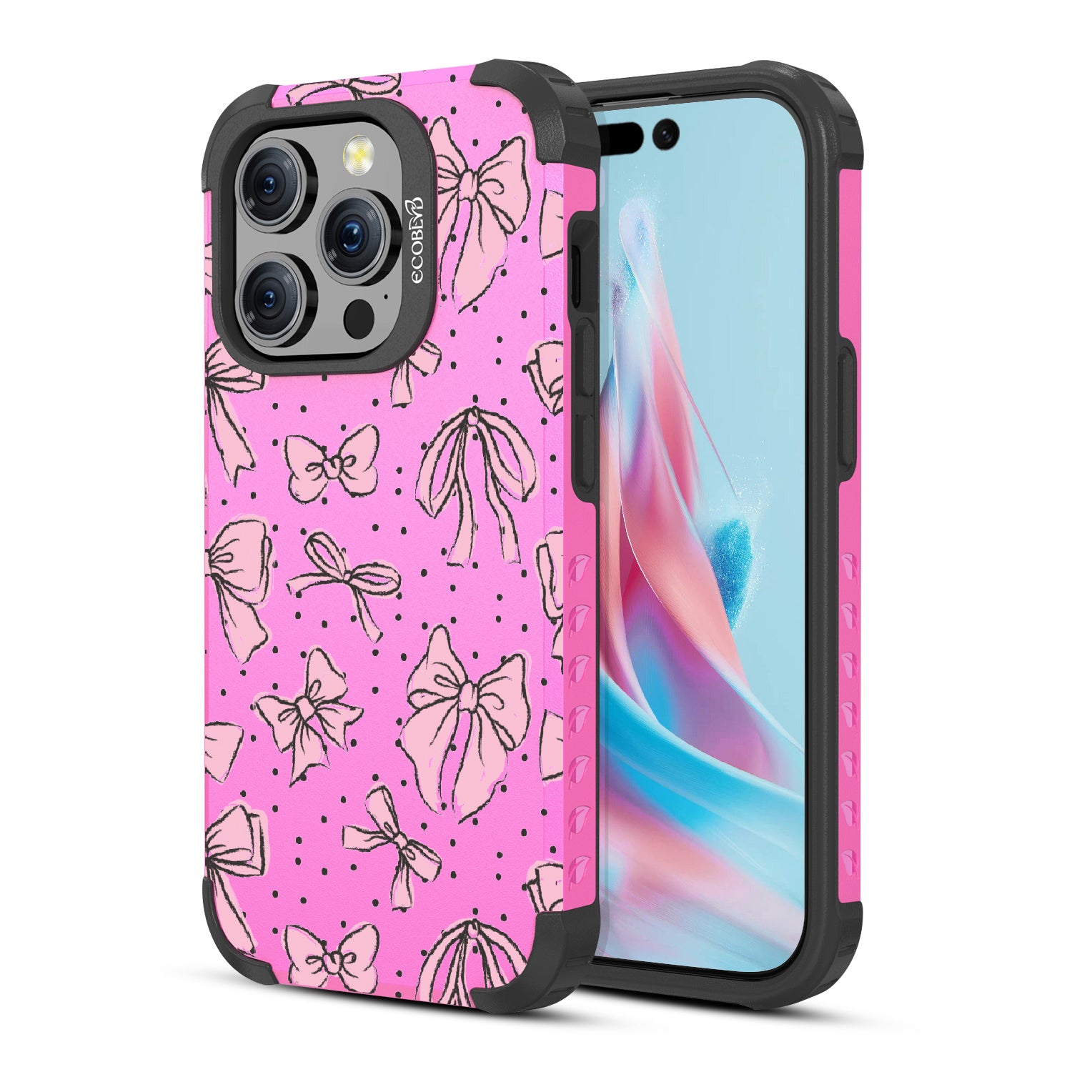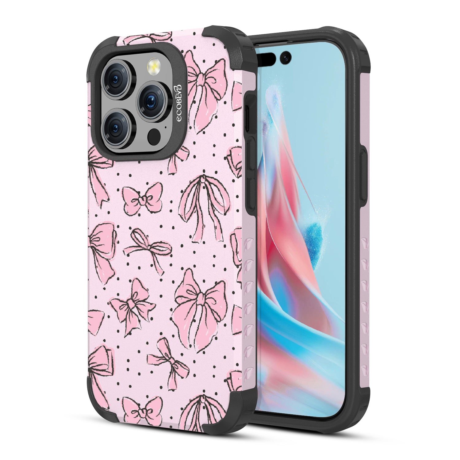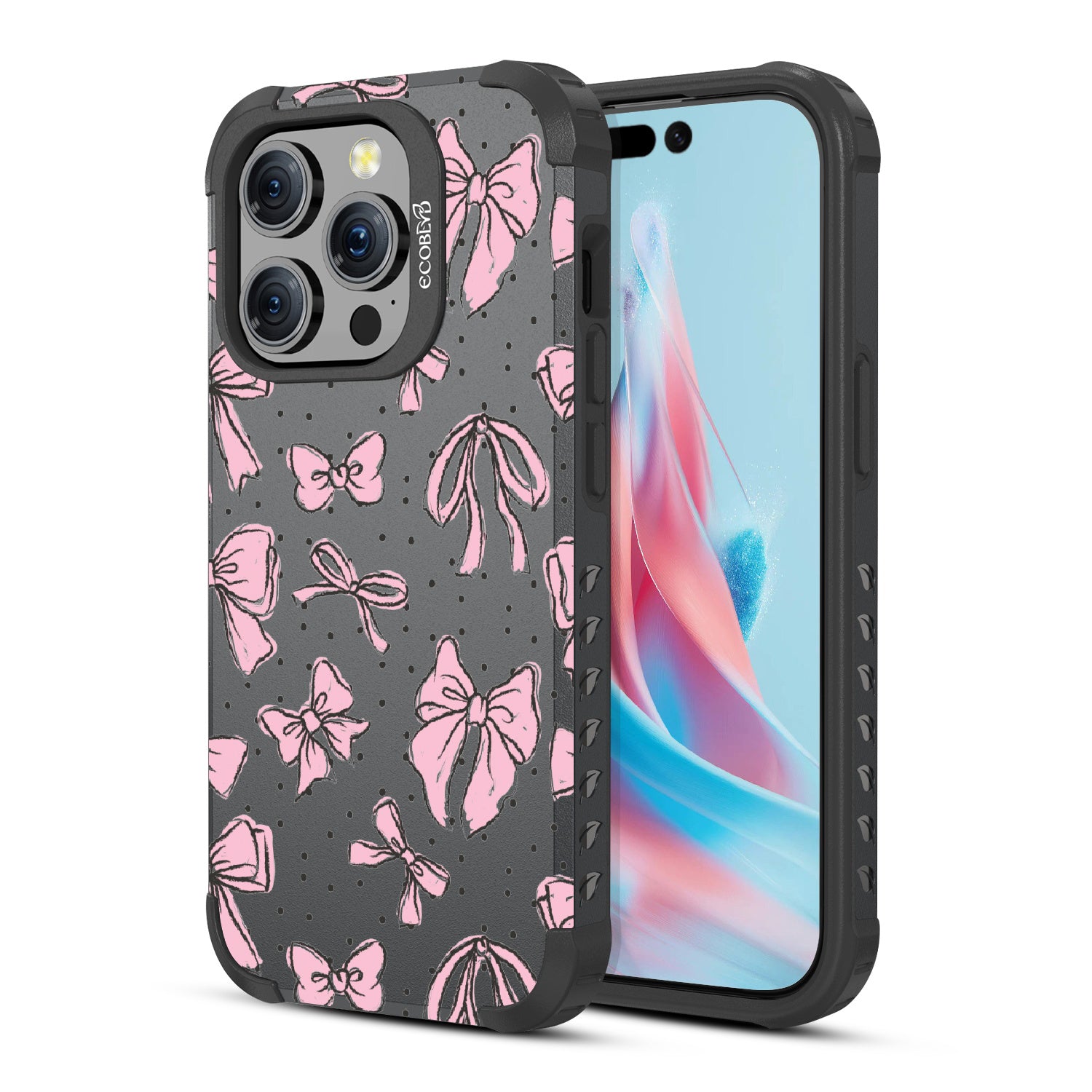 Enter your Soft Girl Era with this bow-tiful design on our Mojave rugged and compostable iPhone 15 Pro MagSafe case,, where coquette pink bows and black polka dots team up to give your device a dose of girly glam. Surround yourself with girl power, radiating kindness, love, and gentle energy. Let your phone be a reminder of the unbreakable ties that bind us together.