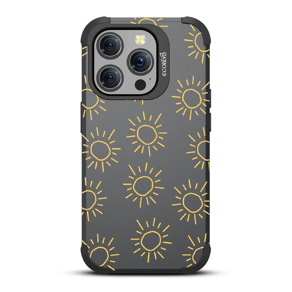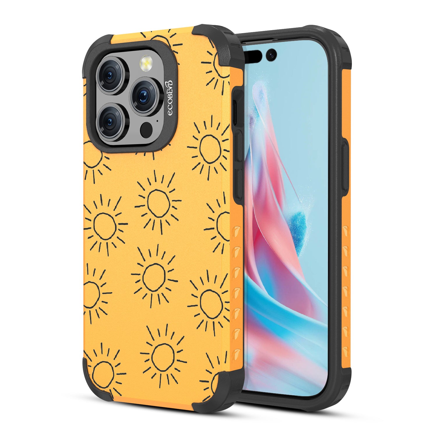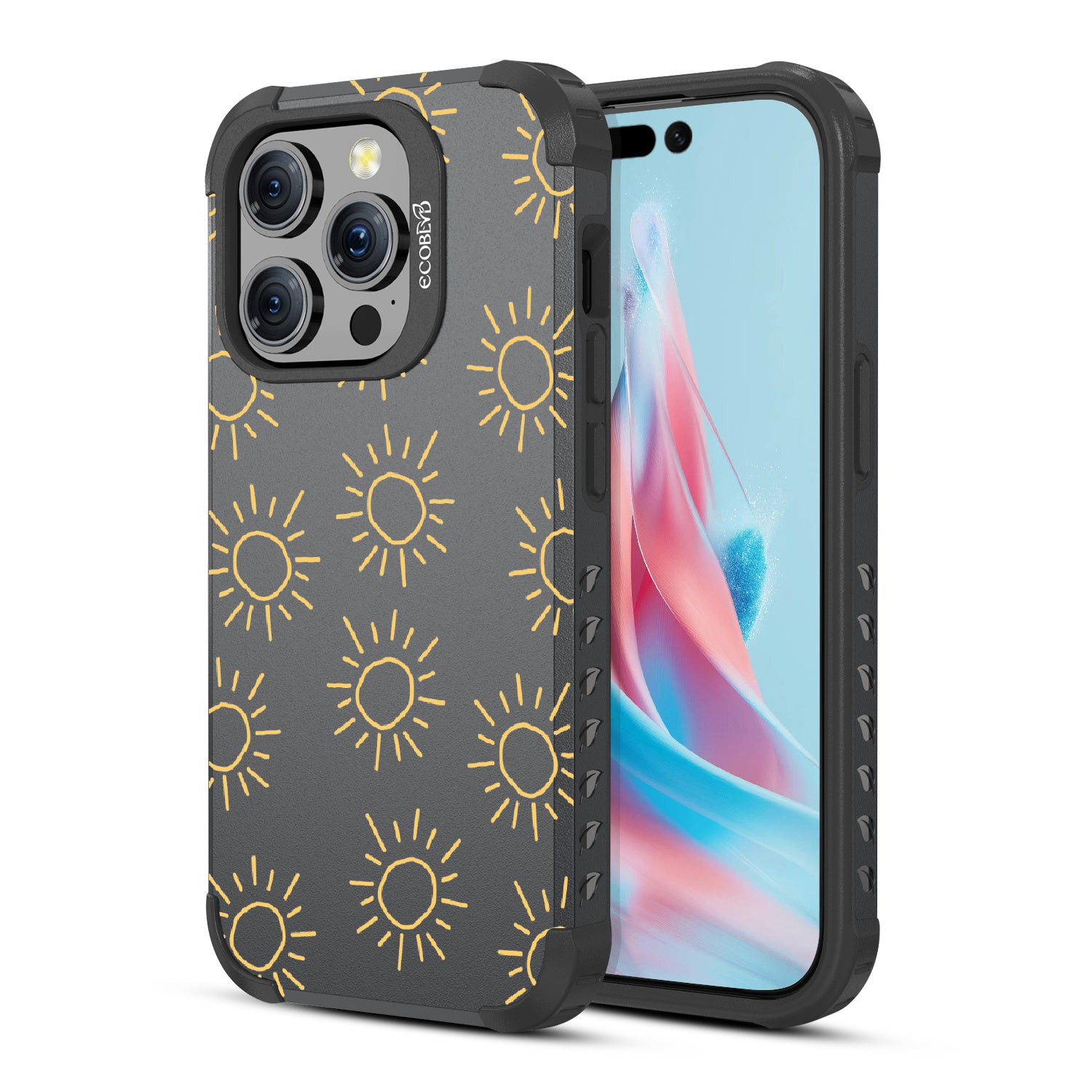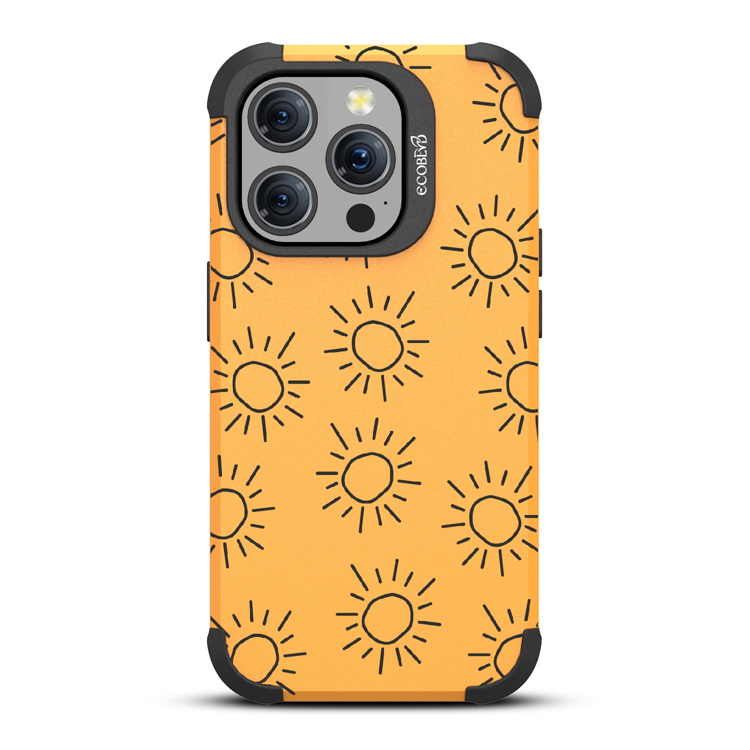 Even on cloudy days, the Sun design on our Mojave rugged and compostable iPhone 15 Pro case lets your style shine with a bright and sunny flair that turns up the heat as it casts a radiant glow from your phone.
