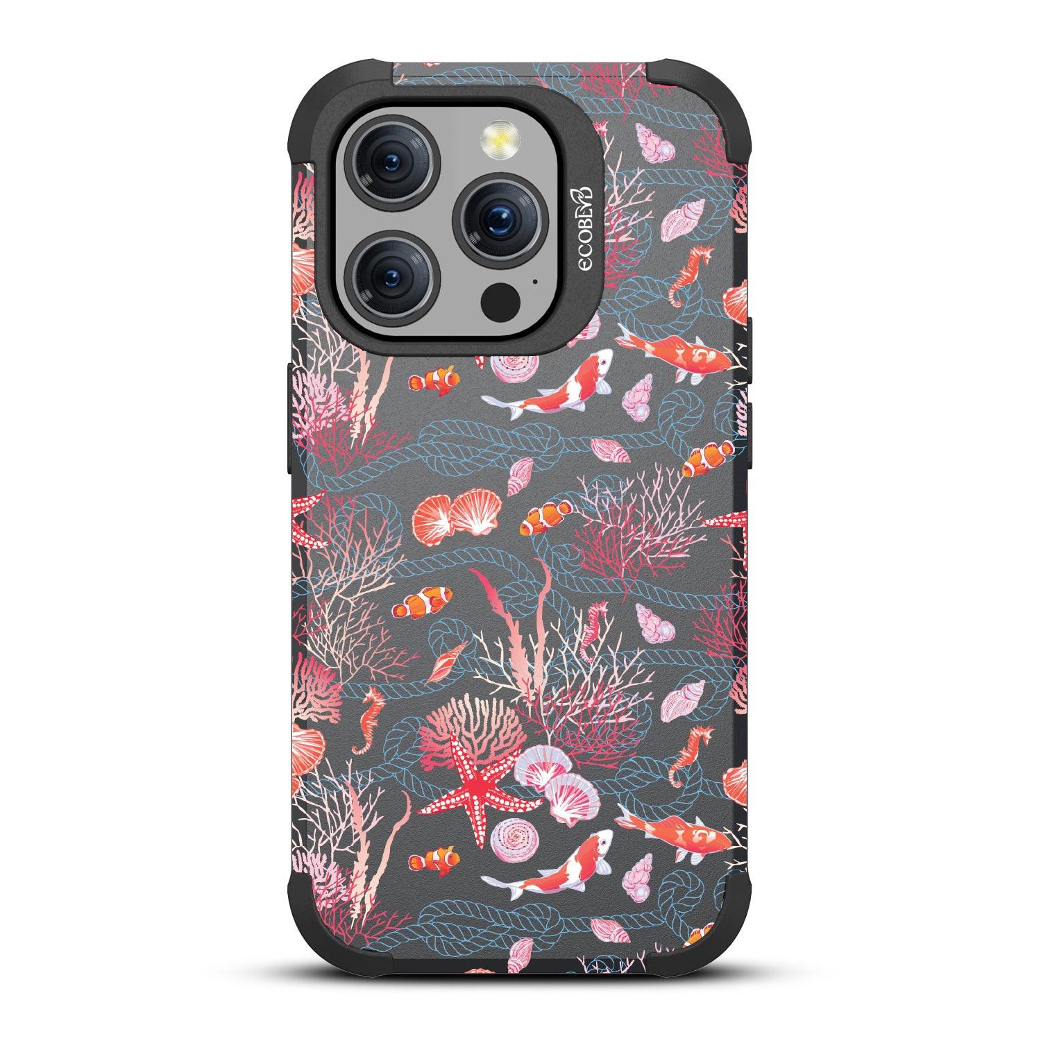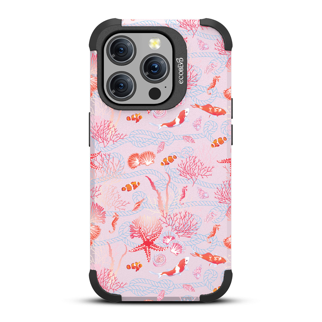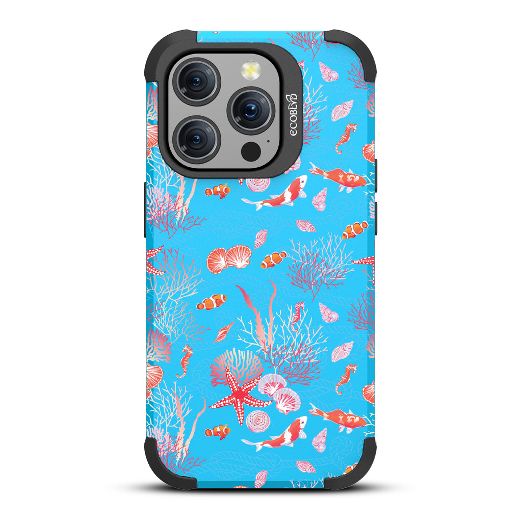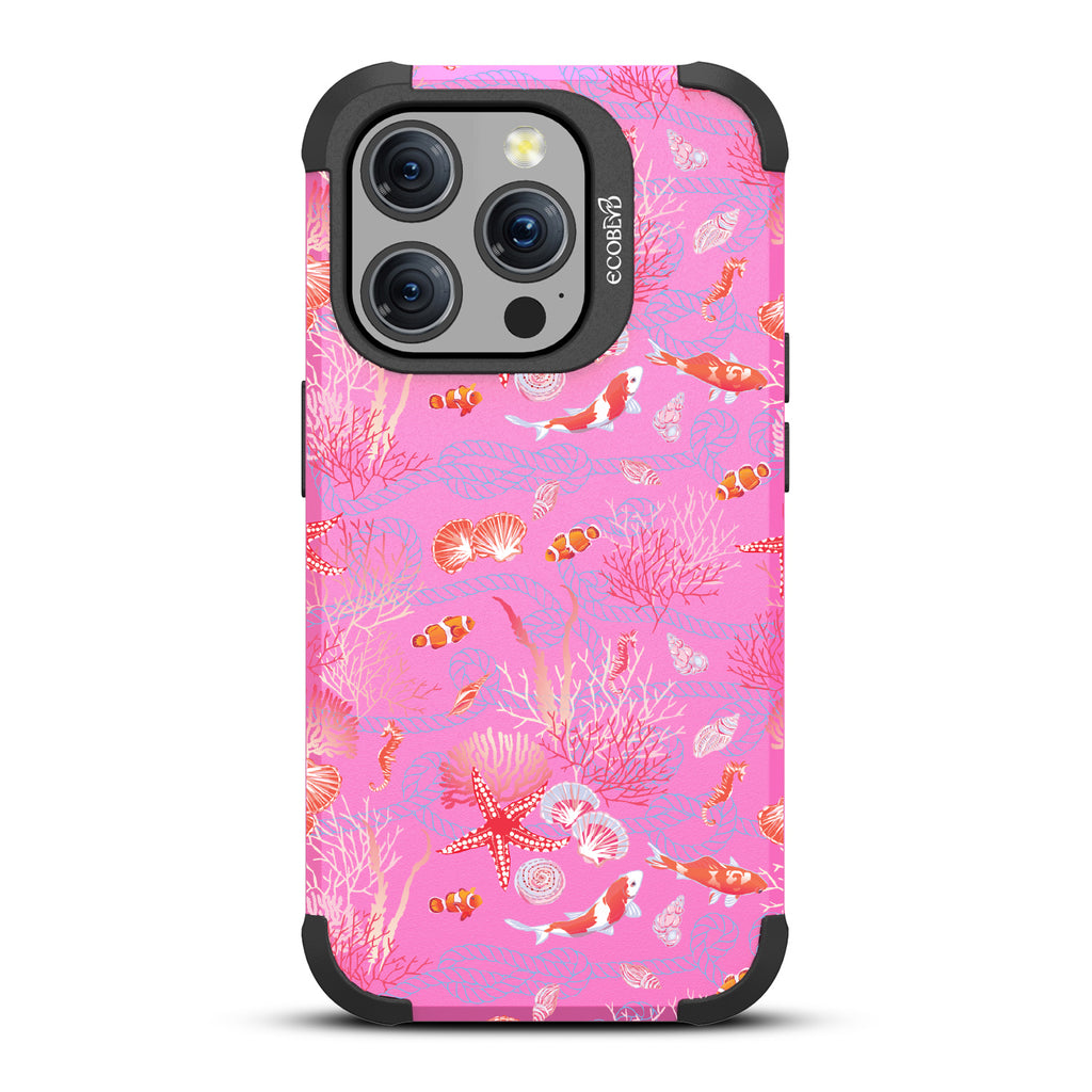 The coral is always brighter, Under the Sea! With this design our Mojave rugged and compostable iPhone 15 Pro MagSafe case, you'll see, your phone’s full of glee, under the sea! Coral and critters, they all come together, swirling in hues, pinks, and blues, where life’s better wetter, take it from me! Your phone will be dancing, twirling, and prancing, carrying the magic of the ocean so fancy! So let your phone be, full of joy and glee, under the sea.