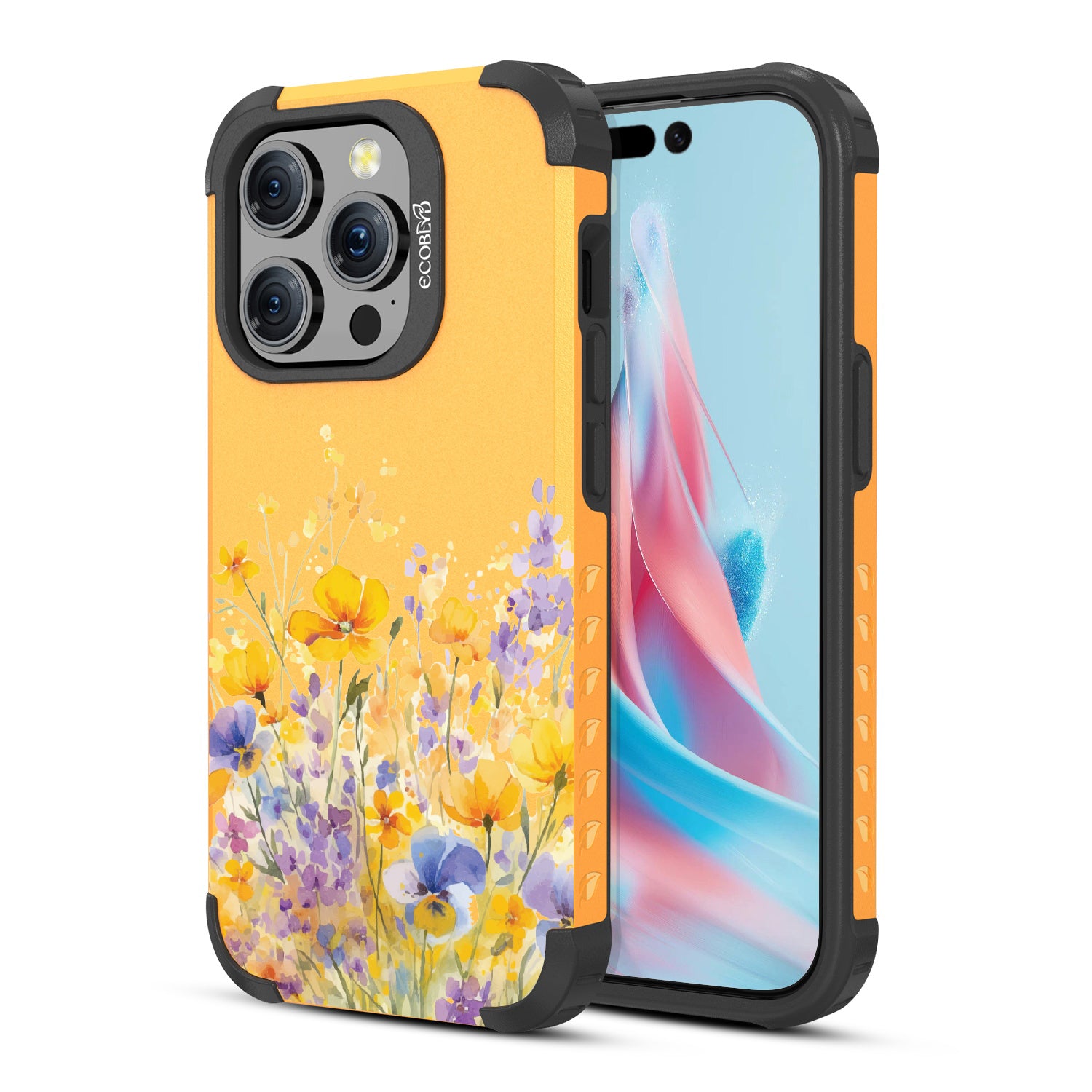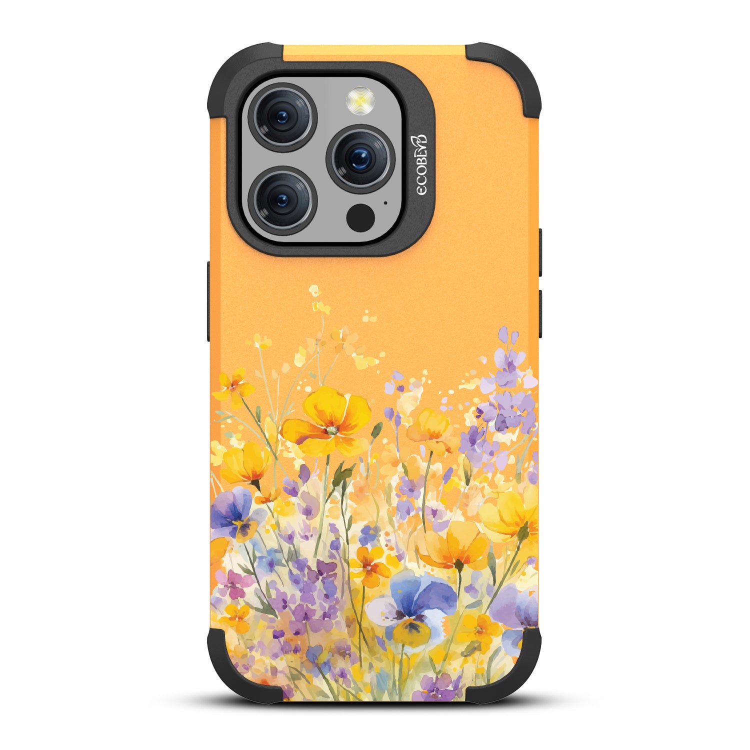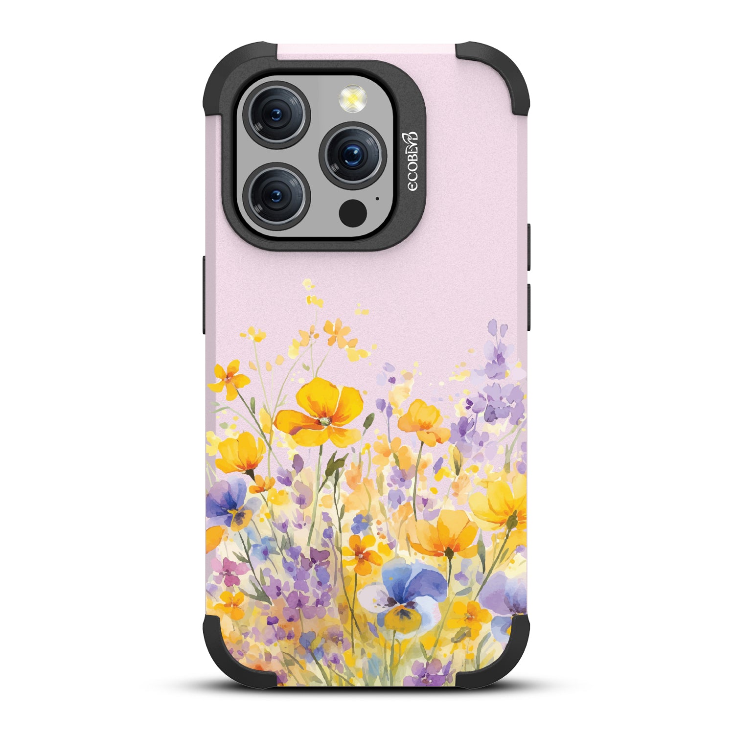 A moment in the light never looked so wild. The Meadowlight design on our Mojave rugged and compostable iPhone 15 Pro case lets soft florals run free in a watercolor wash of gold and lavender. A design that glows like a field at its most unfiltered.