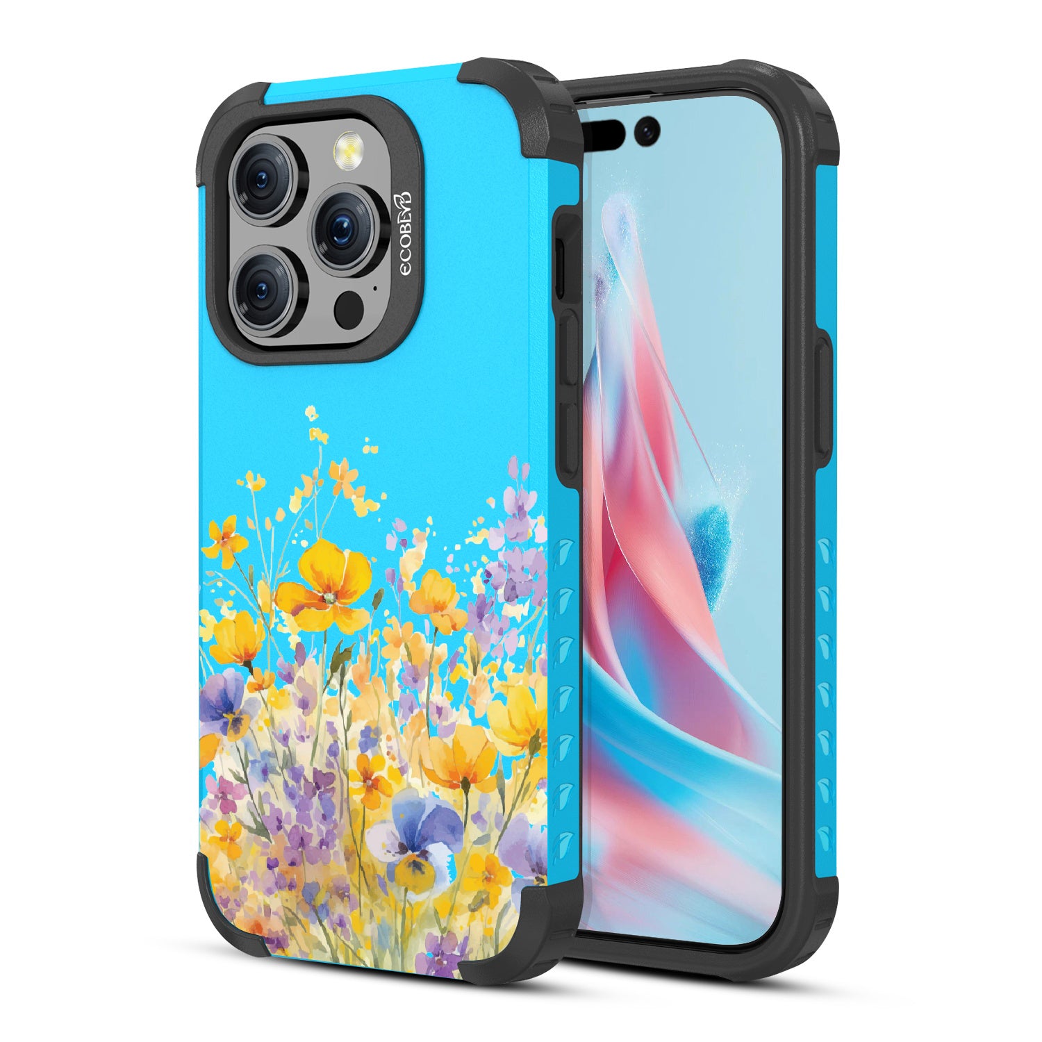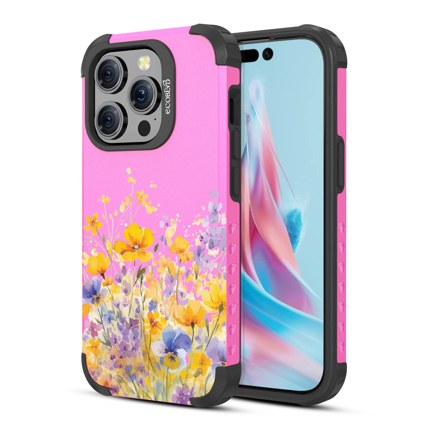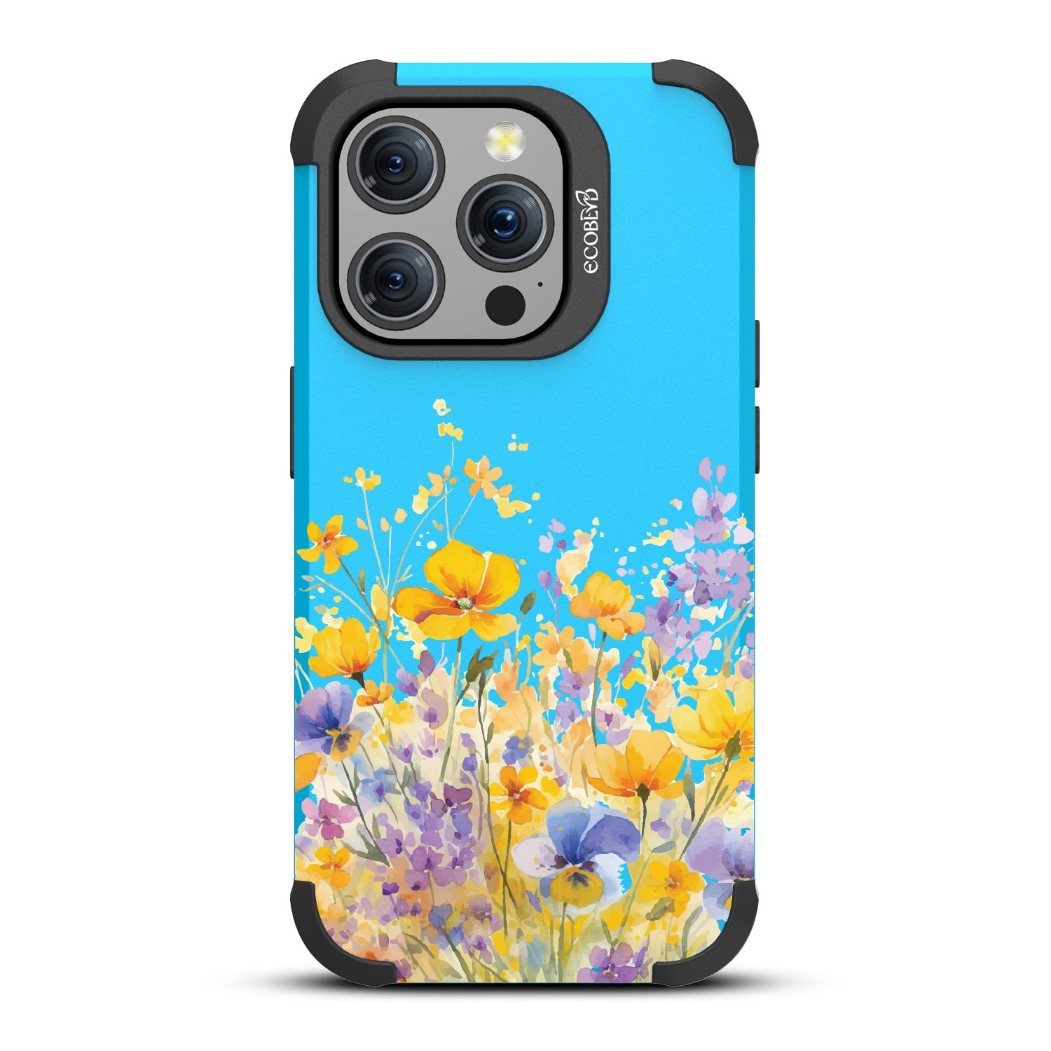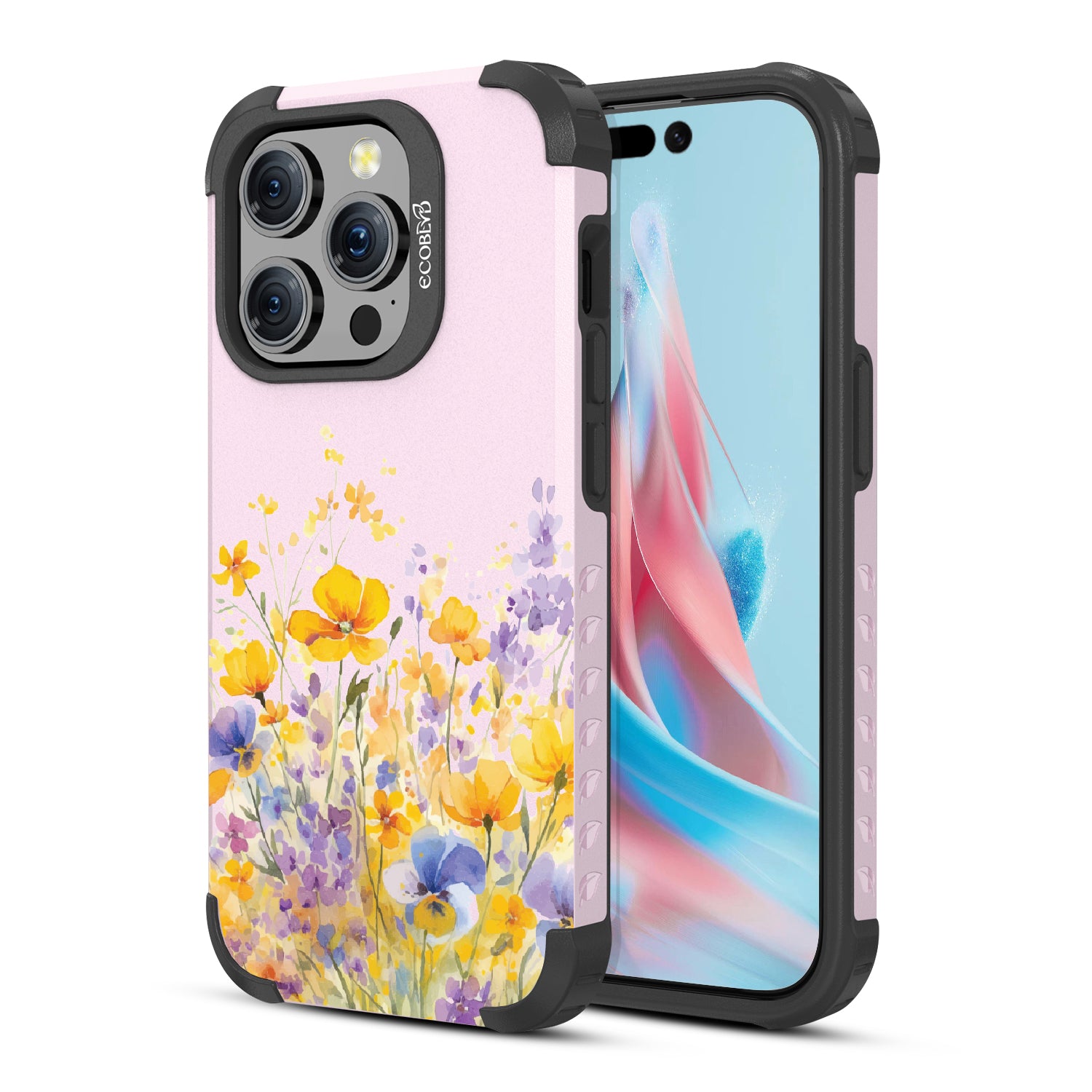 A moment in the light never looked so wild. The Meadowlight design on our Mojave rugged and compostable iPhone 15 Pro case lets soft florals run free in a watercolor wash of gold and lavender. A design that glows like a field at its most unfiltered.