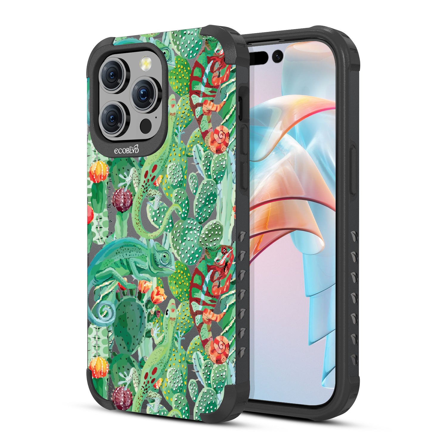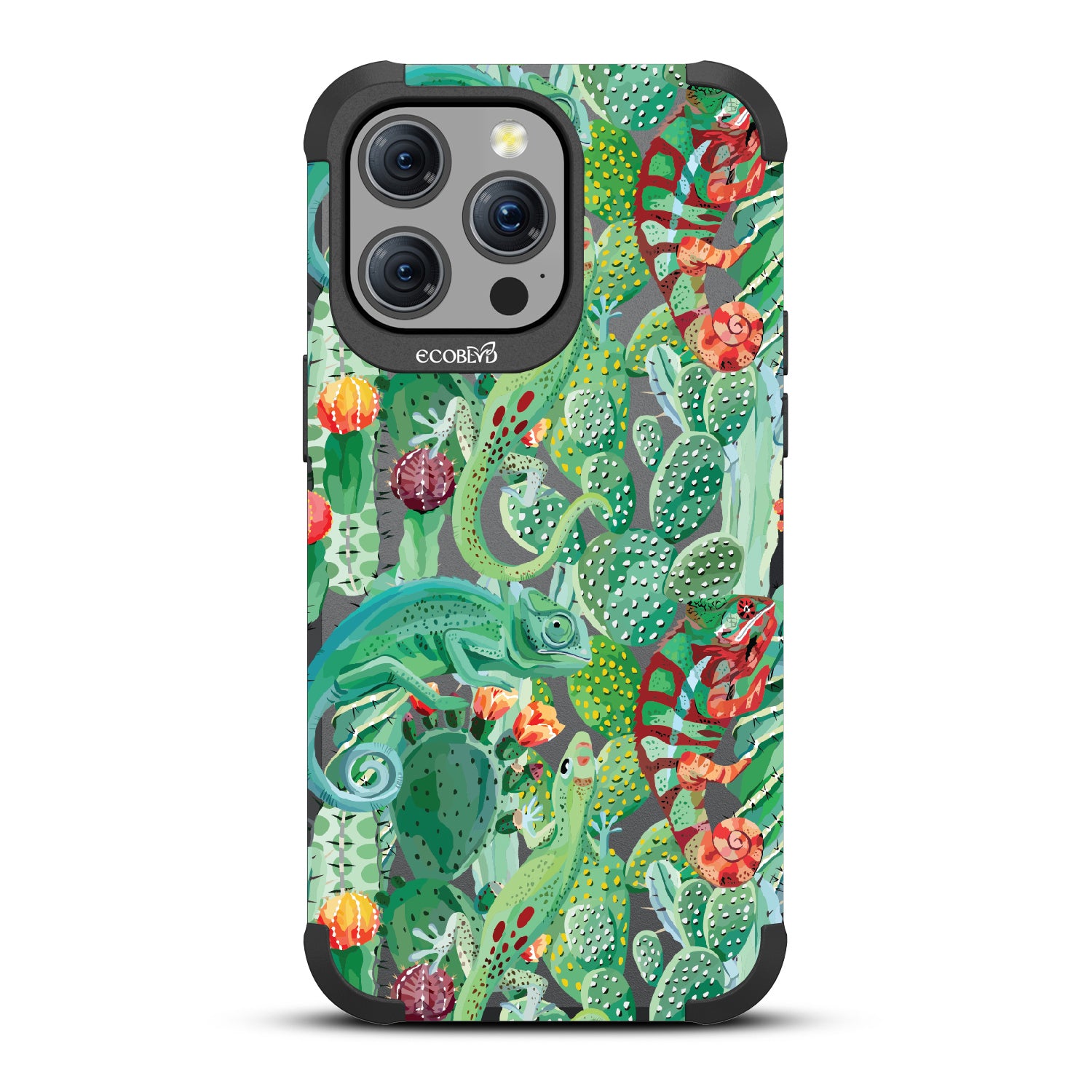 Embrace the captivating artistry of nature's hidden wonders with In Plain Sight design on our Mojave rugged and compostable iPhone 15 Pro Max MagSafe case. Immerse yourself in impeccable style and protection while supporting ocean conservation efforts, as you embark on a wild journey with this captivating phone case. This design shows that sometimes, the most beautiful things are hiding In Plain Sight with a playful nod to the chameleons' camouflage abilities and their effortless blend into the colorful cactus landscape on our Midnight Black colorway.