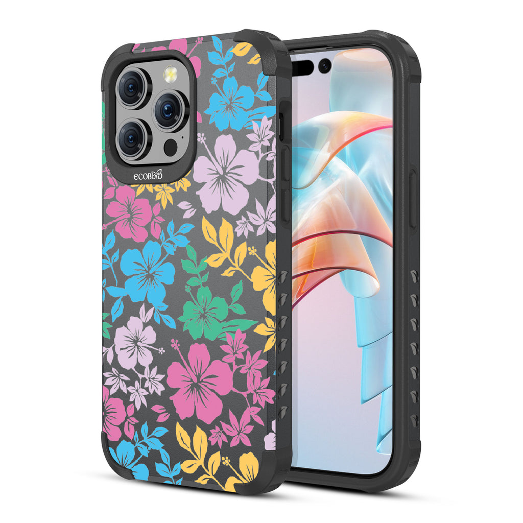 Experience the laid-back vibes of the tropics with our Lei'd Back design on our Mojave rugged and compostable iPhone 15 Pro Max MagSafe case, a colorful homage to the vibrant beauty of Hawaiian leis. his design showcases an array of tropical hibiscus flowers in yellow, pink, green, and blue, reminiscent of traditional lei arrangements. Enjoy the relaxed lifestyle of an island as you escape to the spirit of aloha. Available on our bold Midnight Black colorway.