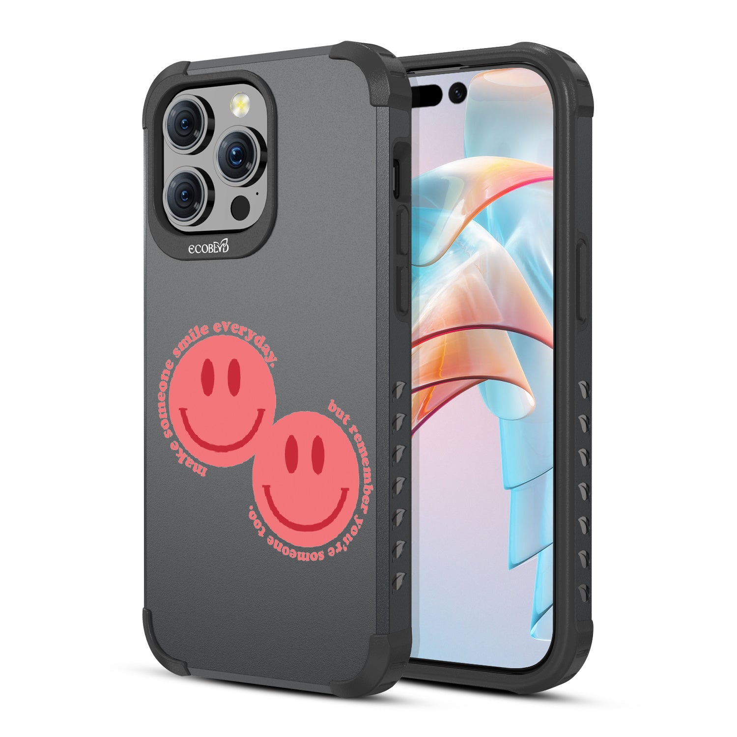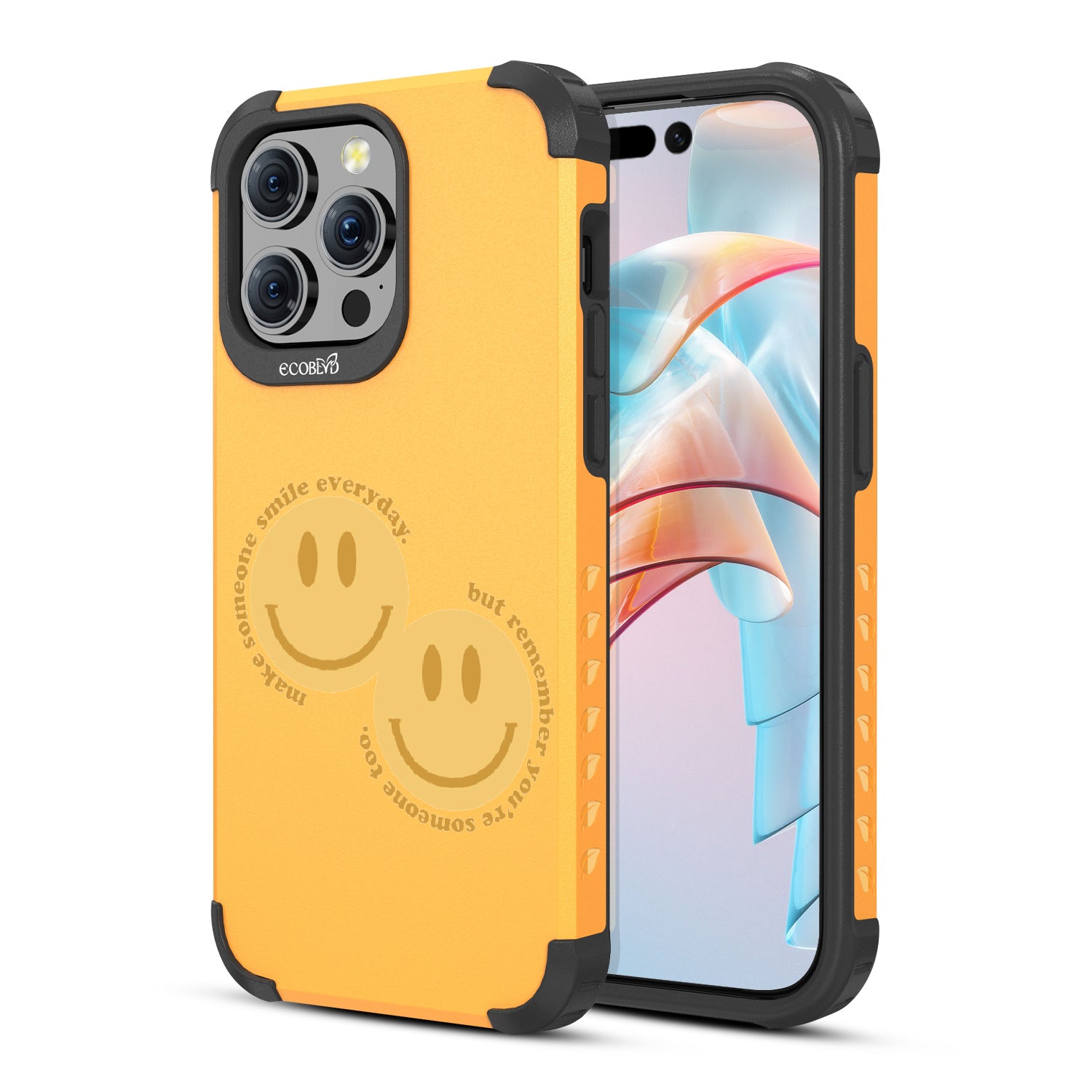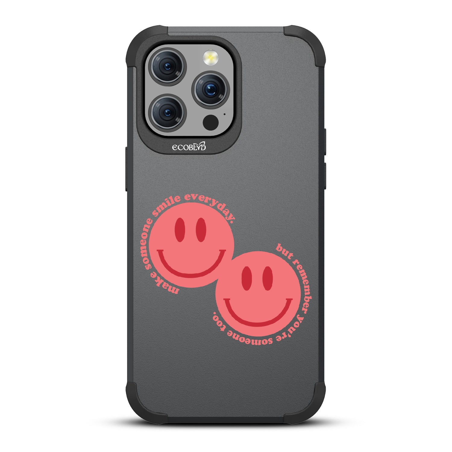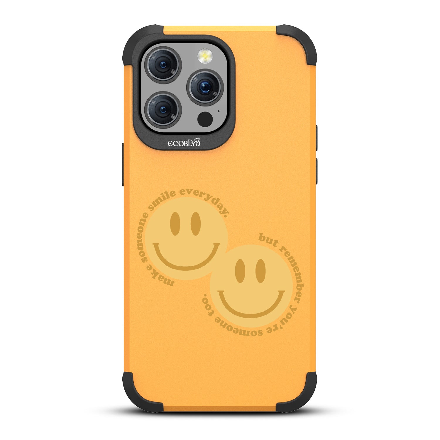Spread happiness with the Make Someone Smile design on our Mojave rugged and compostable iPhone 15 Pro Max MagSafe case. Featuring two cheerful smiley faces, this design prompts you to be a source of joy for others. While you make someone else smile, recognize that you too are deserving of moments filled with happiness.