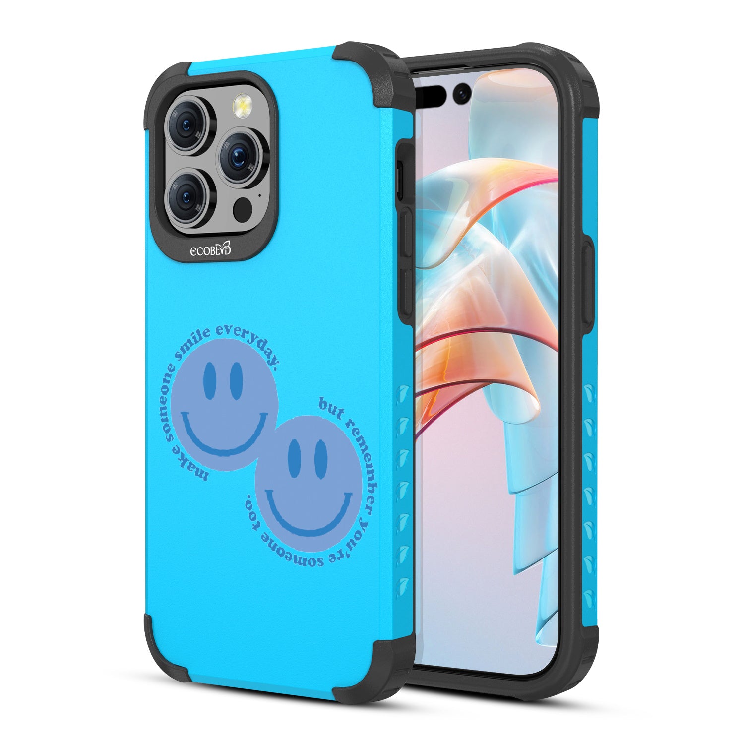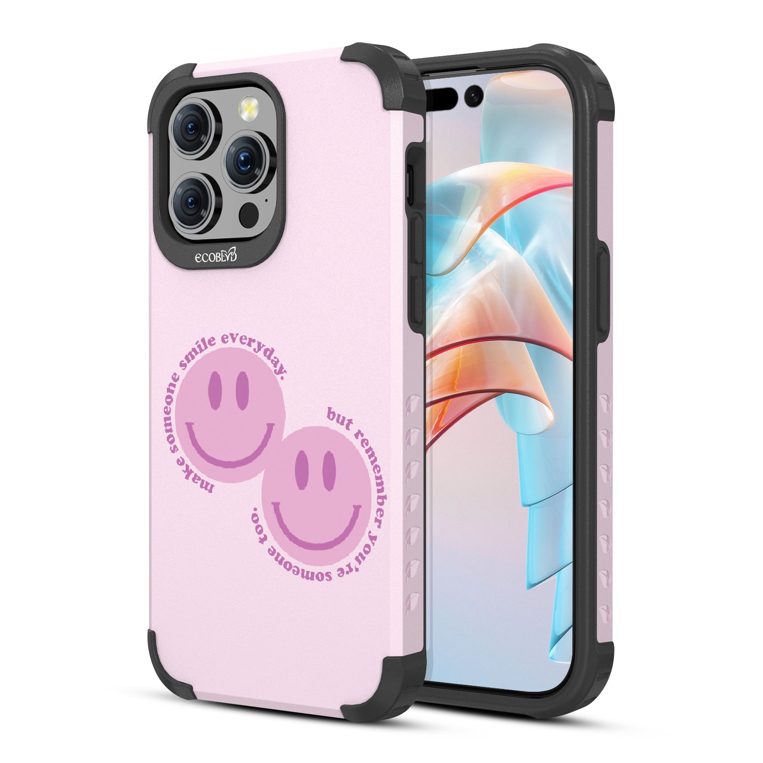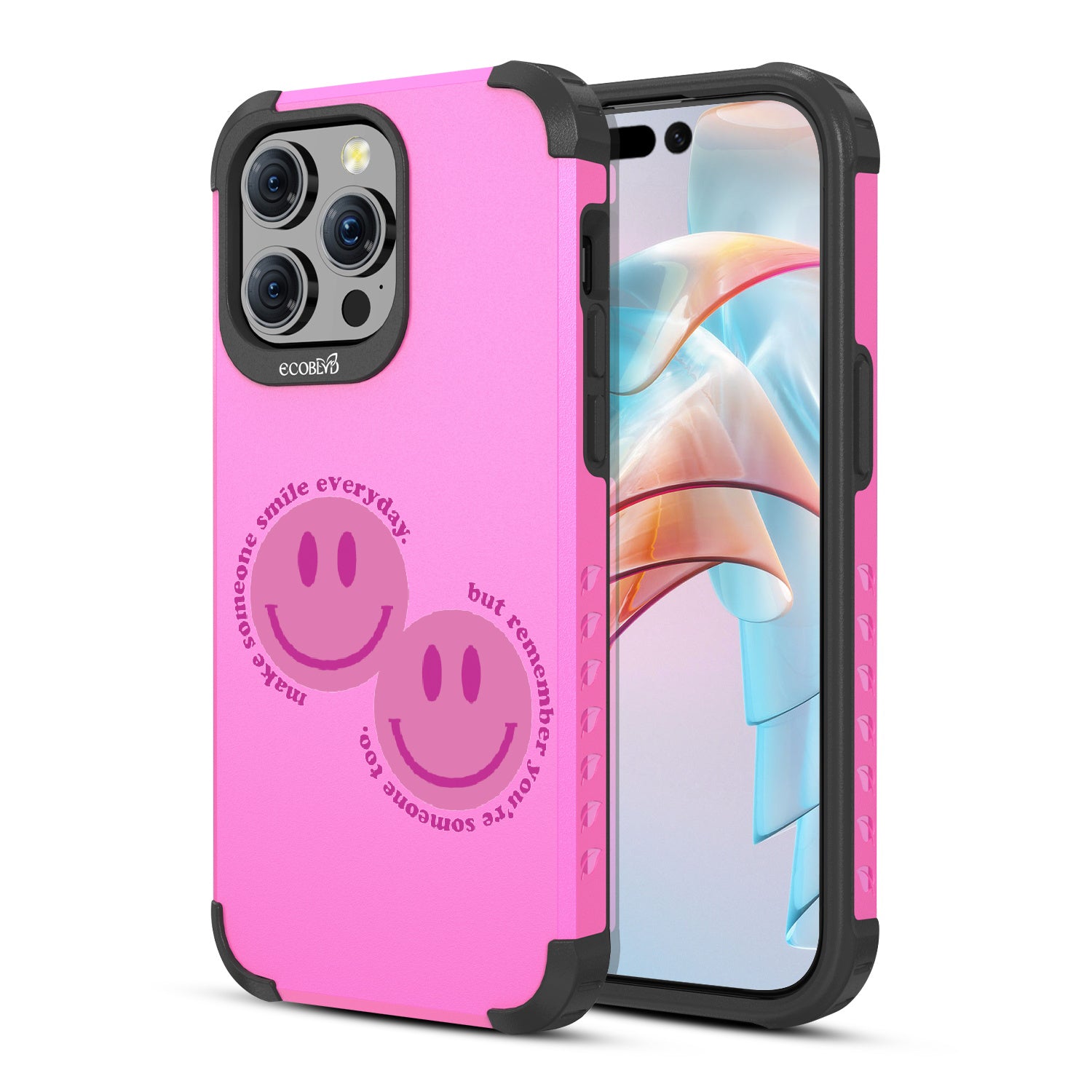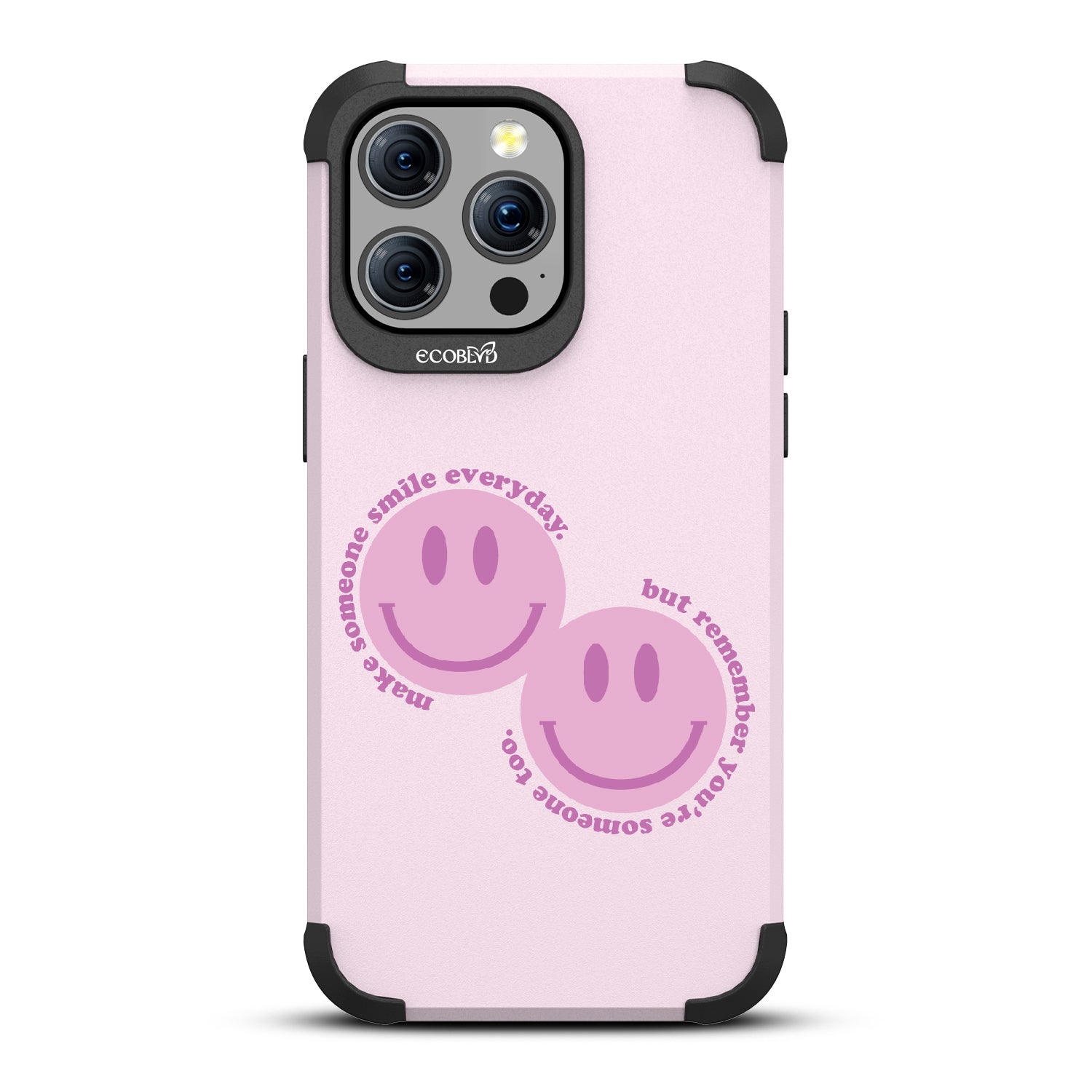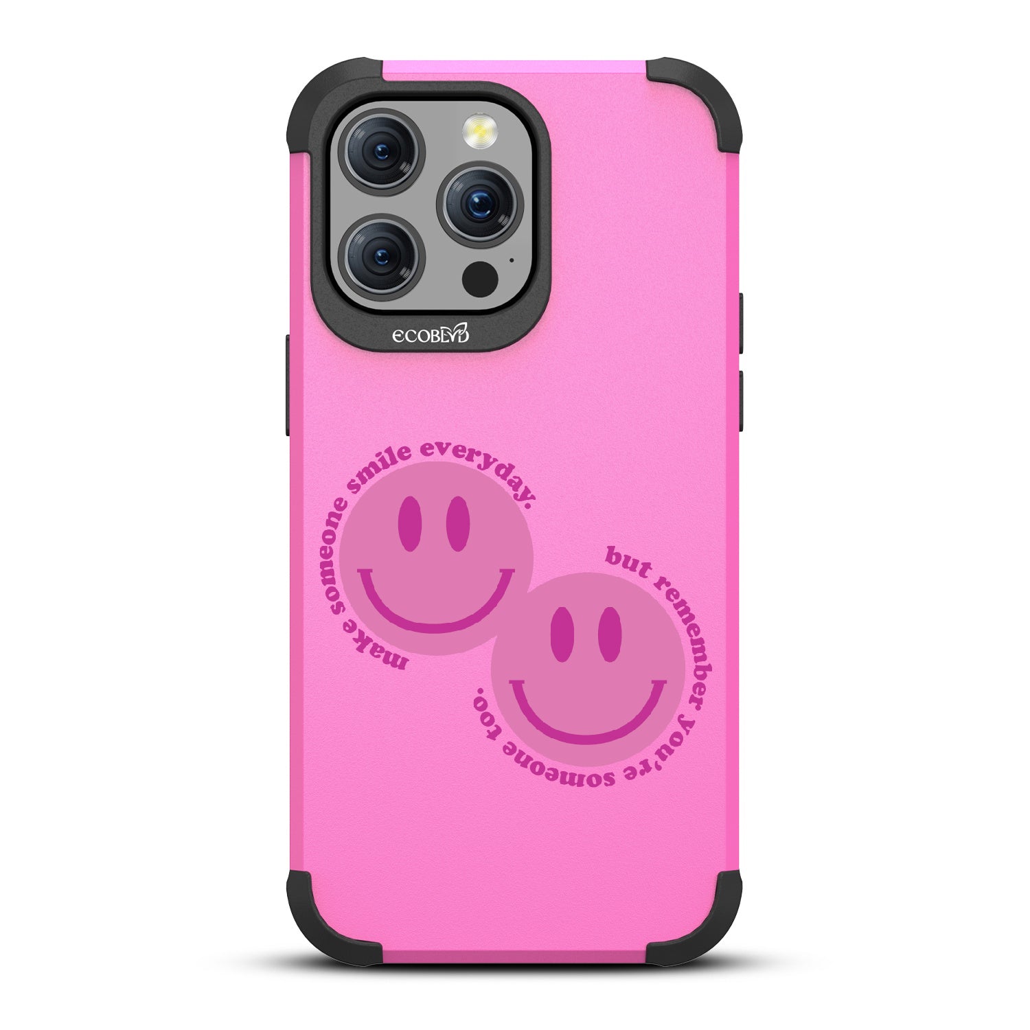 Spread happiness with the Make Someone Smile design on our Mojave rugged and compostable iPhone 15 Pro Max MagSafe case. Featuring two cheerful smiley faces, this design prompts you to be a source of joy for others. While you make someone else smile, recognize that you too are deserving of moments filled with happiness.